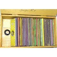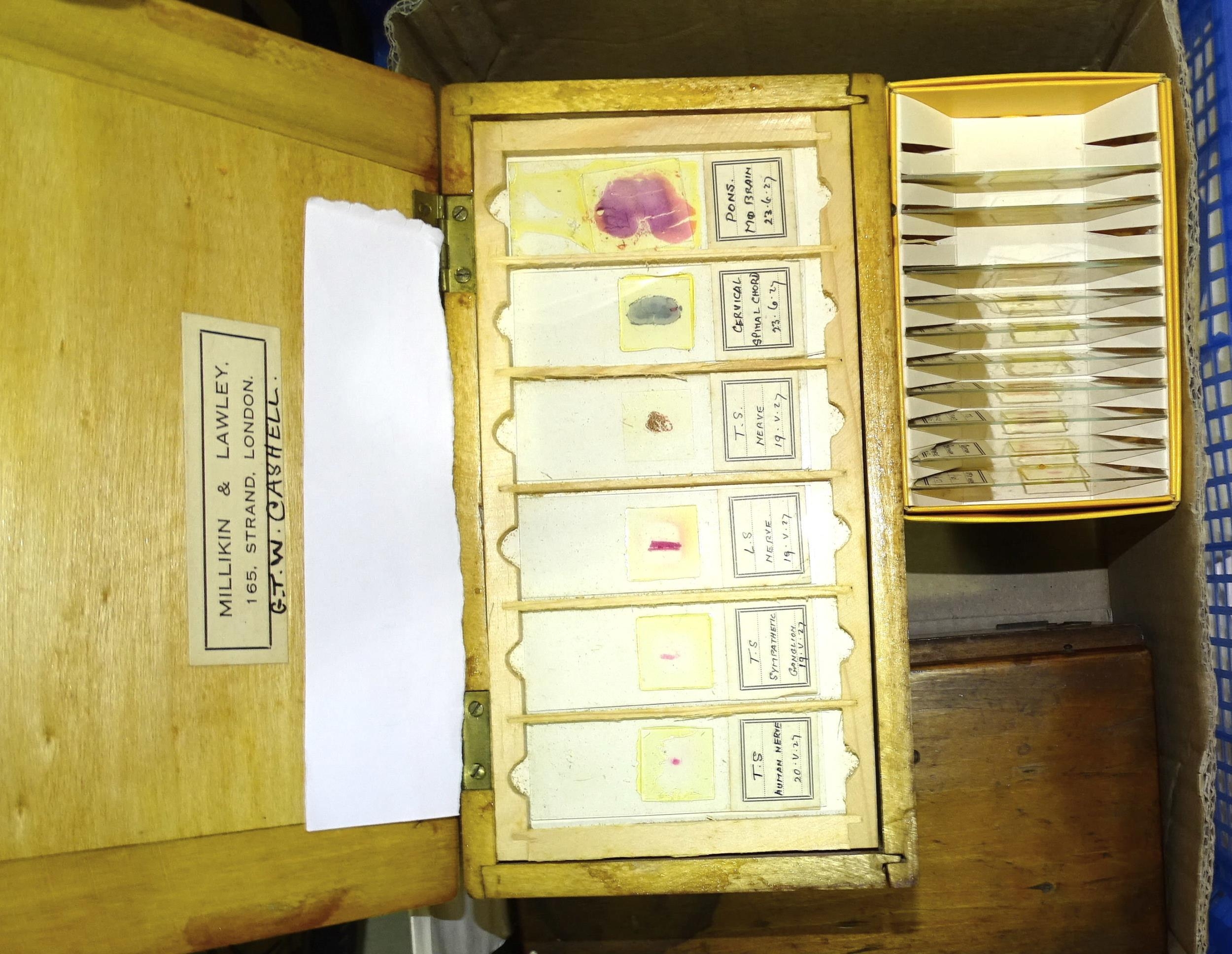 A collection of approximately three hundred 20th century microscope slides, mainly in three fitted wooden boxes.