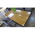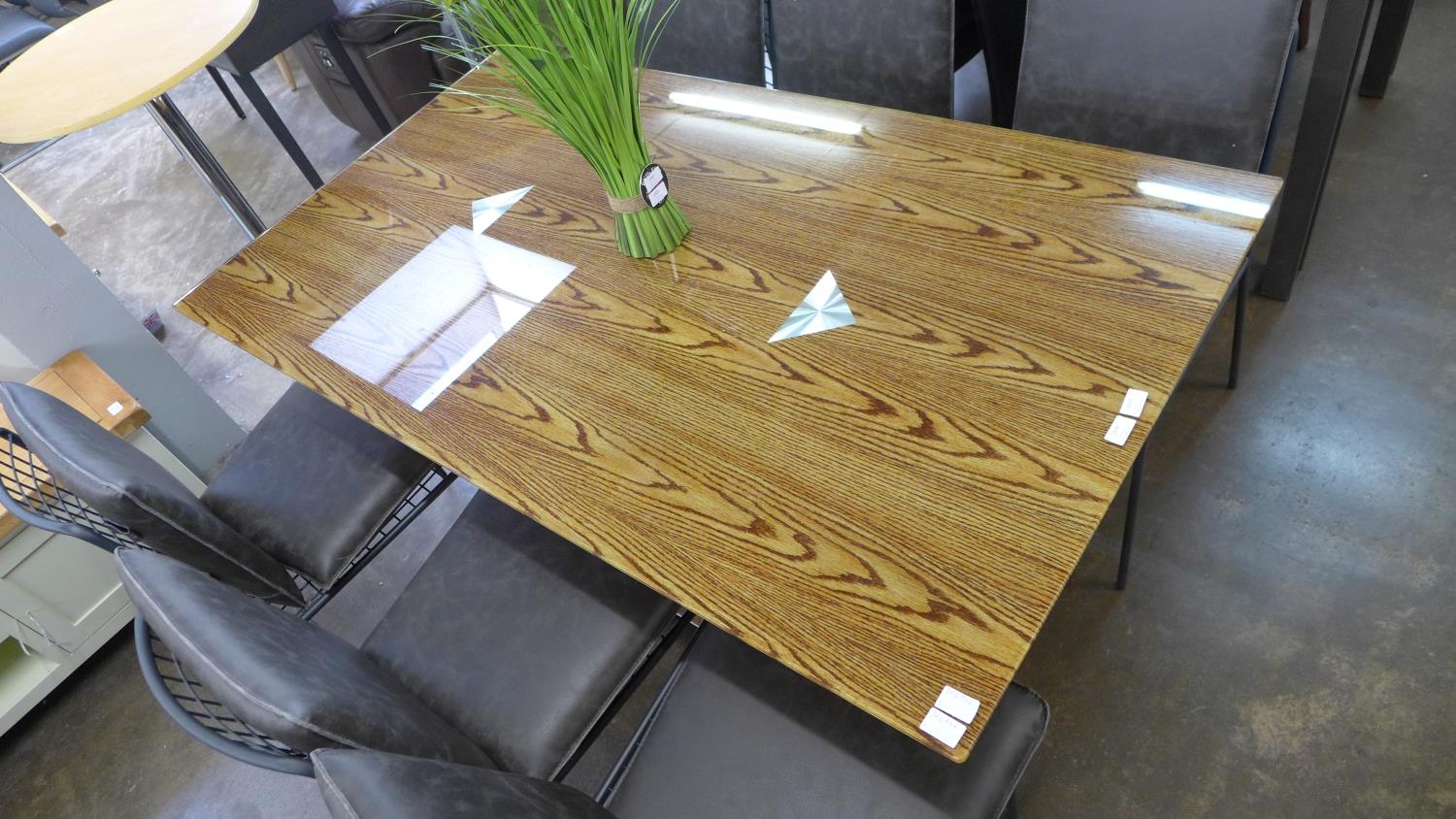 A wood effect glass top dining table with chrome base