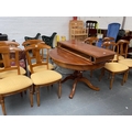 An extending circular dining table with eight chairs and two extra leaves