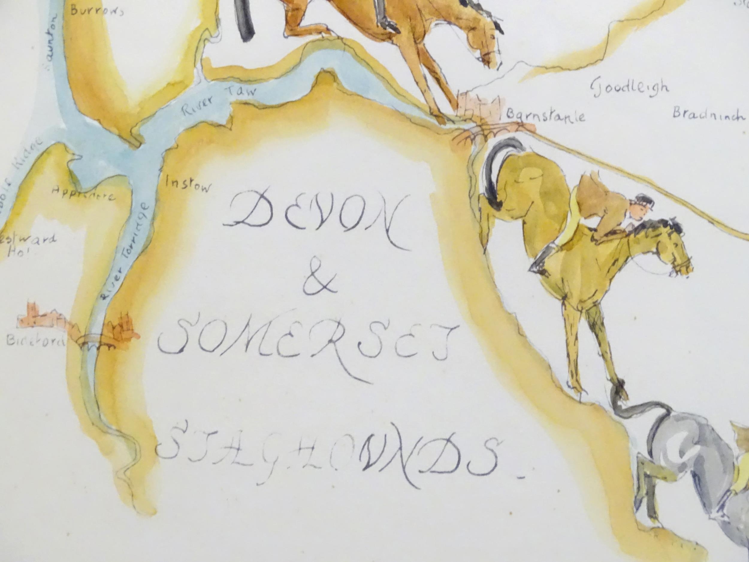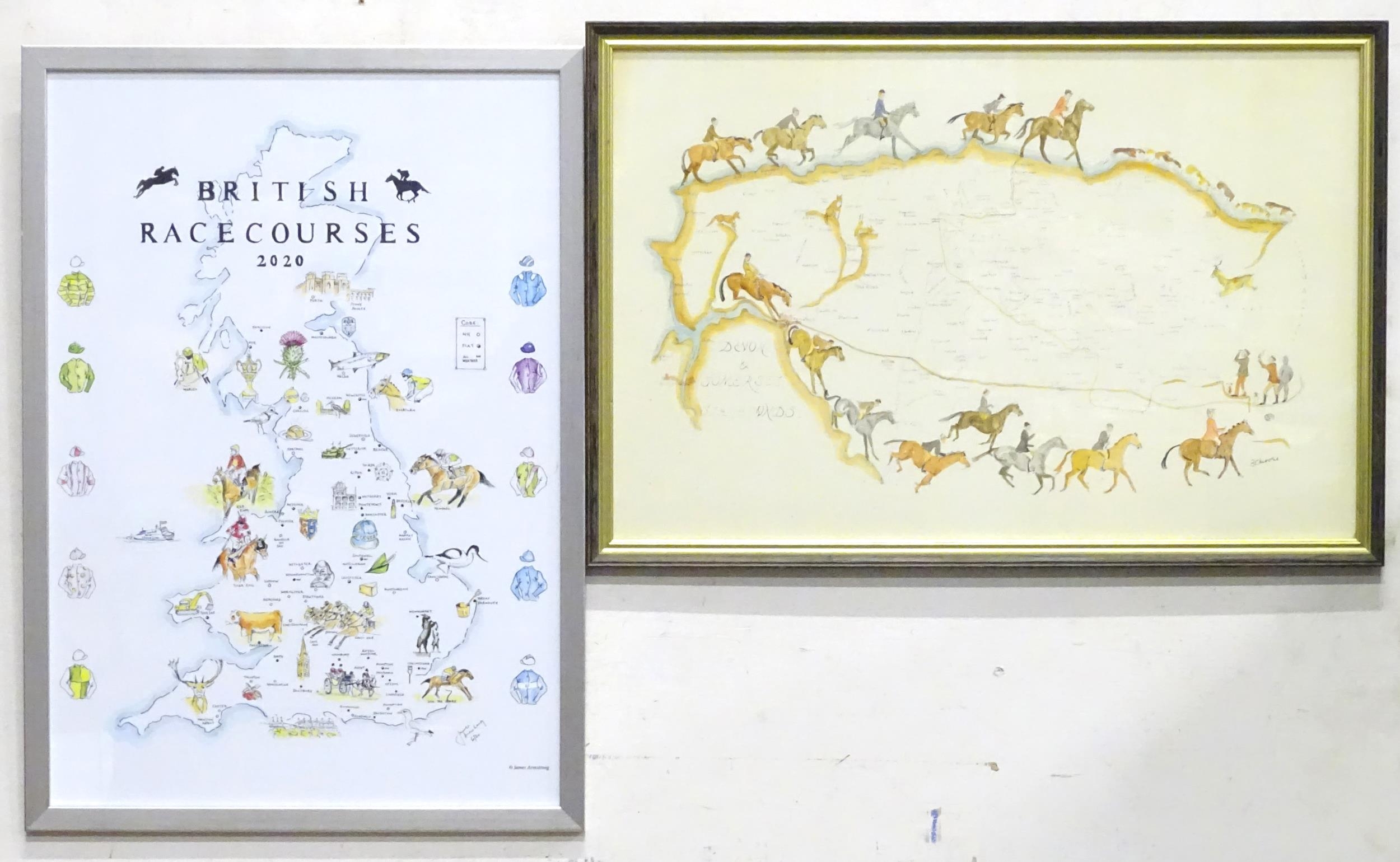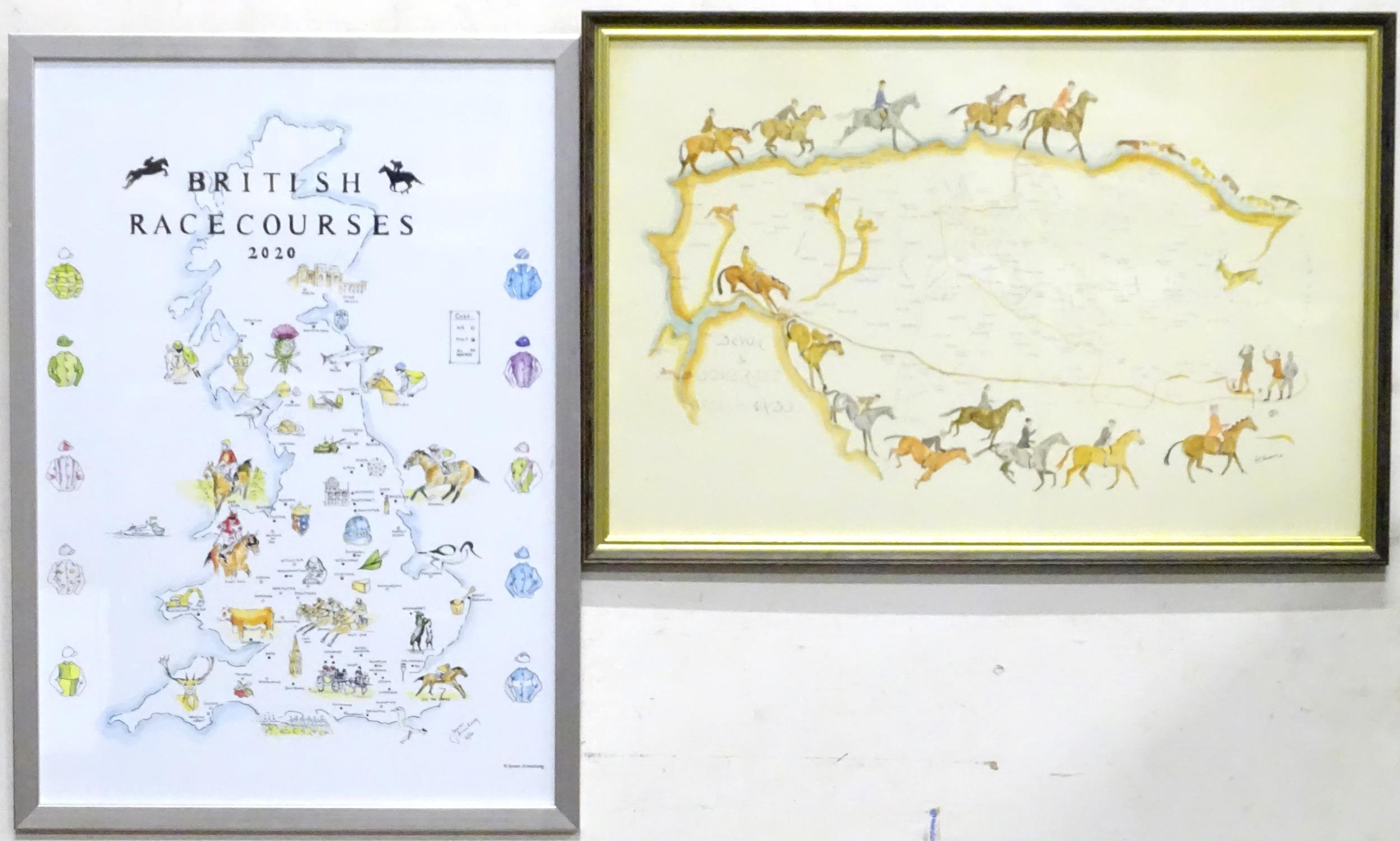 Two prints comprising a map of British Racecourses after James Armstrong, and a hunting print depicting a map titled Devon & Somerset Staghounds. Largest approx. 15 1/2" x 23 1/4" (2)