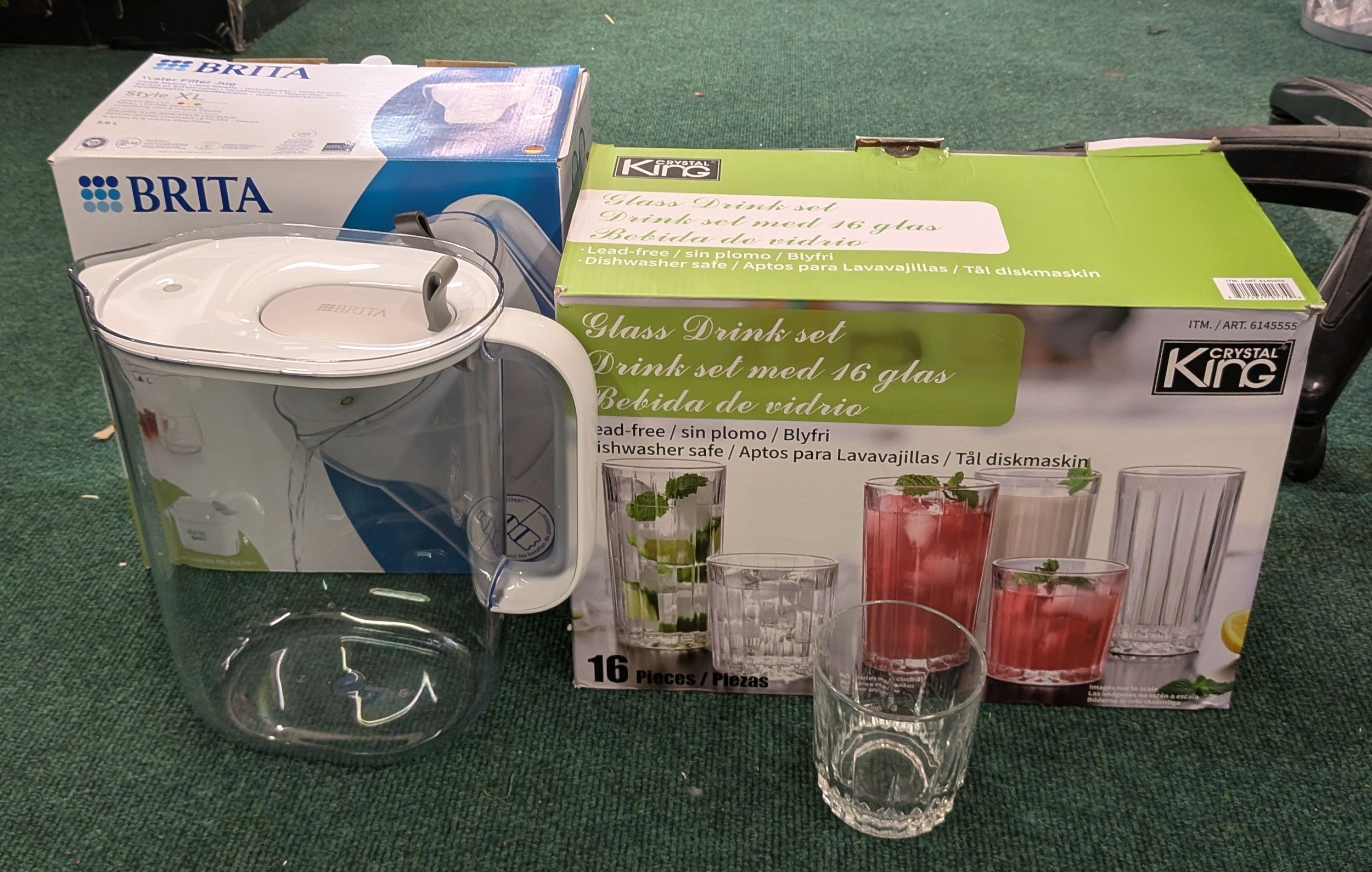 BOXED BRITA XL 3.6L WATER FILTER JUG TOGETHER WITH A BOXED SET OF 8 SMALL GLASS TUMBLERS