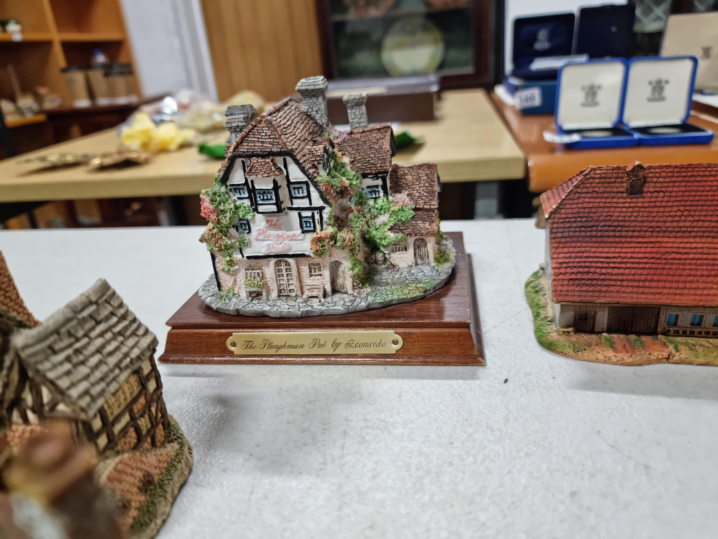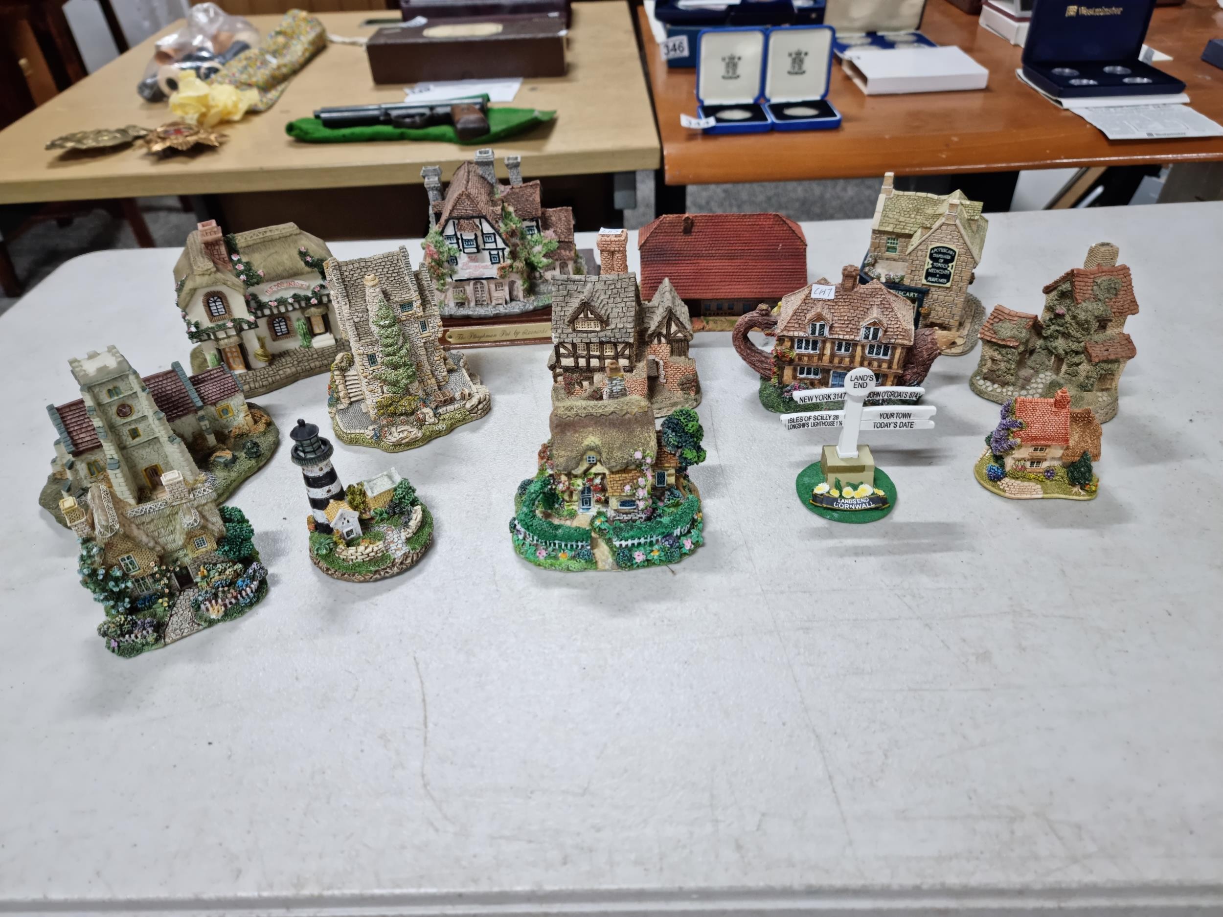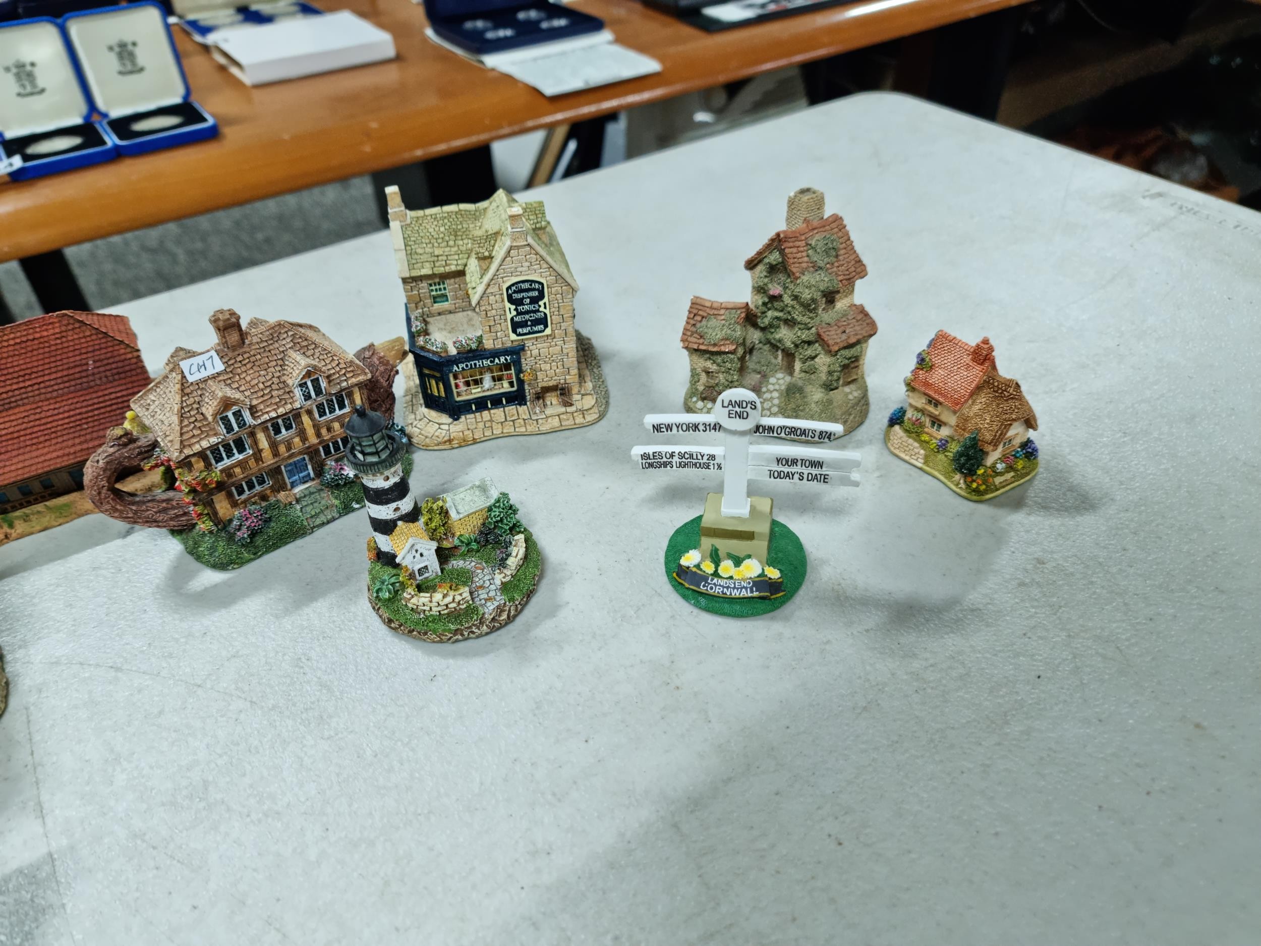 Collection of 14x very well detailed cottages and buildings, inc Lilliput lane and David Winters, inc Apothecary, The Bakehouse, Ivy Cottage etc also includes a Landsend gift sign all in good order and well detailed. largest piece measures 12cm high