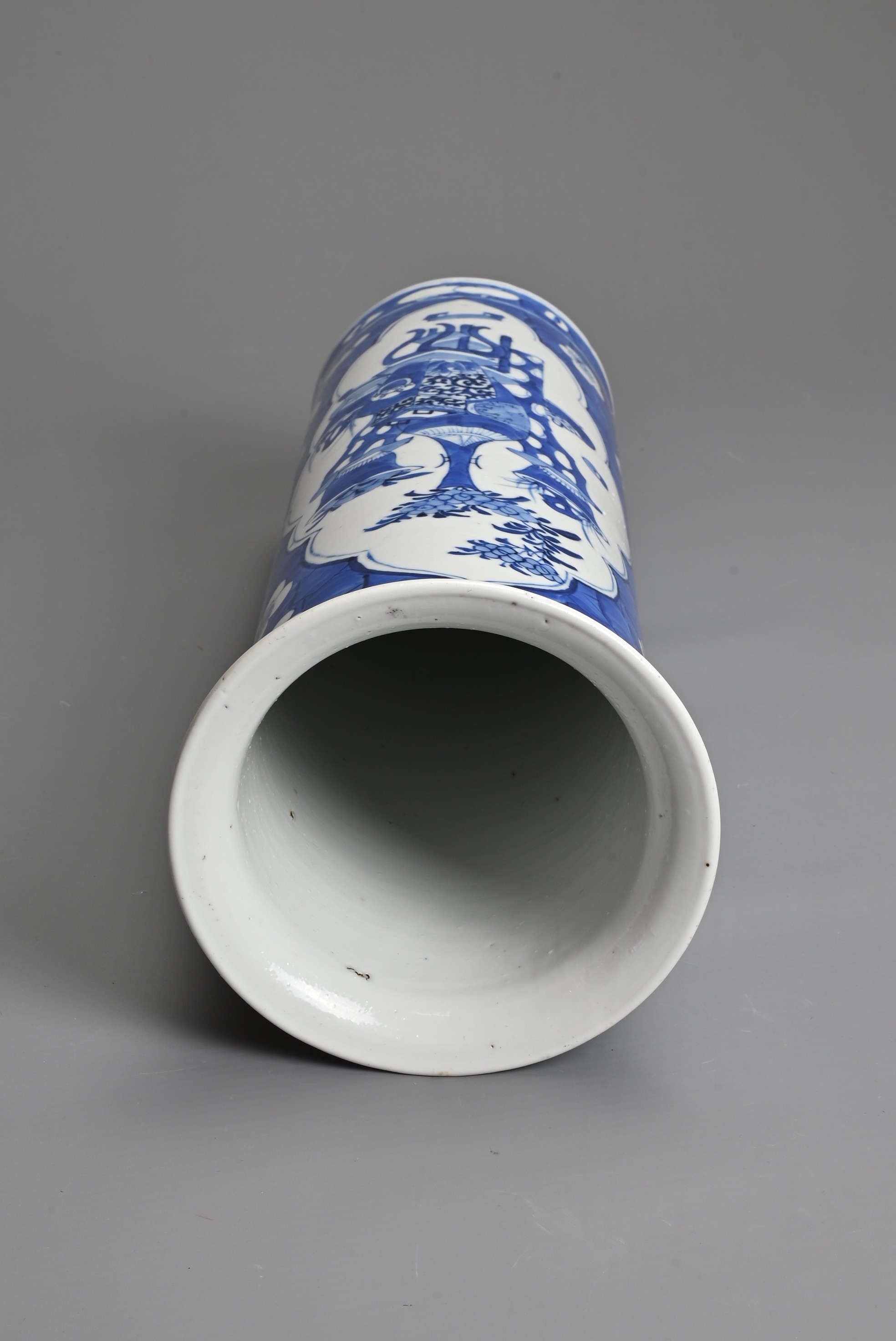 A CHINESE BLUE AND WHITE PORCELAIN SLEEVE VASE, 19TH CENTURY. Of tall cylindrical form with everted rim decorated with treasured items and floral displays, on a prunus ground. Four character mark of Kangxi to base. 35.5cm tall