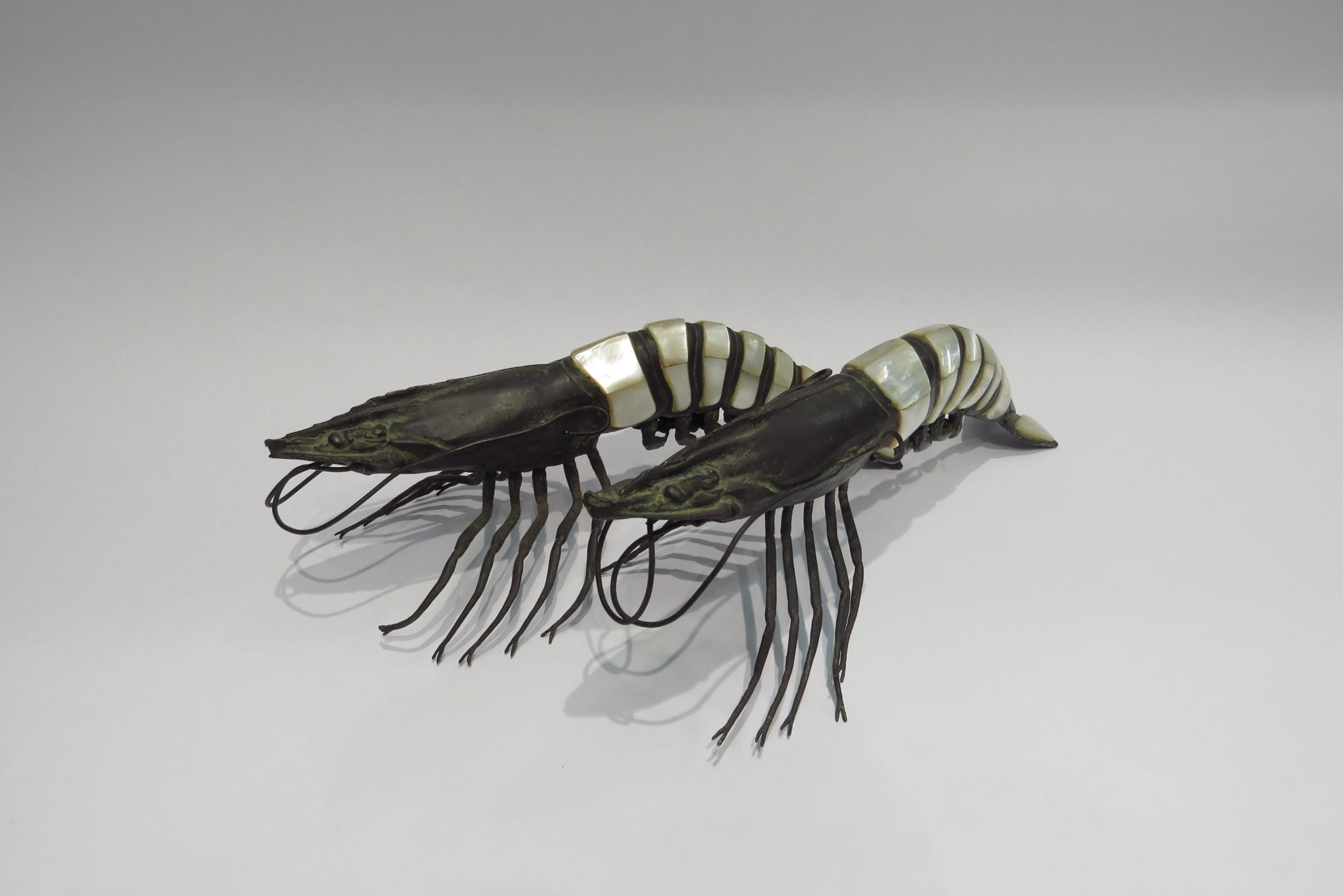 A pair of 19th Century mother-of-pearl and bronze knife rests of prawn form, 26cm long (C)