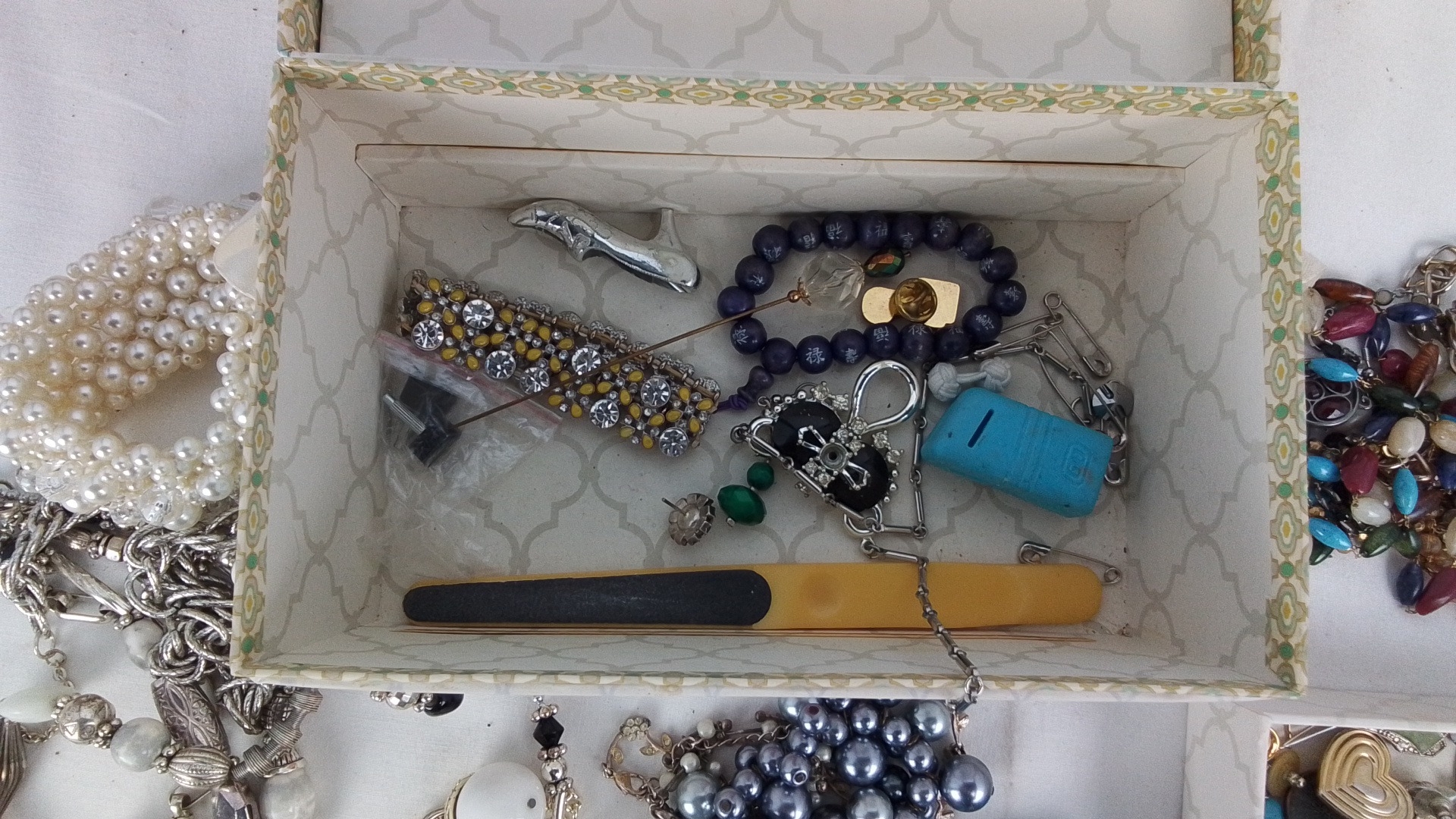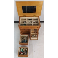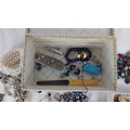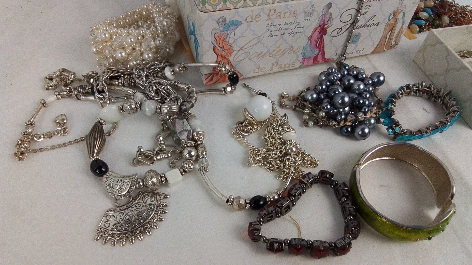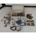Collection of costume jewellery and accessories, including faux pearl necklaces, silver-tone and beaded necklaces, bracelets, and a compartmented tray of assorted earrings, pins and brooches, housed in decorative boxes.