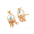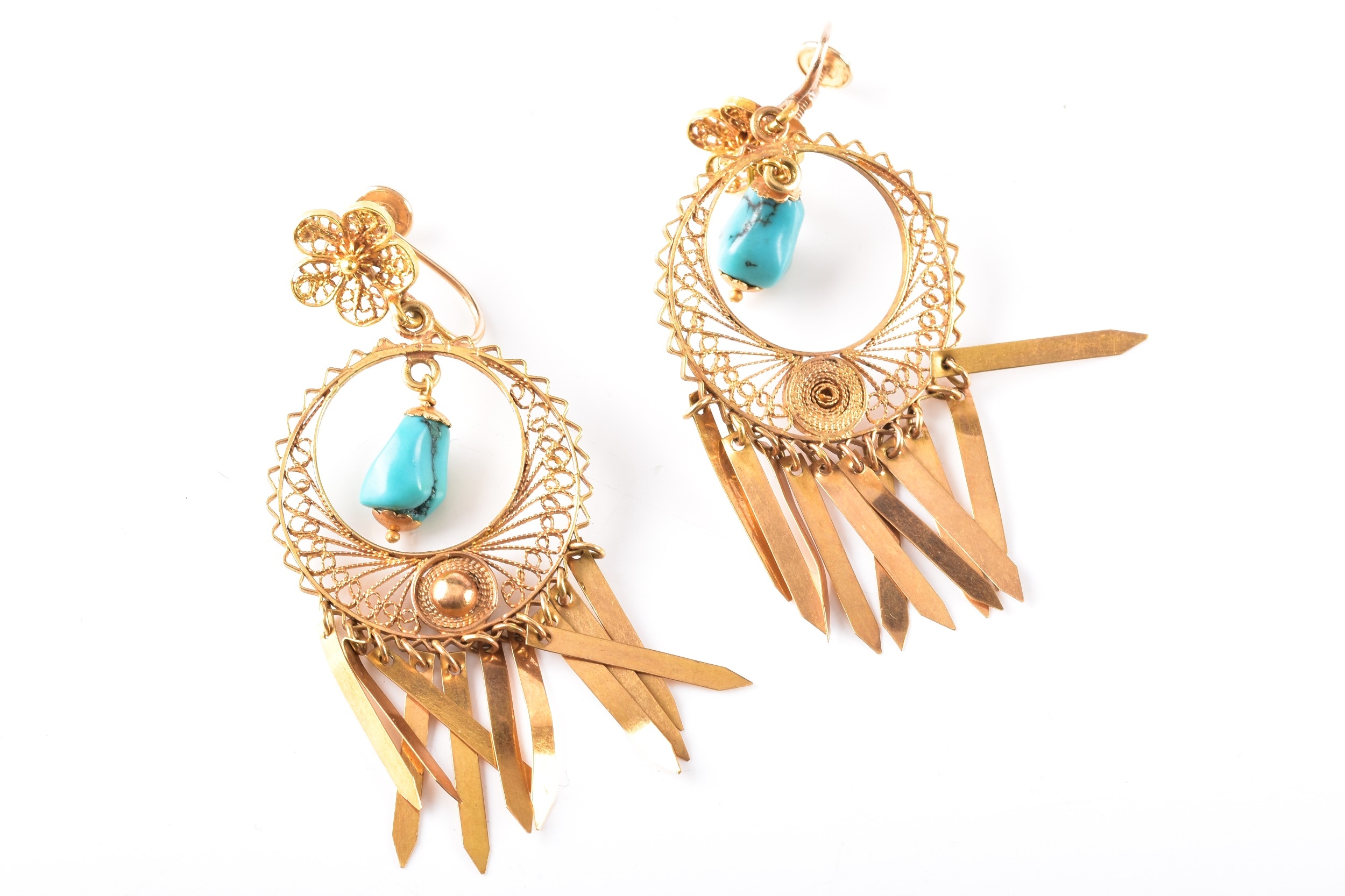 A pair of 14ct turquoise drop earrings, each with a floral filigree surmount suspending a circular openwork panel, centred with a turquoise bead and with applied bead detail, the lower section with articulated fringe drops, to screw-back fittings, 5.5 cm long.