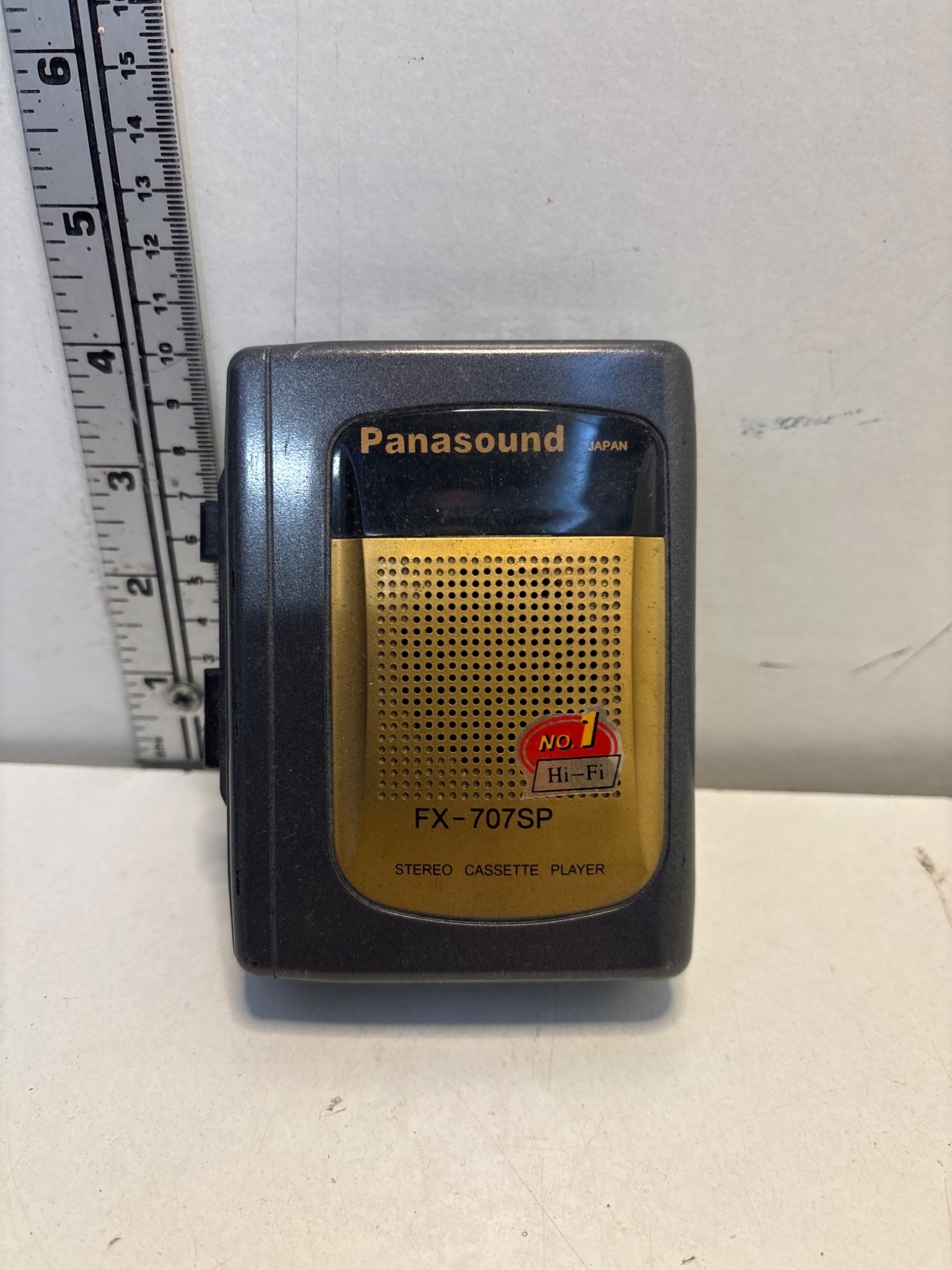 Panasonic FX-707SP stereo cassette player featuring gold-tone details, capable of playing cassettes with Hi-Fi audio quality. It is a handheld model.