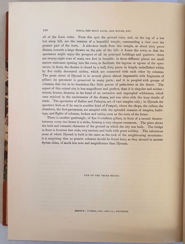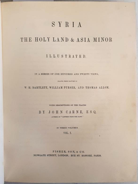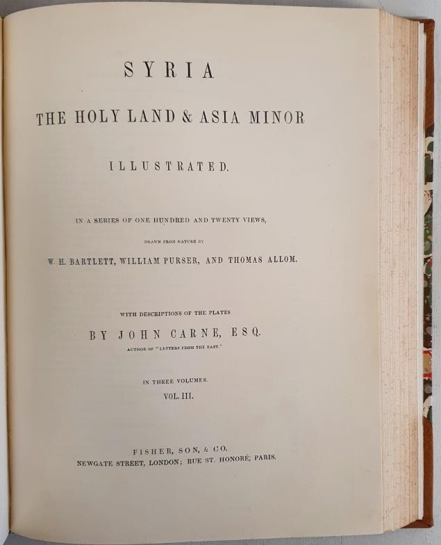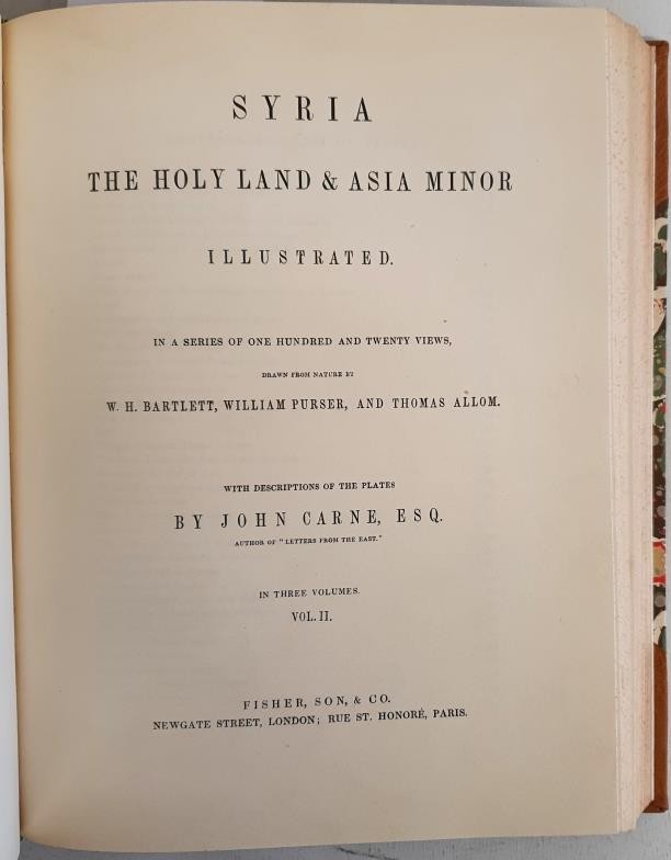 W. H. Bartlett, W. Porter & T. Allom. Syria, The Holy Land and Asia Minor. 1842. 3 volumes in 1. 120 tissue guarded colour plates. Quarto Fine half calf, marbled boards, gilt spine. Mint.