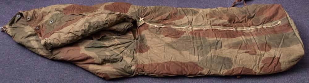 A WWII period Dennison sleeping bag by Whitleys: dated 1945, in dark green and brown camouflage, stamped as per title