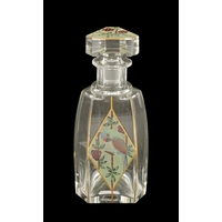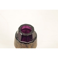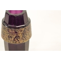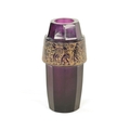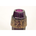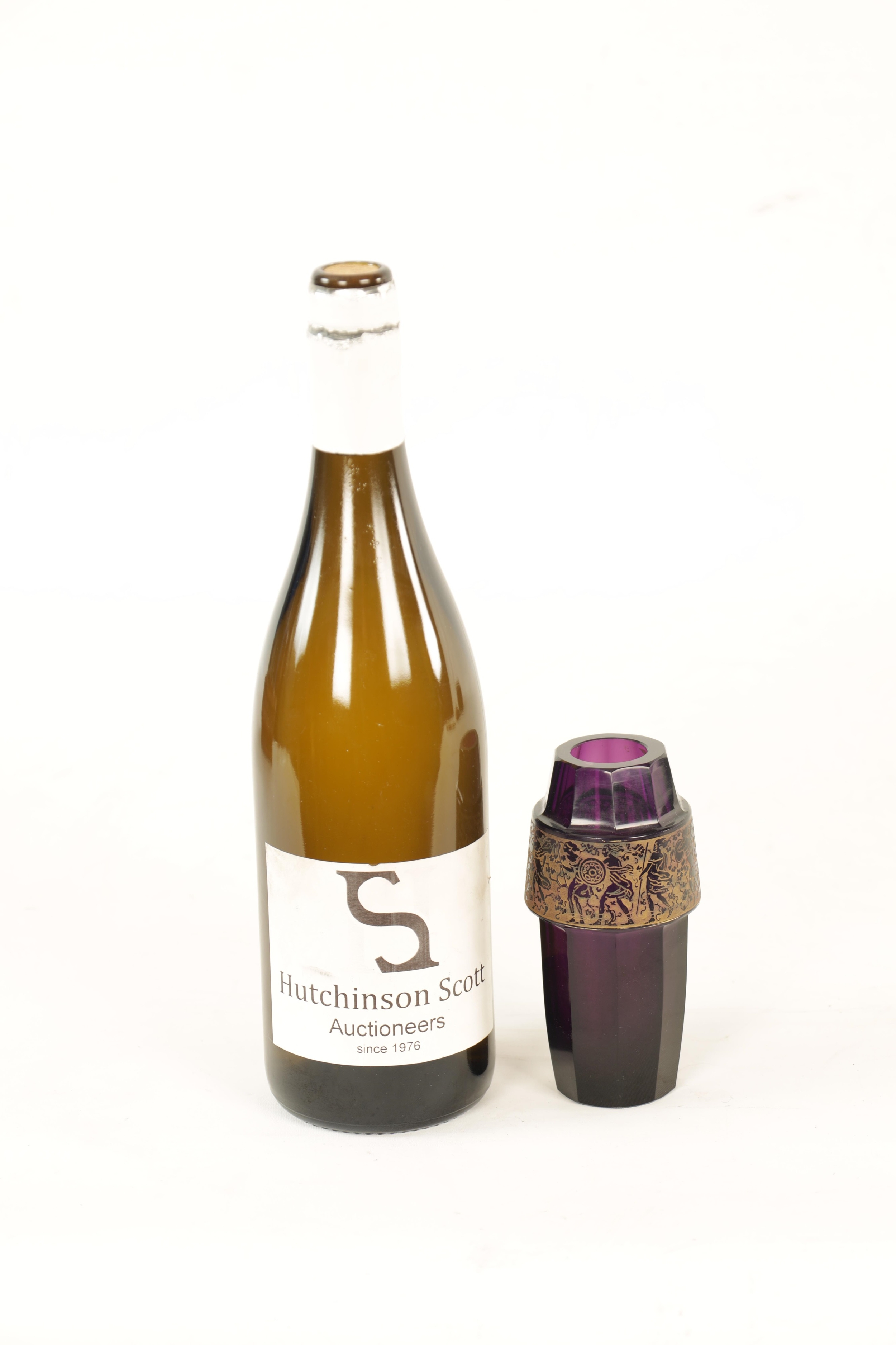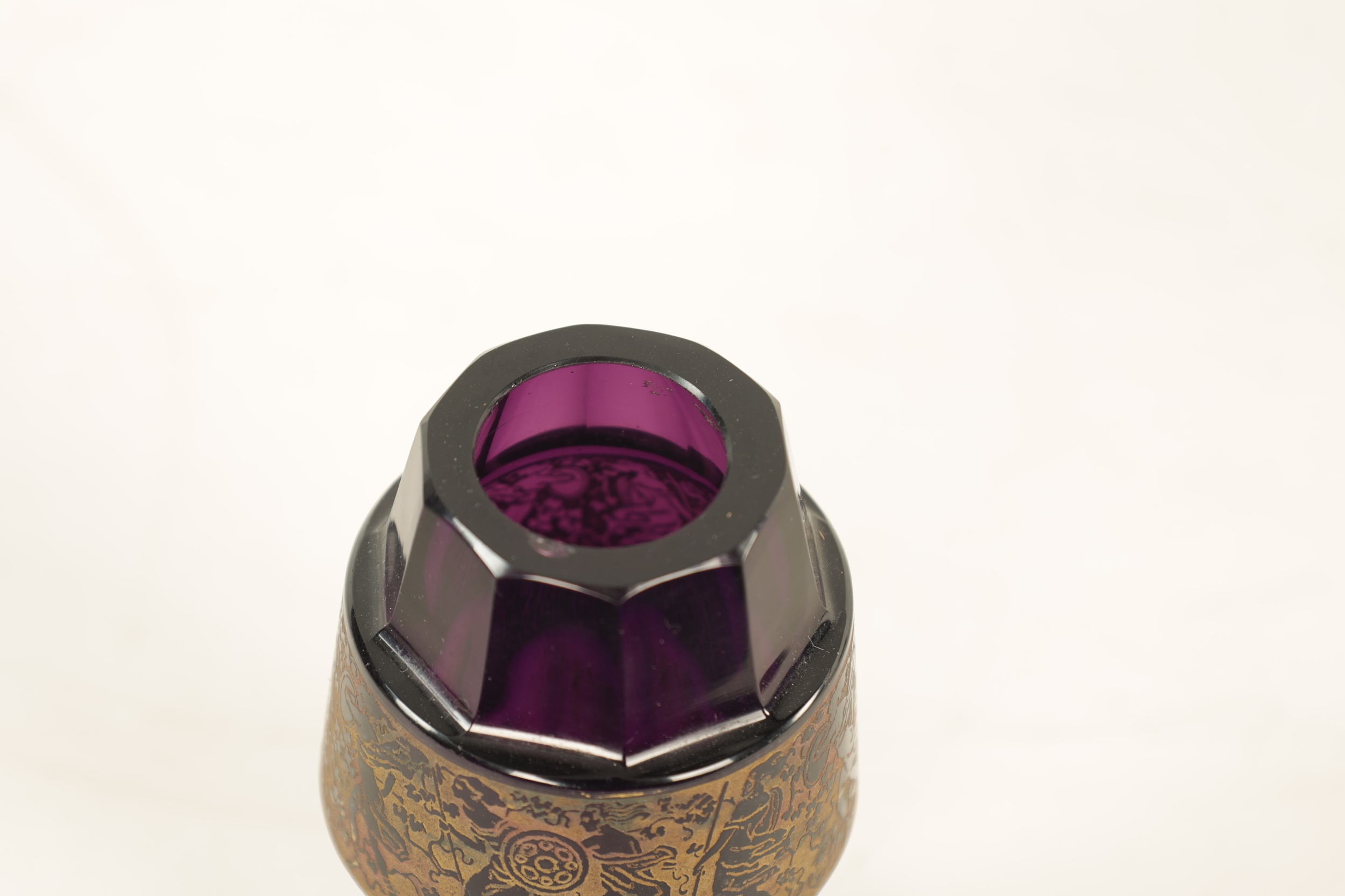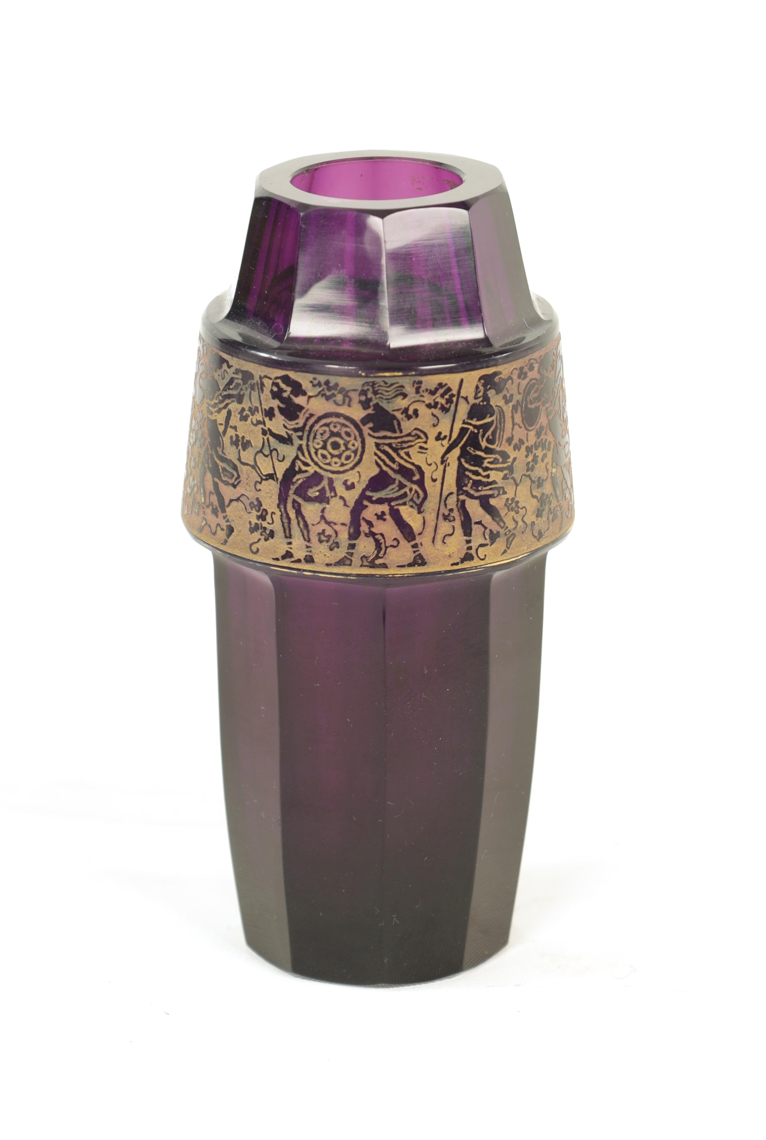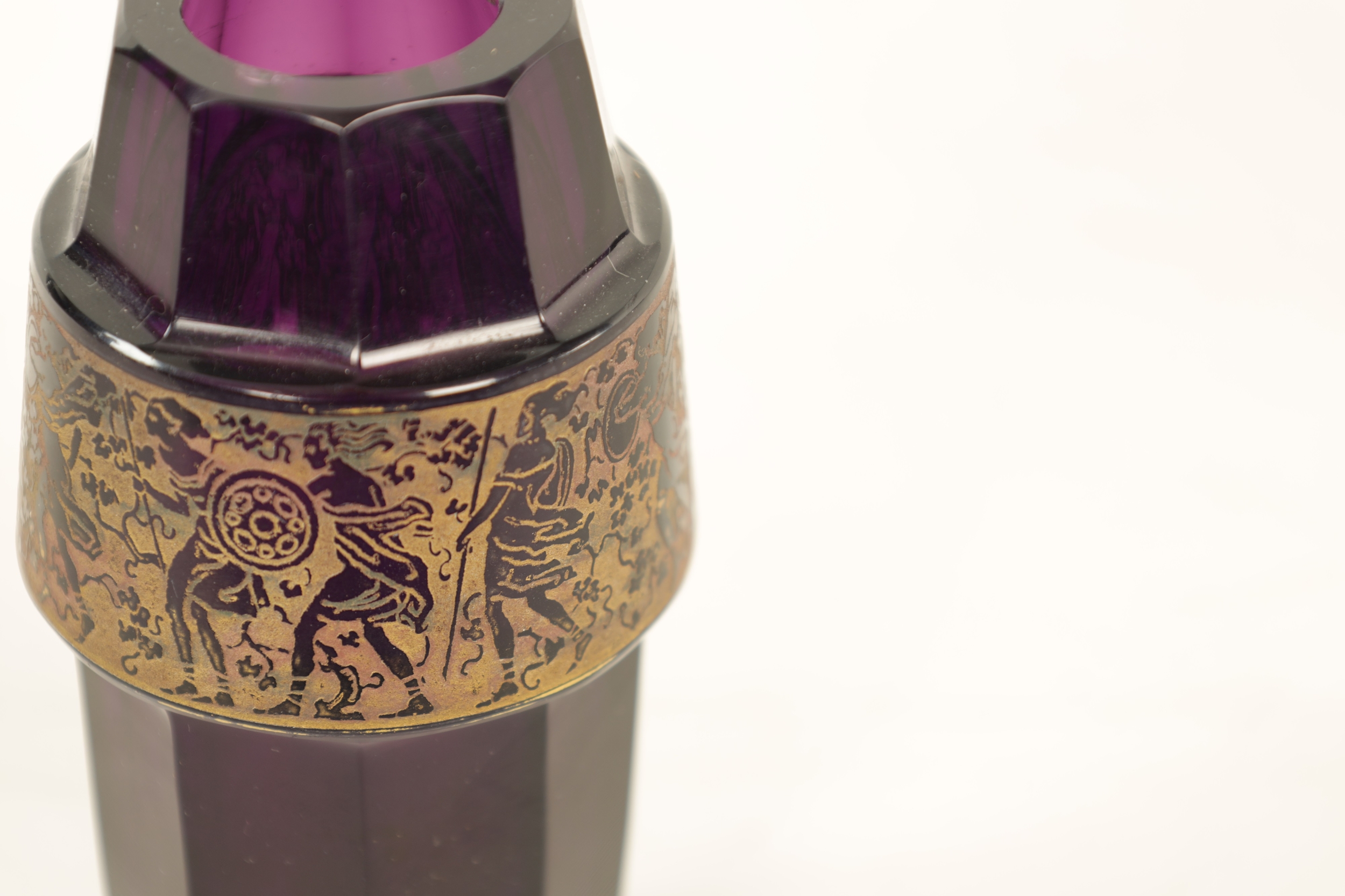 AN EARLY 20TH-CENTURY PURPLE GLASS VIENNA SECESSIONIST VASE IN THE MOSER STYLE of faceted shaped form having a gilt band depicting warriors. (12.5cm high)