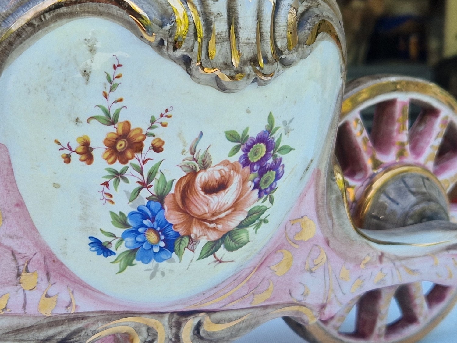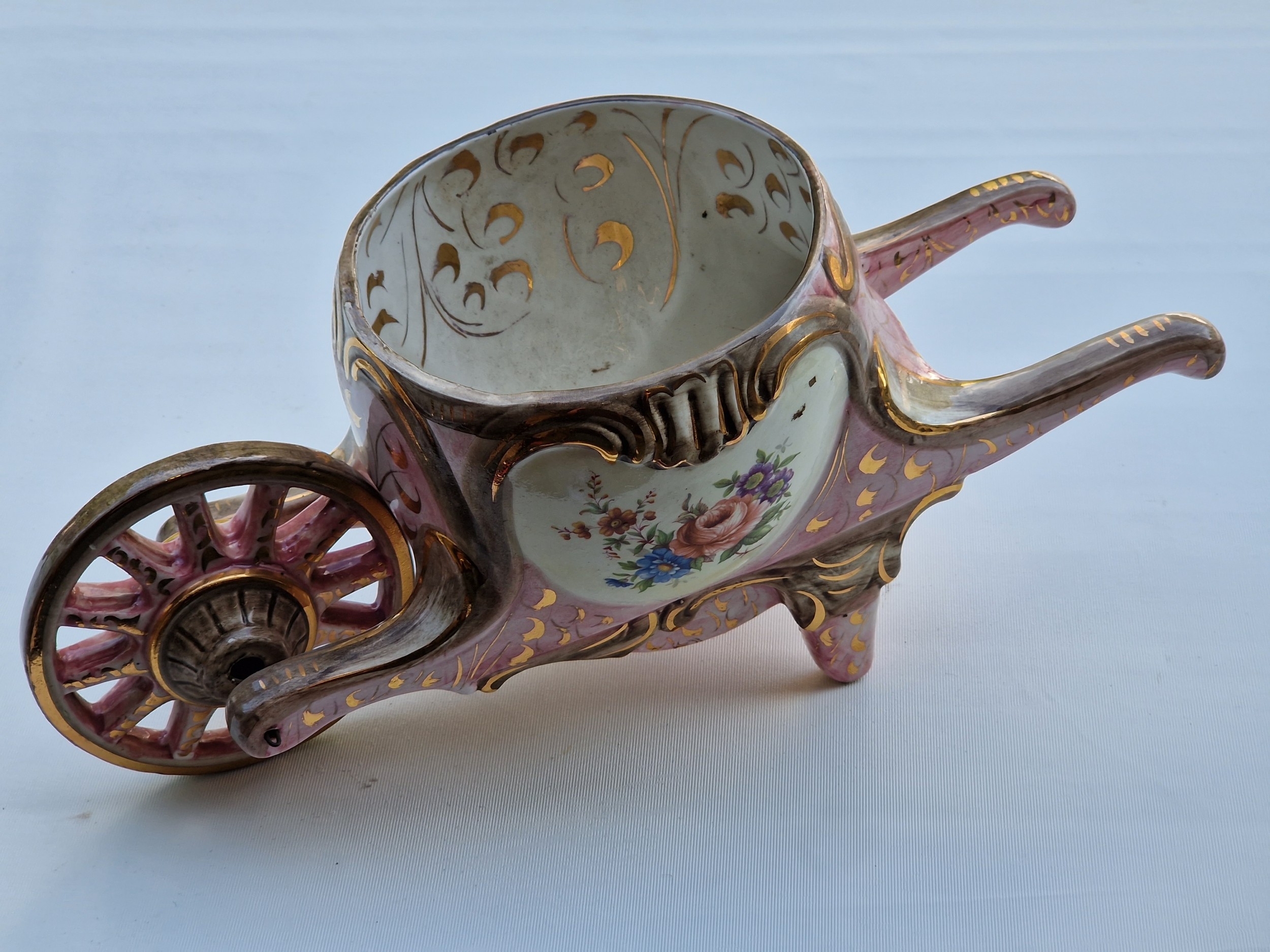 DECORATIVE GILT PORCELAIN WHEELBARROW JARDINIERE - MADE IN ITALY
