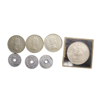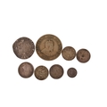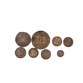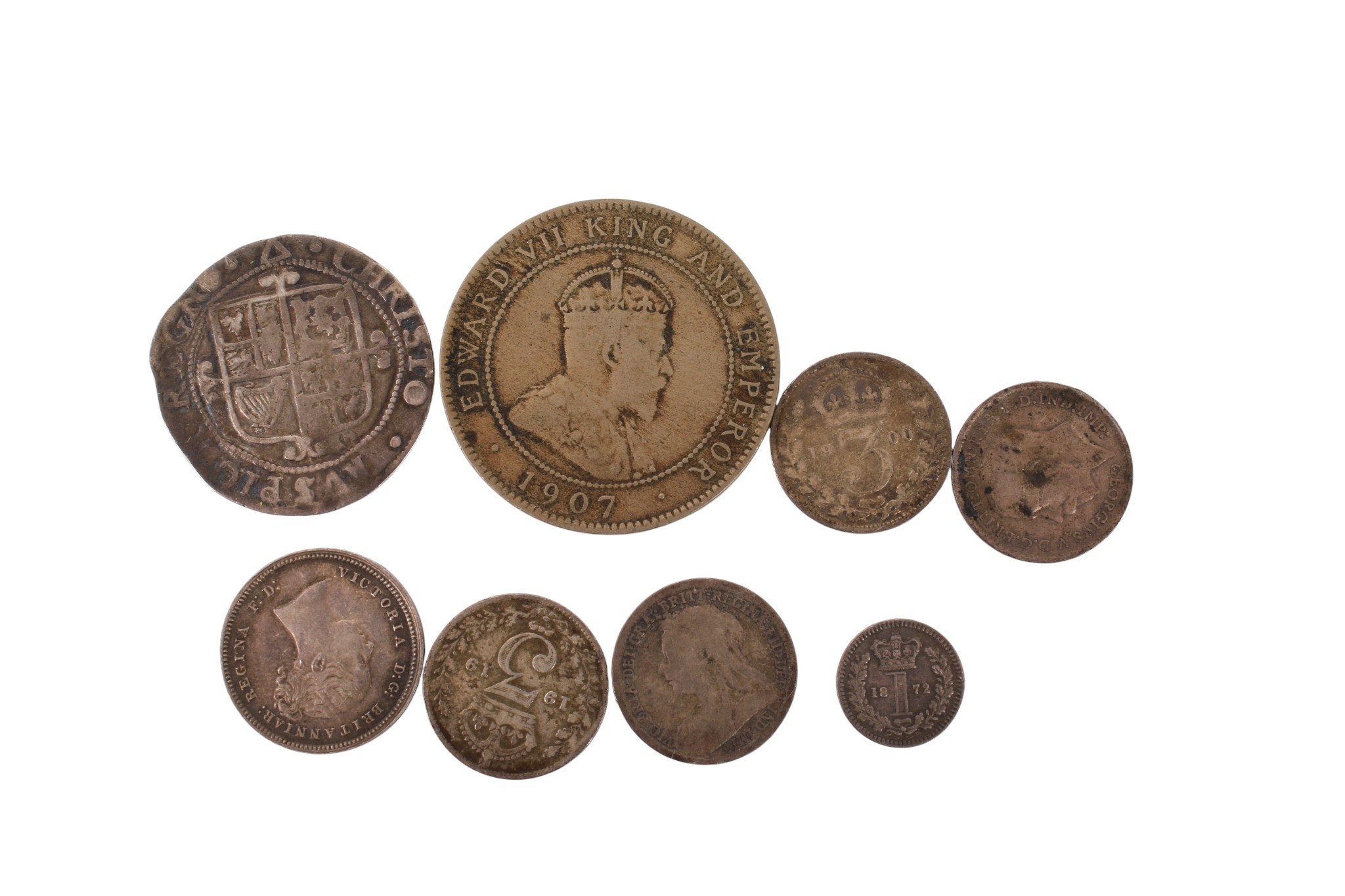A small group of assorted coins. Including Charles I Mint mark triangle, 1872 Maundy 4 pence and 1 pence, four silver three pences and a jamaica 1907 1d