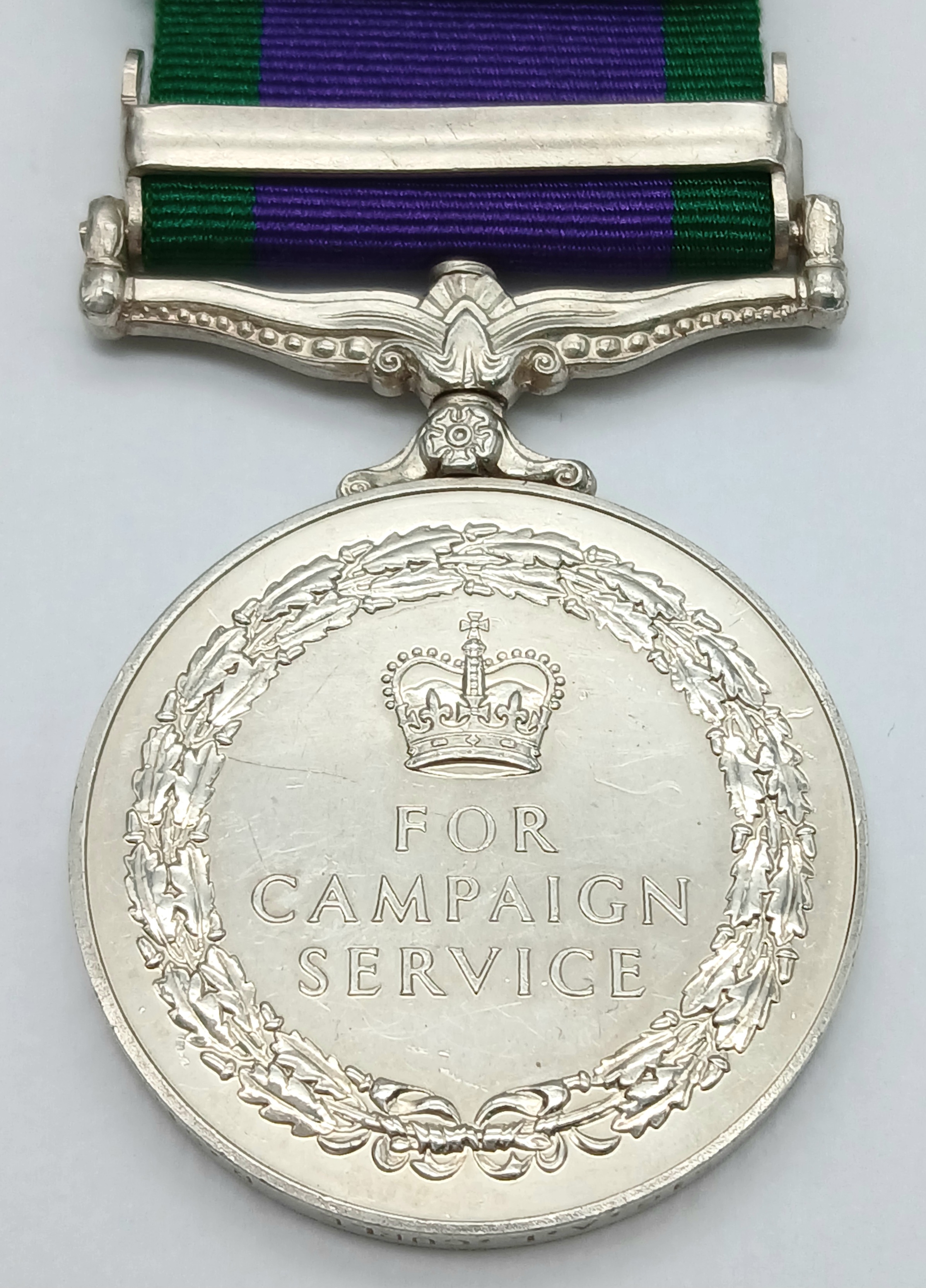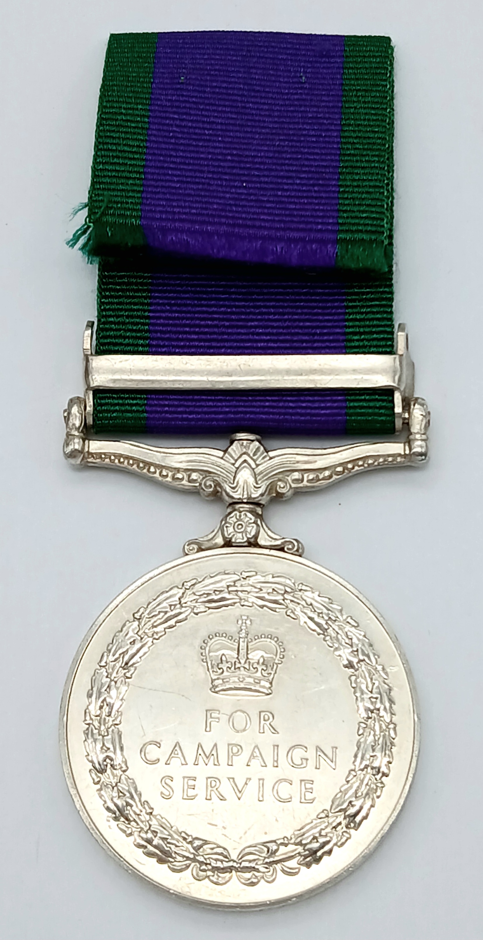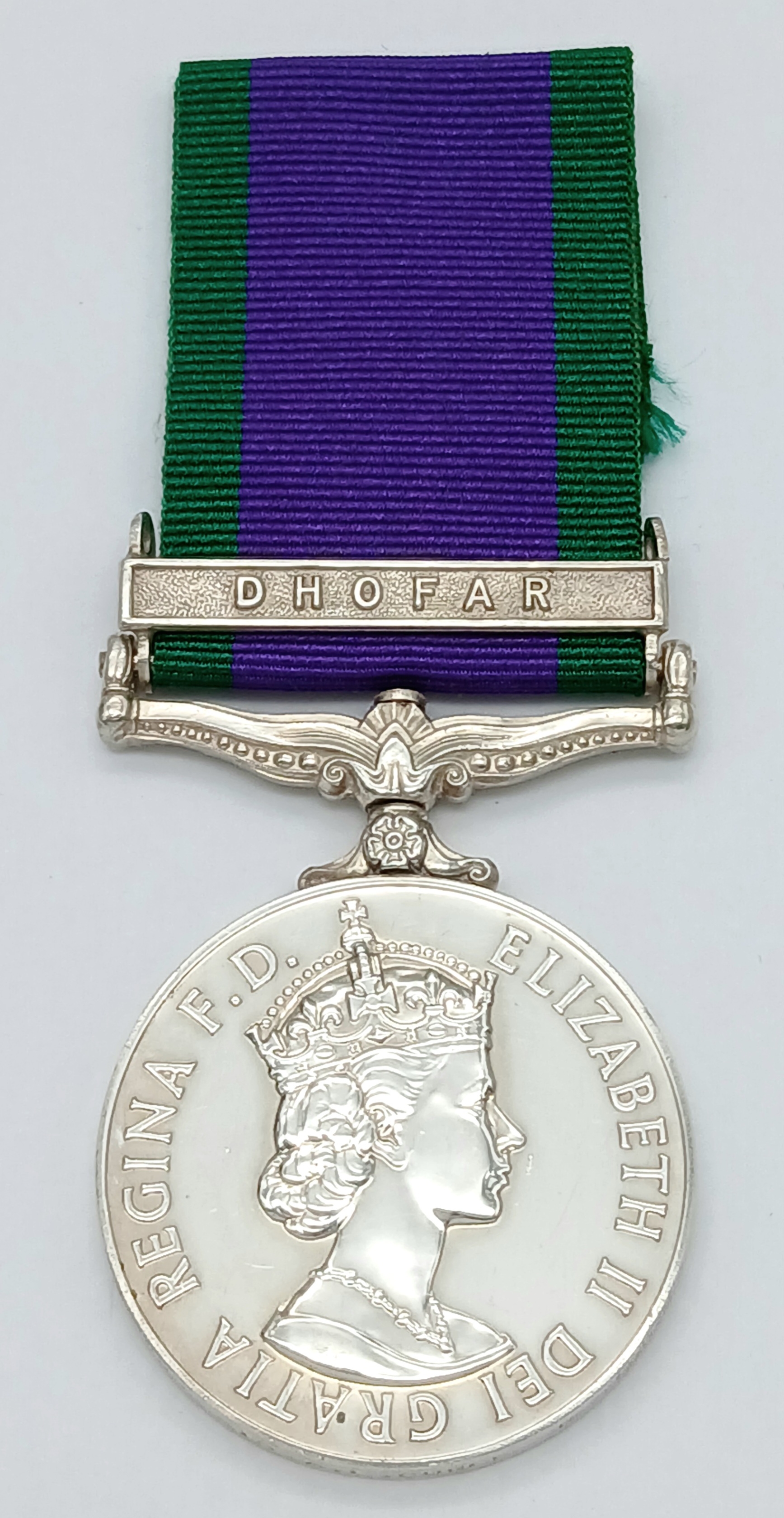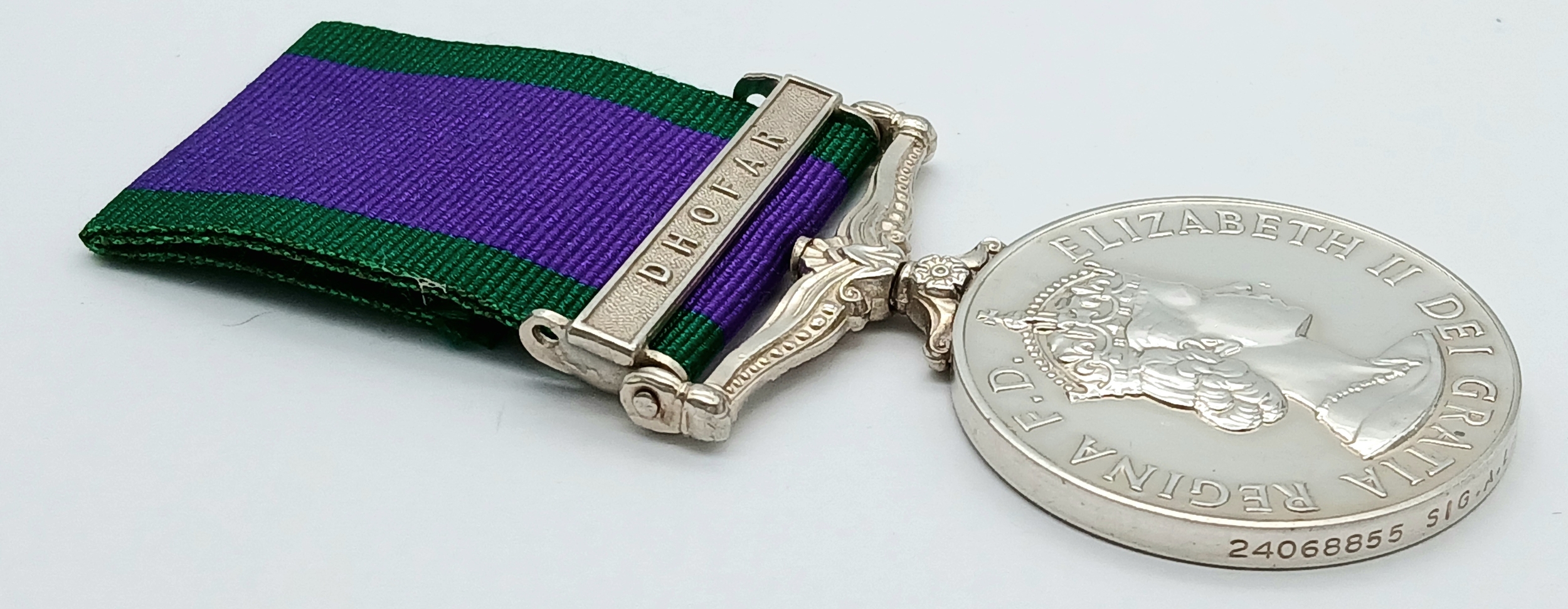 The clasp Dhofar was awarded in relatively small numbers to members of the British armed forces engaged in supporting Sultan Qaboos bin Said in his efforts to reform the state of Oman and to defeat the communist-inspired insurgents of the Popular Front for the Liberation of the Occupied Arab Gulf (PFLOAG), whose aim was, inter alia, to bring about the separation of the region of Dhofar from the state of Oman. The relevant period was 1 October 1969 to 30 September 1976, and individuals seconded to, or employed on contract to the Sultan’s Armed Forces were not eligible.