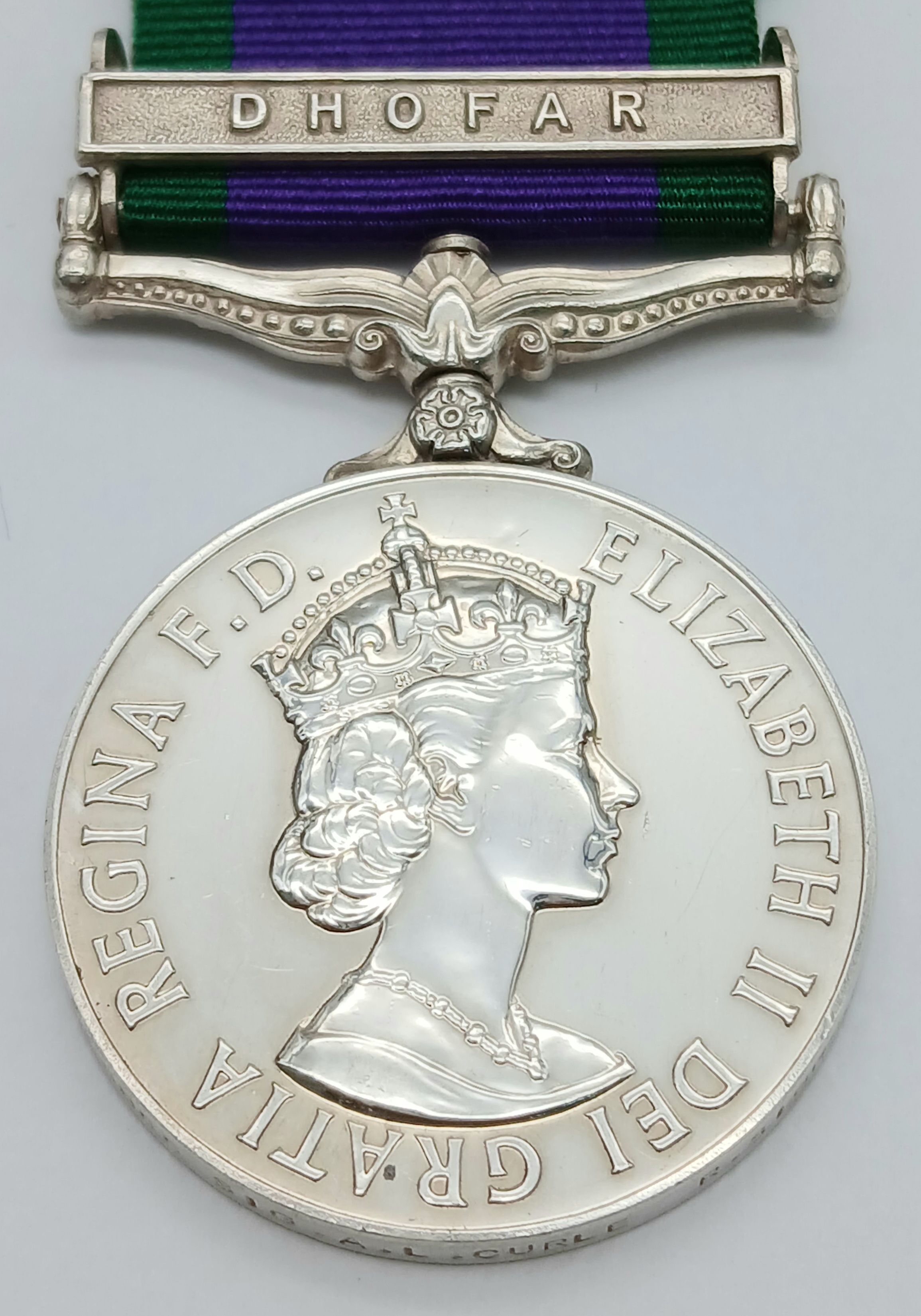 A General Service Medal 1962 with clasp Dhofar, named to: 24068855 Sig A L Curle R Signals.