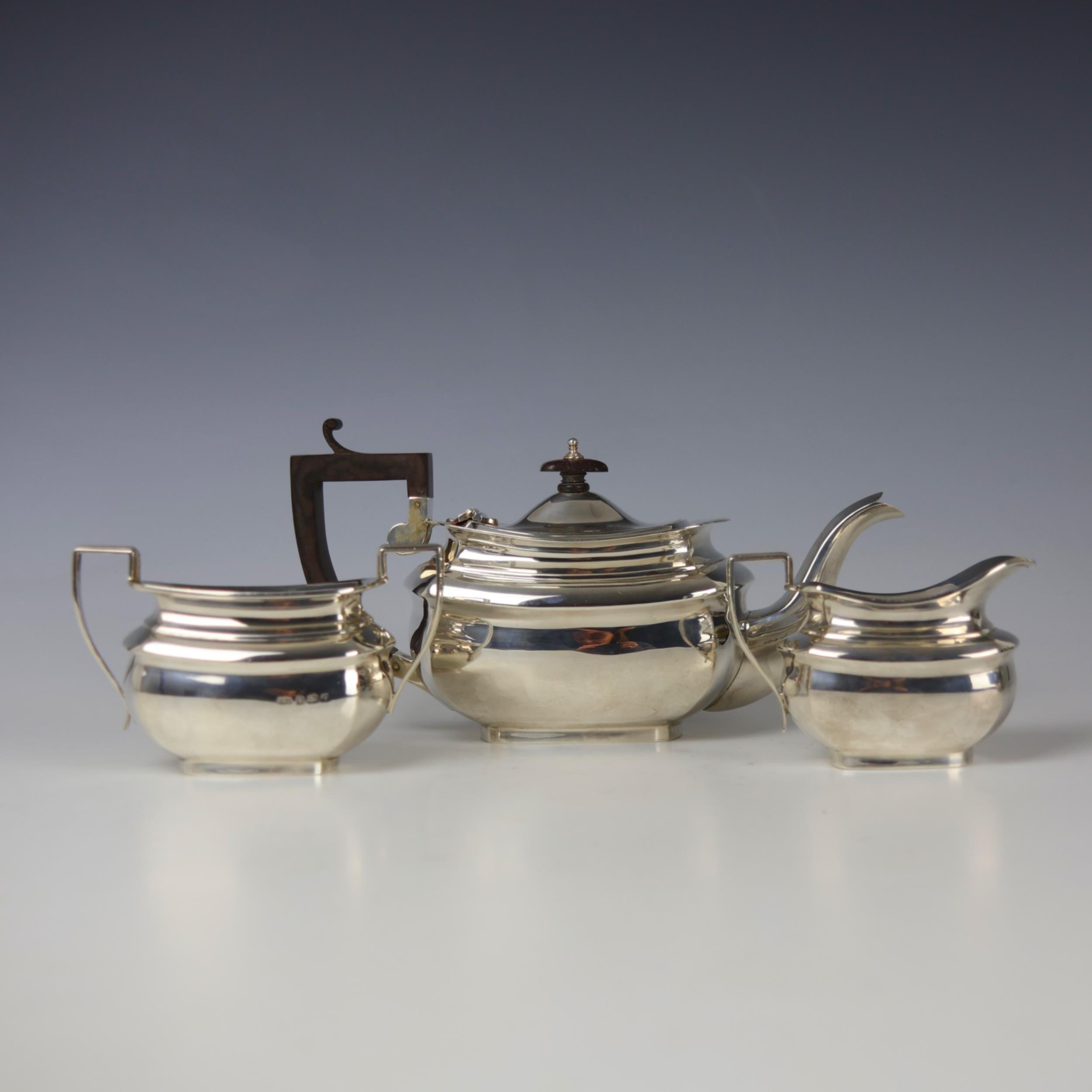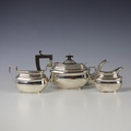 An Edwardian silver three piece tea service, Jones and Crompson, Birmingham 1909, comprising teapot, sugar bowl, and milk jug, the angular handle above bulbous body, with gilt interior, teapot 12cm high, gross weight 17ozt (3)