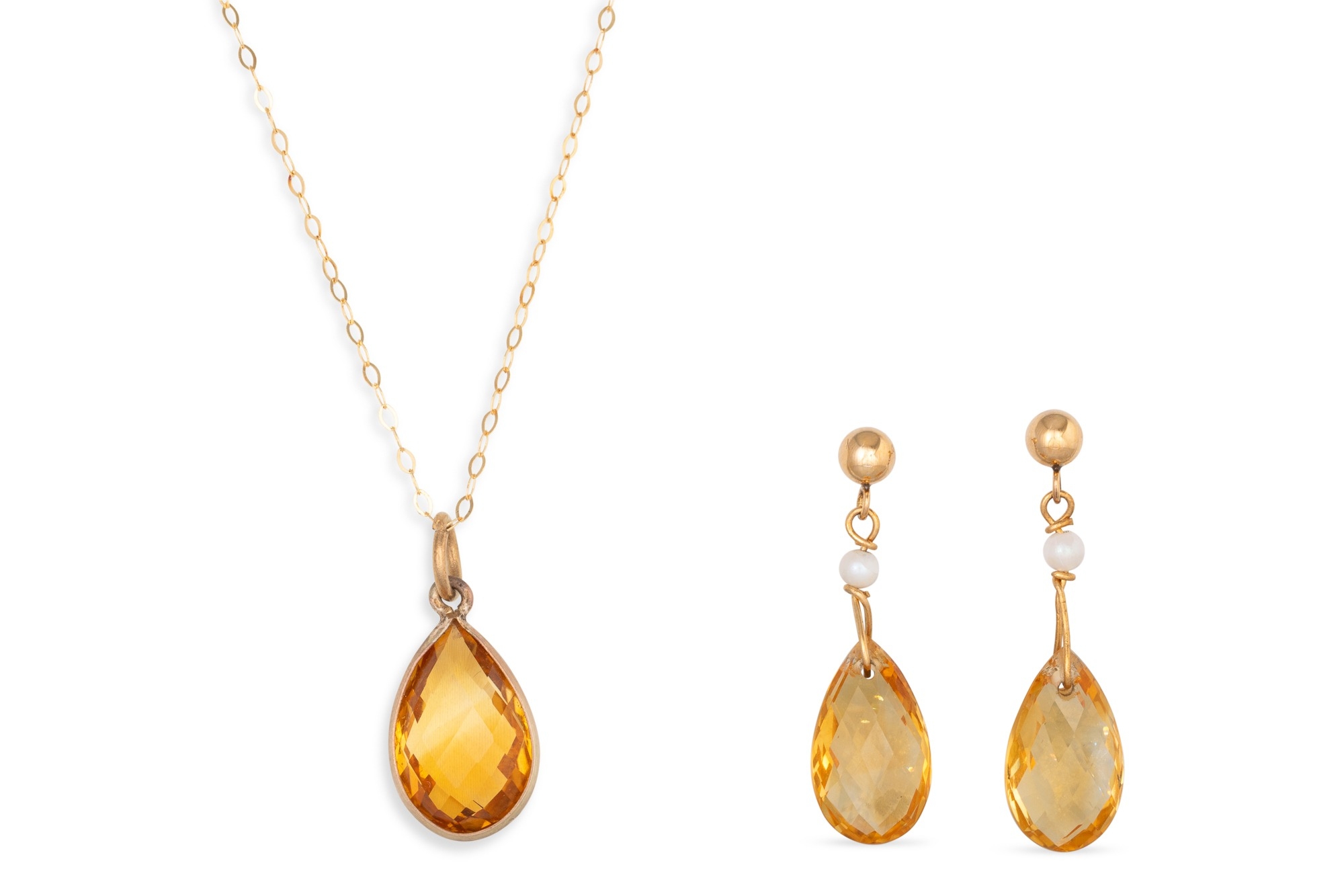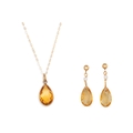 A PAIR OF GOLD AND CITRINE DROP EARRINGS, together with a matching pendant, pendant: 2.3 cm, earrings: 3 cm drop, length of chain 18"
