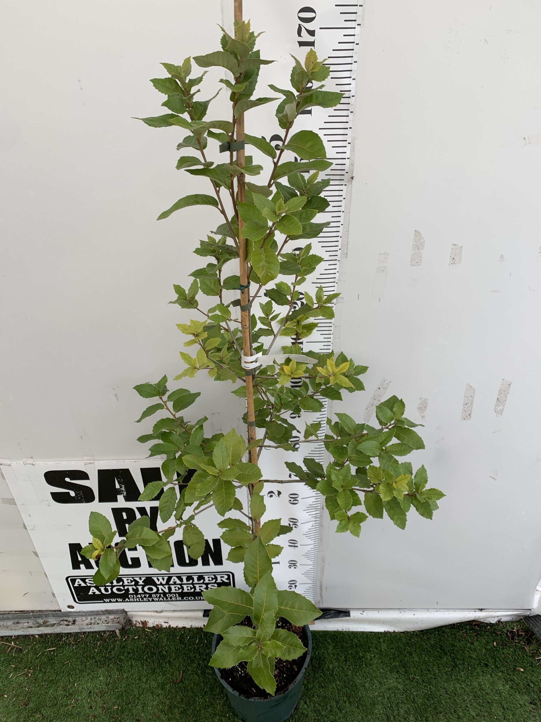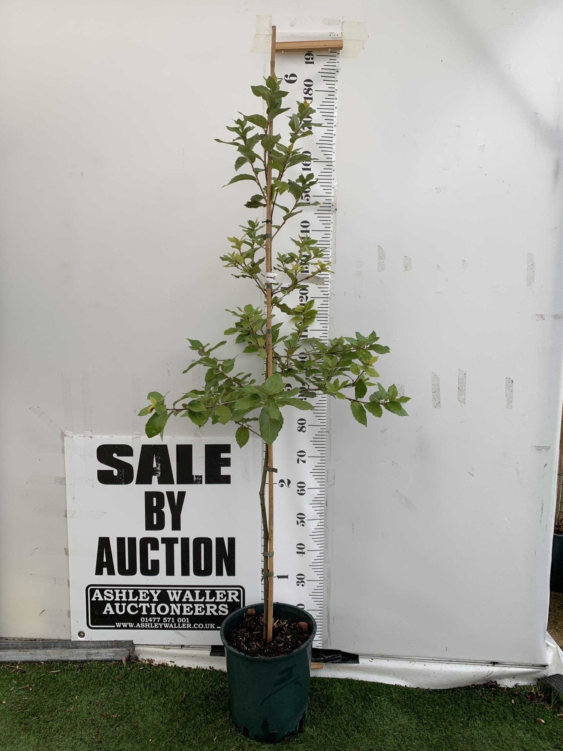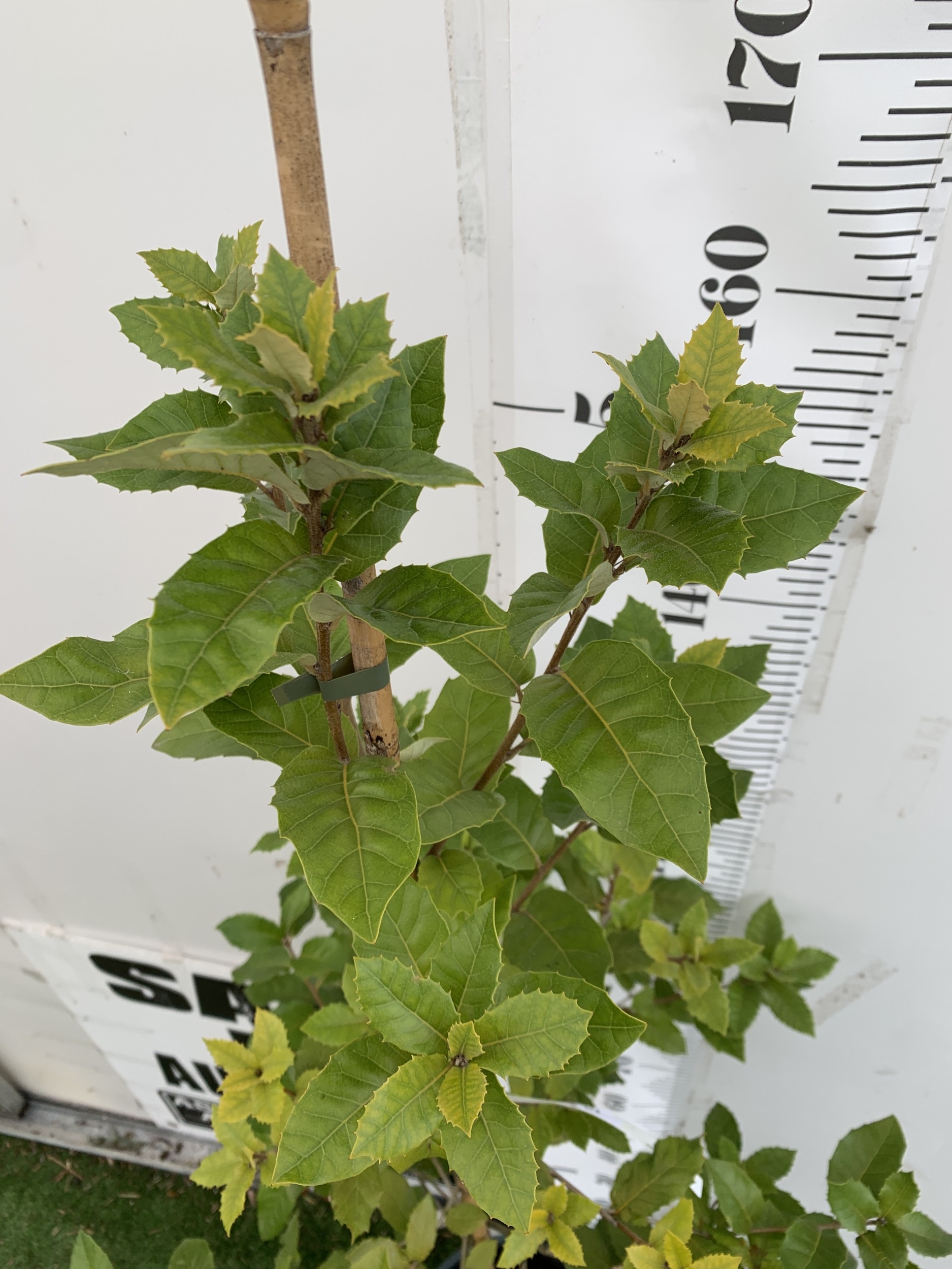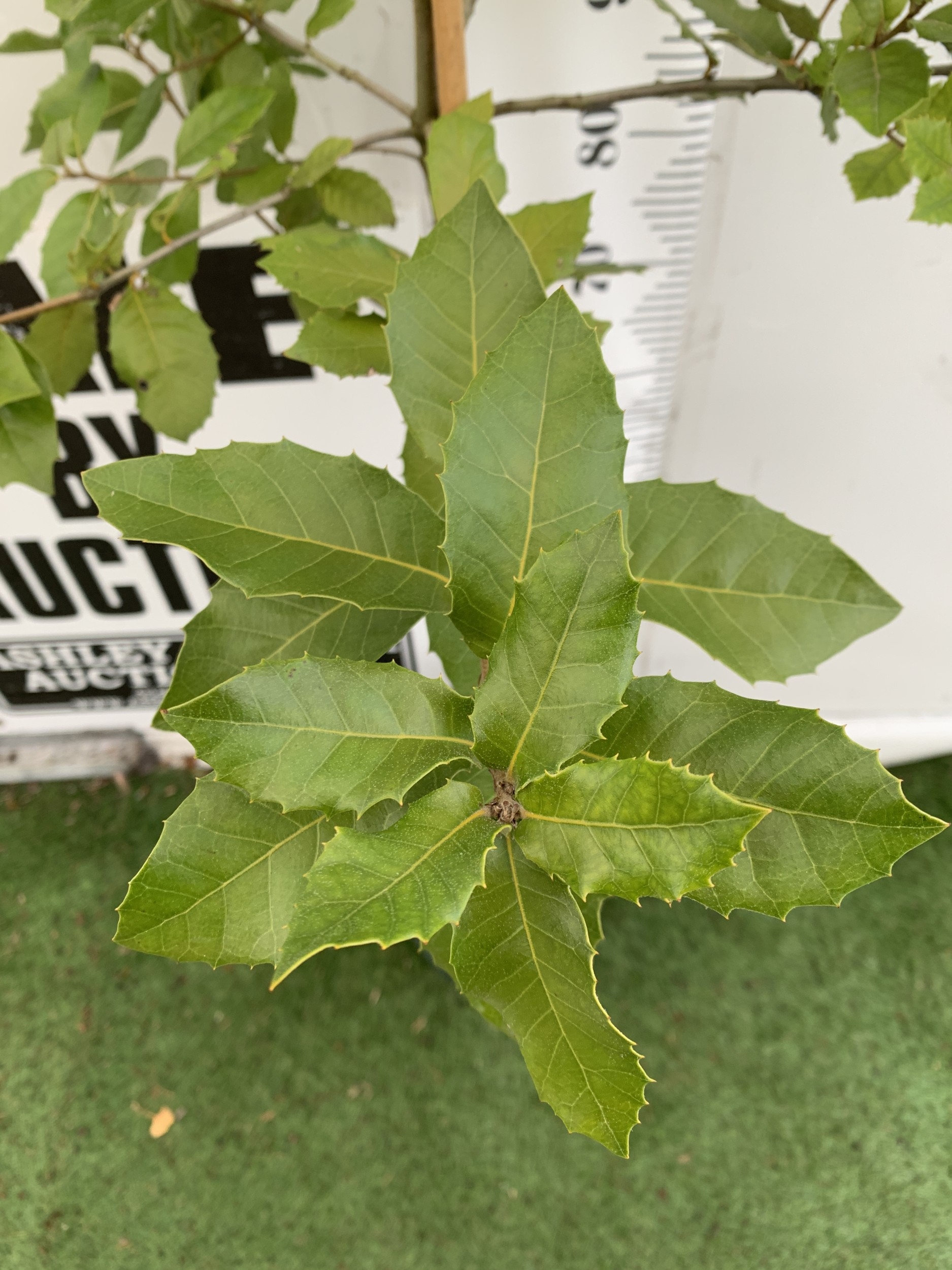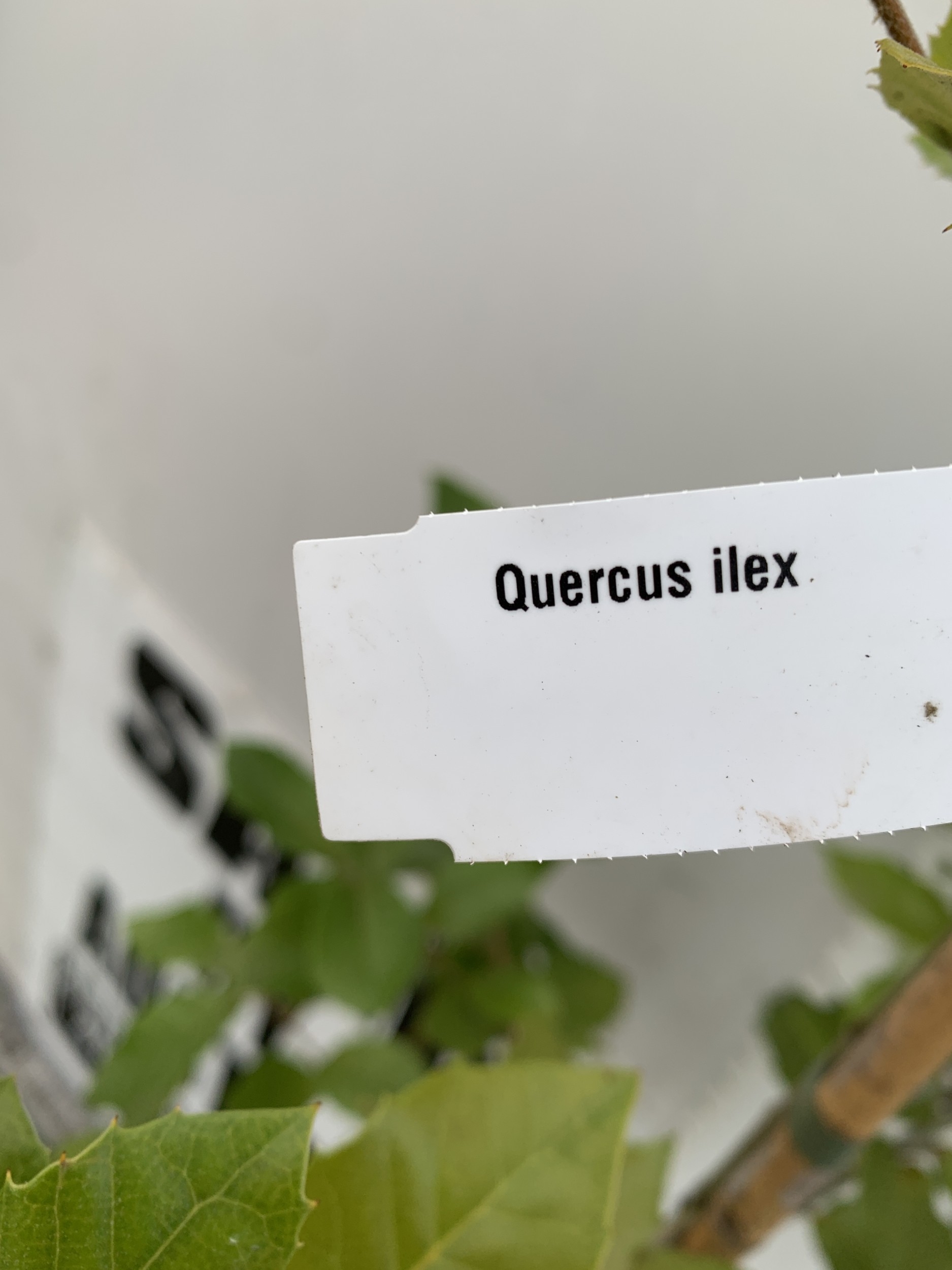 ONE QUERCUS ILEX EVERGREEN OR HOLM OAK IN A 12 LTR POT. LEAVES ARE GREEN WITH SILVER UNDERNEATH. YELLOW CATKINS IN JUNE GIVING RISE TO ACORNS. APPROX 180CM TALL