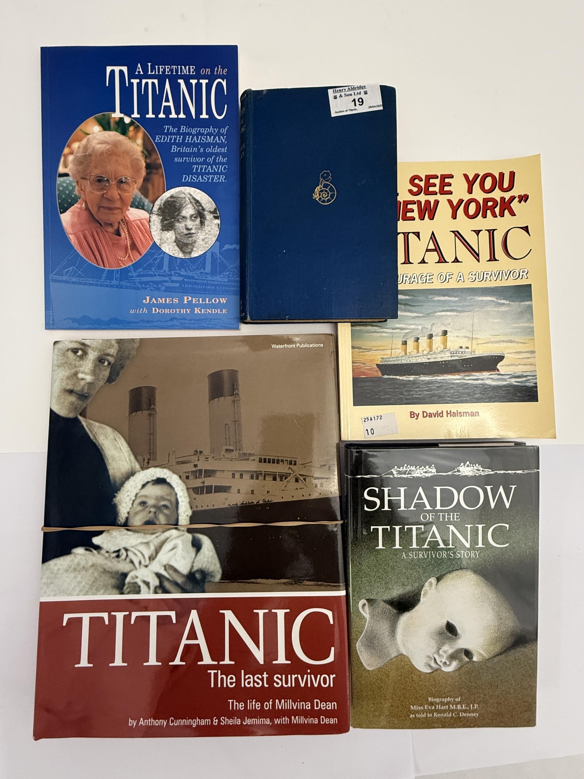R.M.S. TITANIC: Collection of mostly first edition autobiographies including The Loss of The Titanic by Lawrence Beesley (Nautilus edition), A Lifetime on The Titanic Edith Haisman (signed), Shadow of The Titanic by Eva Hart (signed), I'll See You In New York and Titanic, The Last Survivor Millvina Dean (signed). (5)