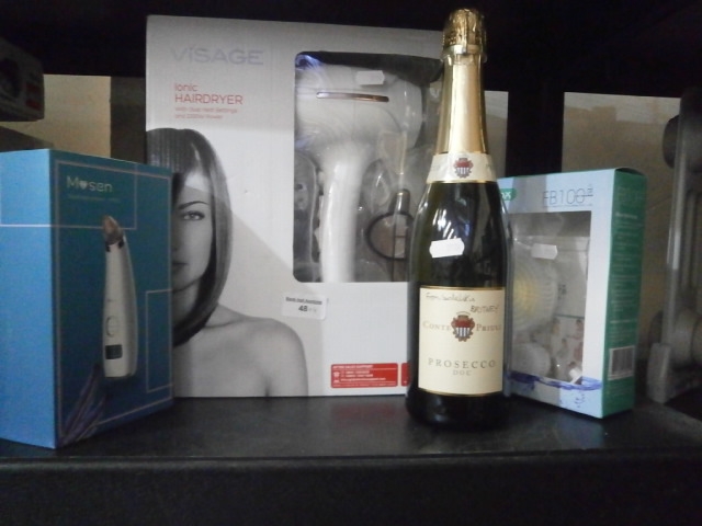 Lot inc Visage ionic hairdryer, bottle of Prosecco, blackhead remover, etc