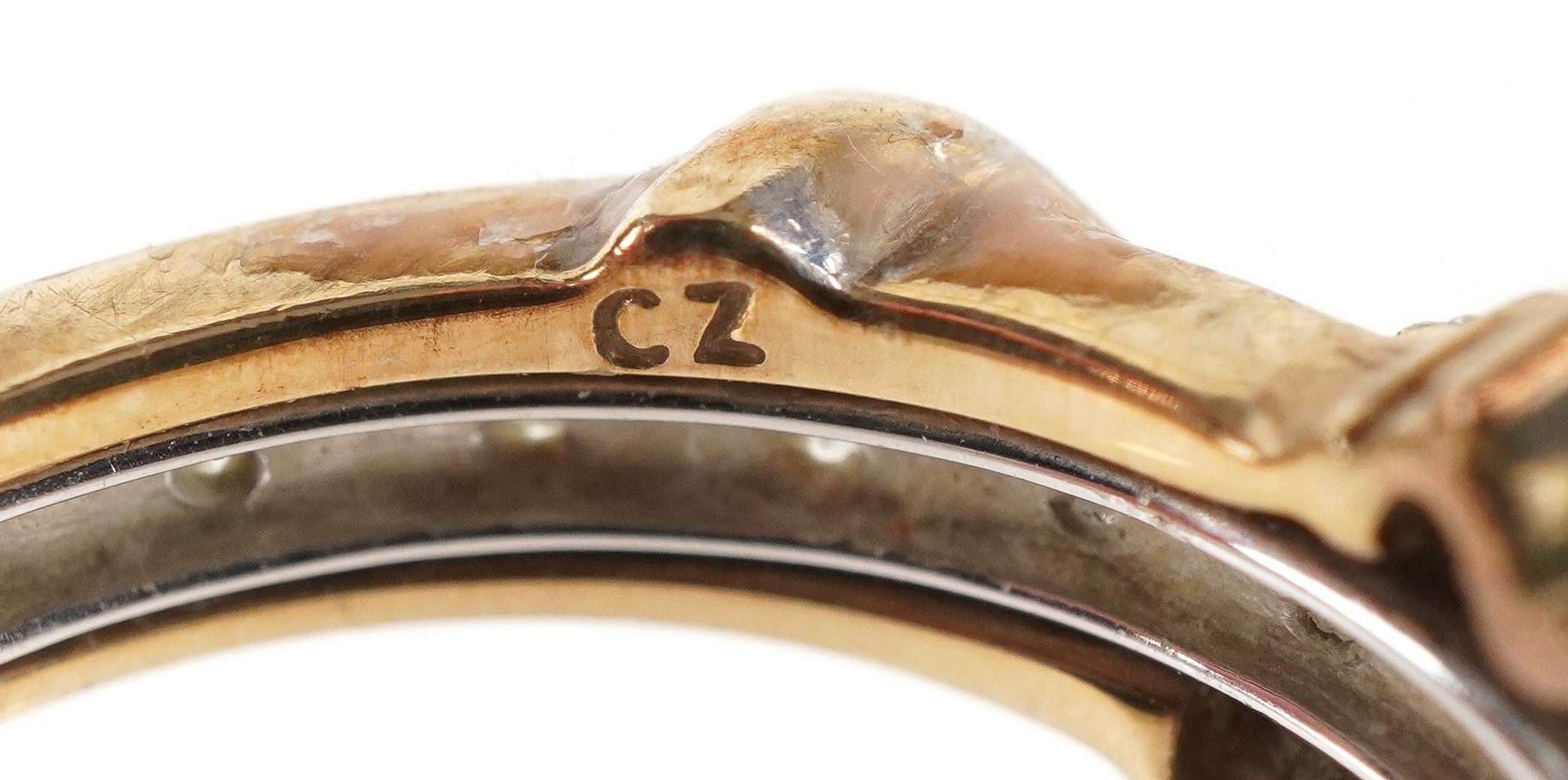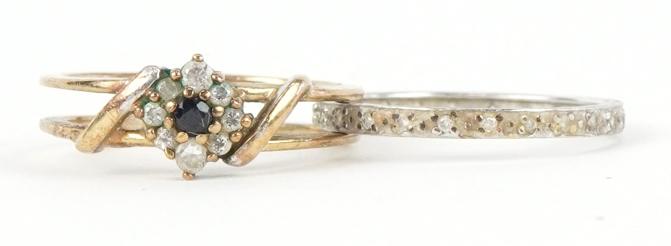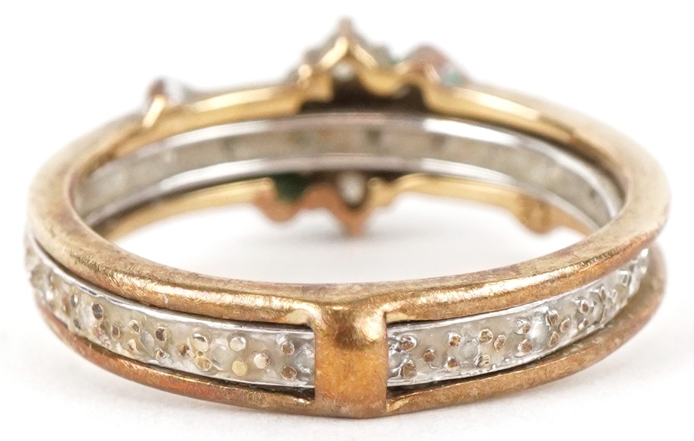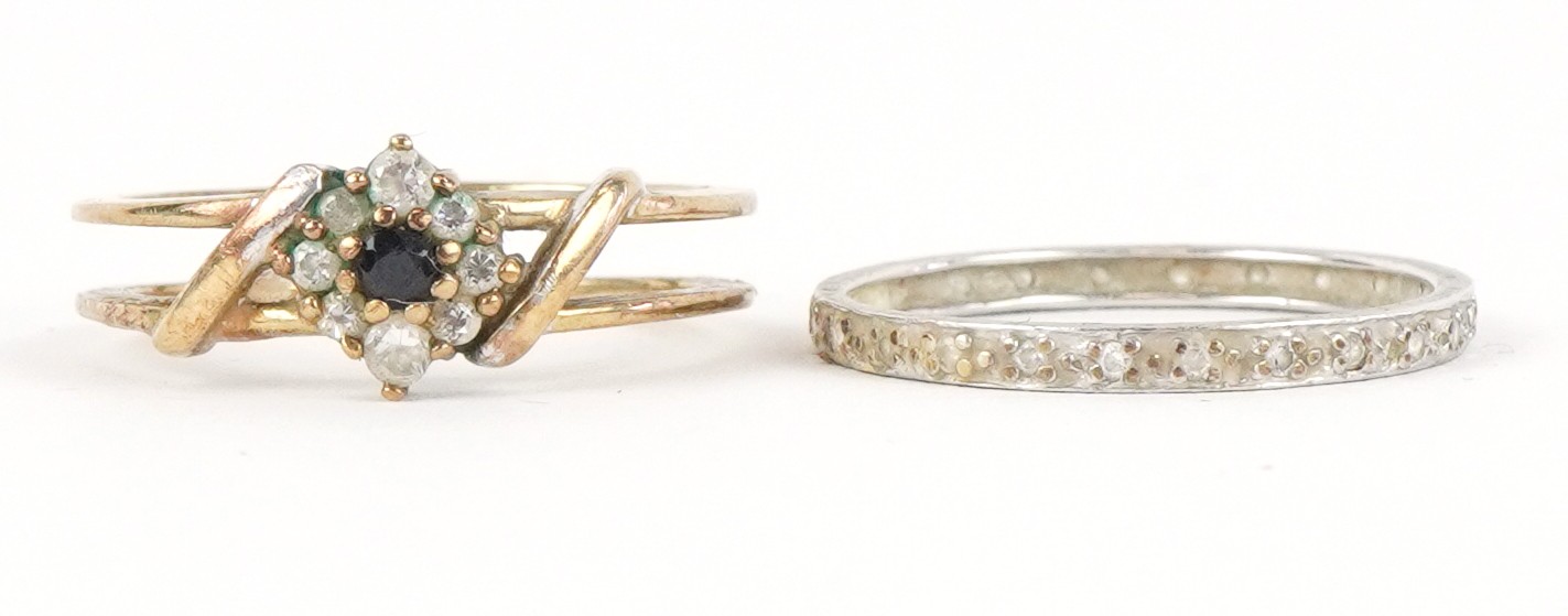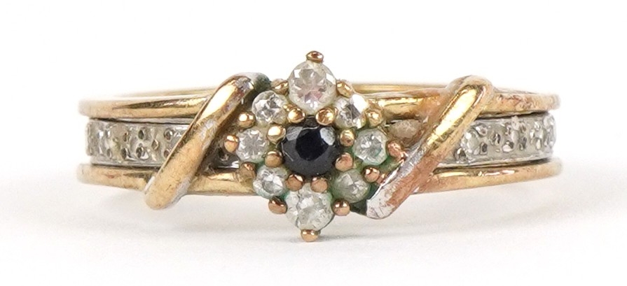 A 9ct white and yellow gold cubic zirconia and blue spinel ring with a detachable band, size N, 3.4g.