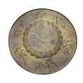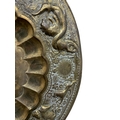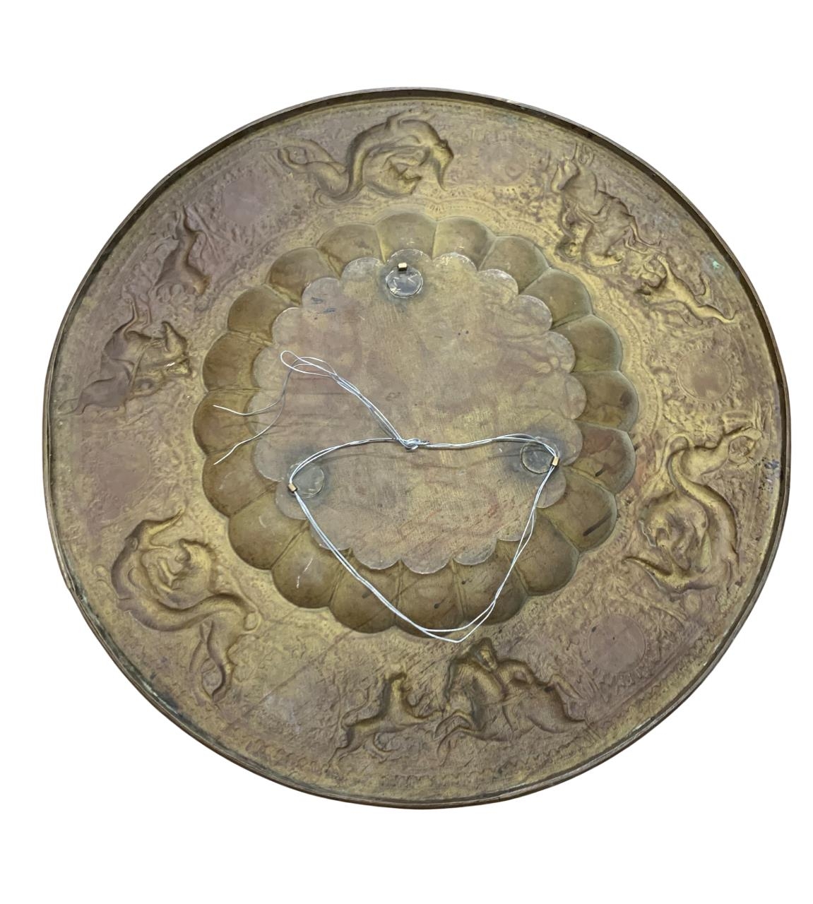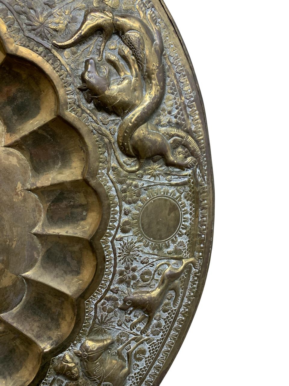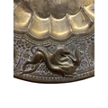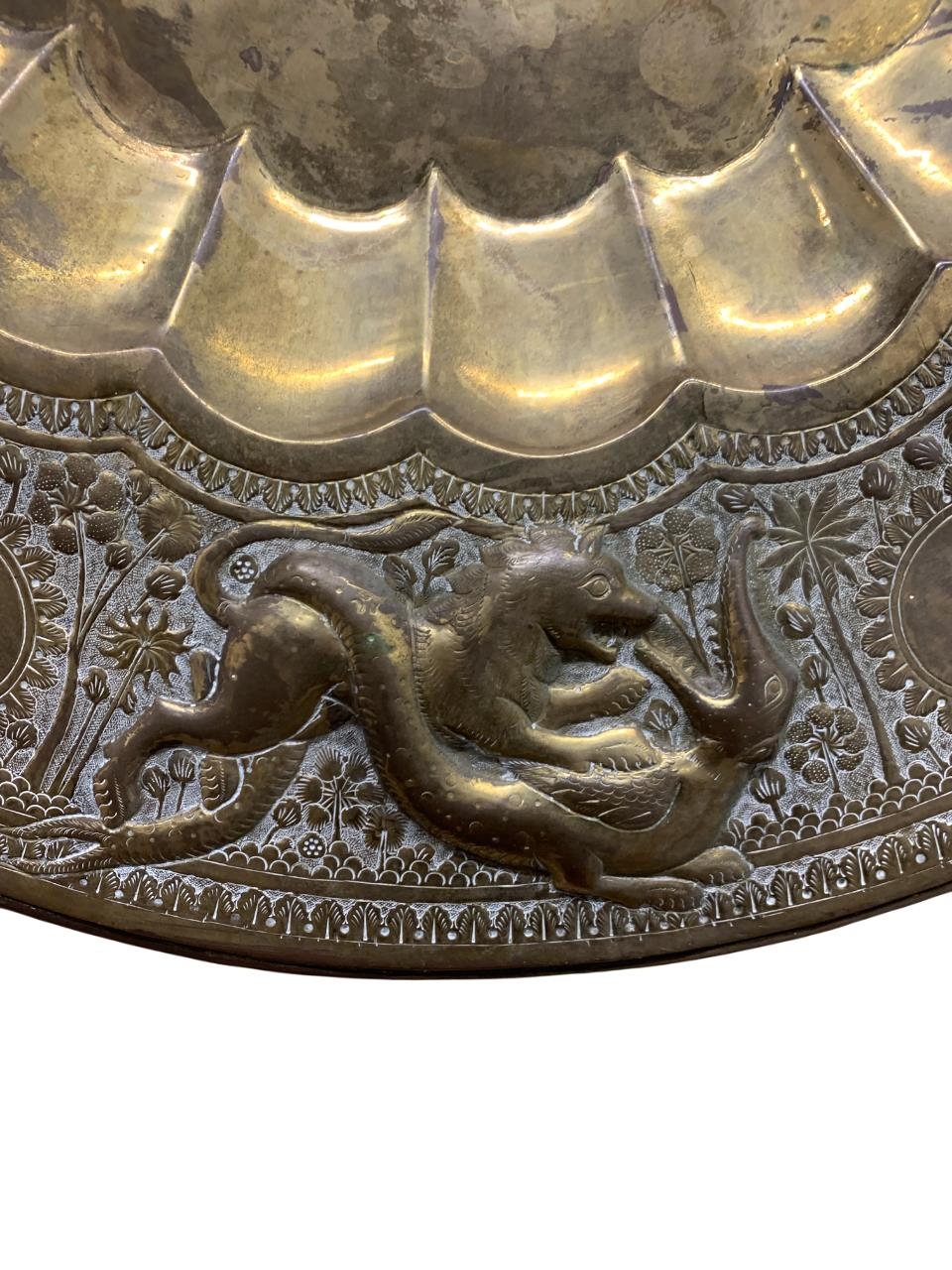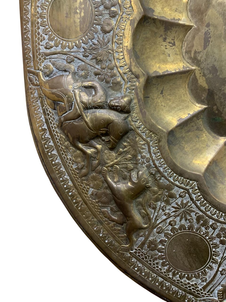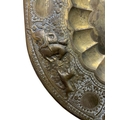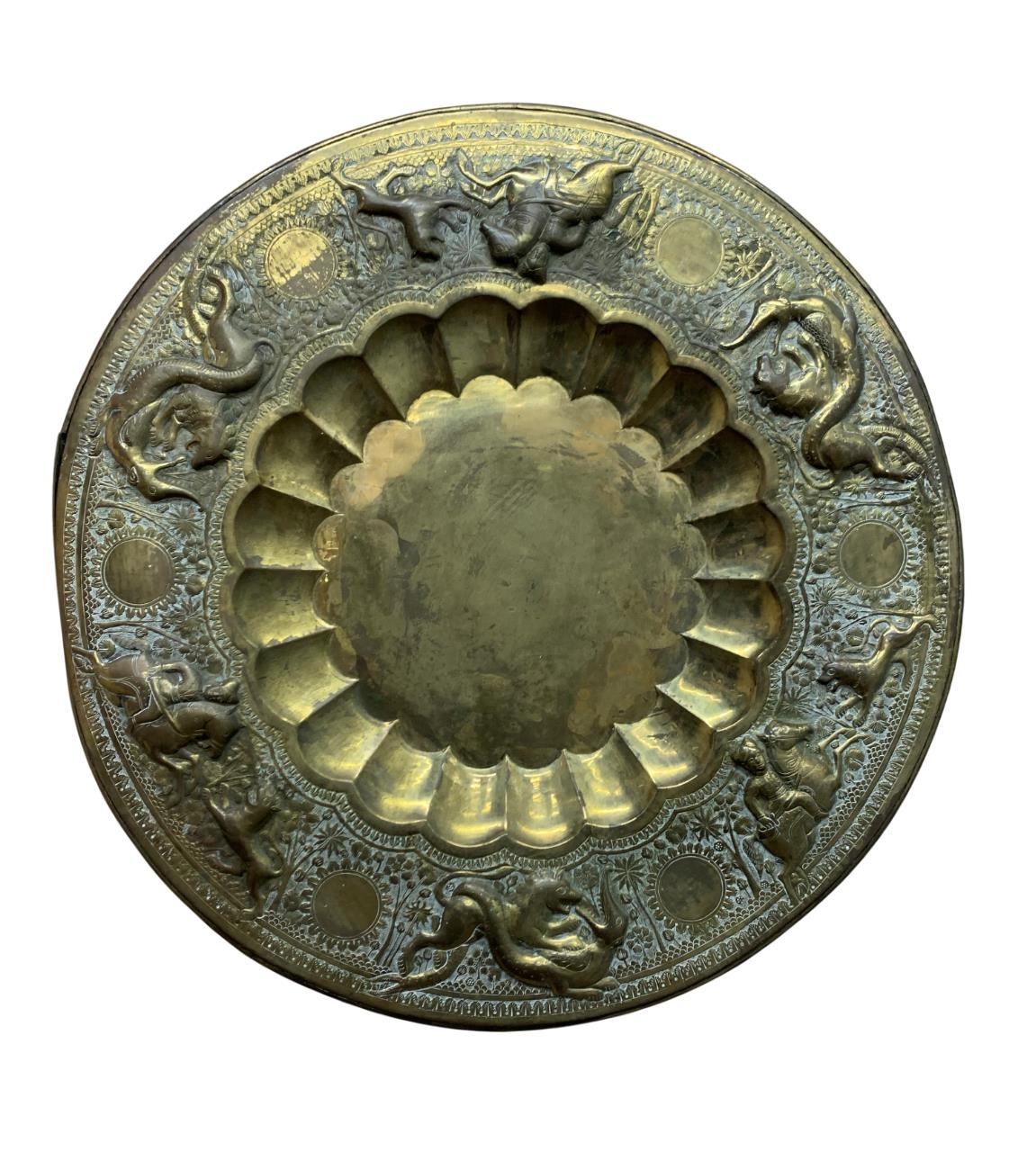 Antique Eastern brass brazier or charger, embossed with beasts and hunting scenes, 71cm diameter