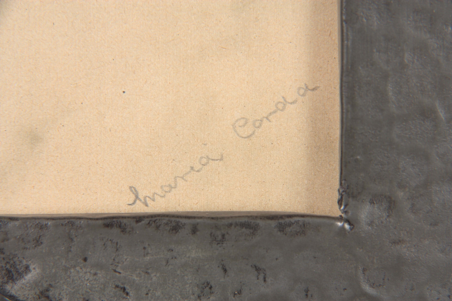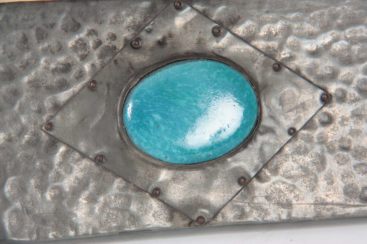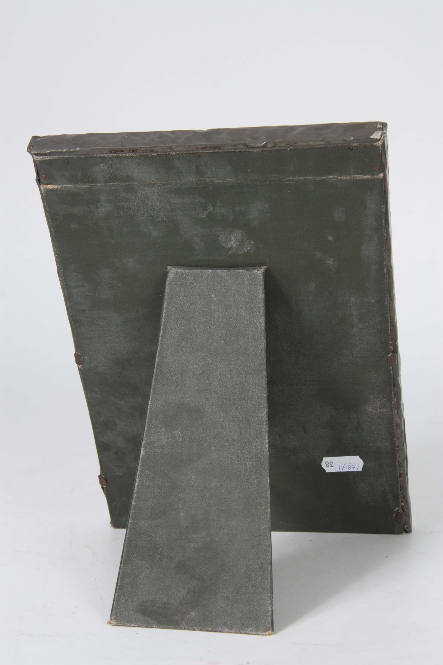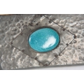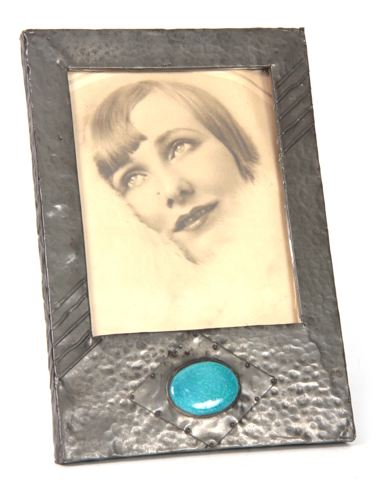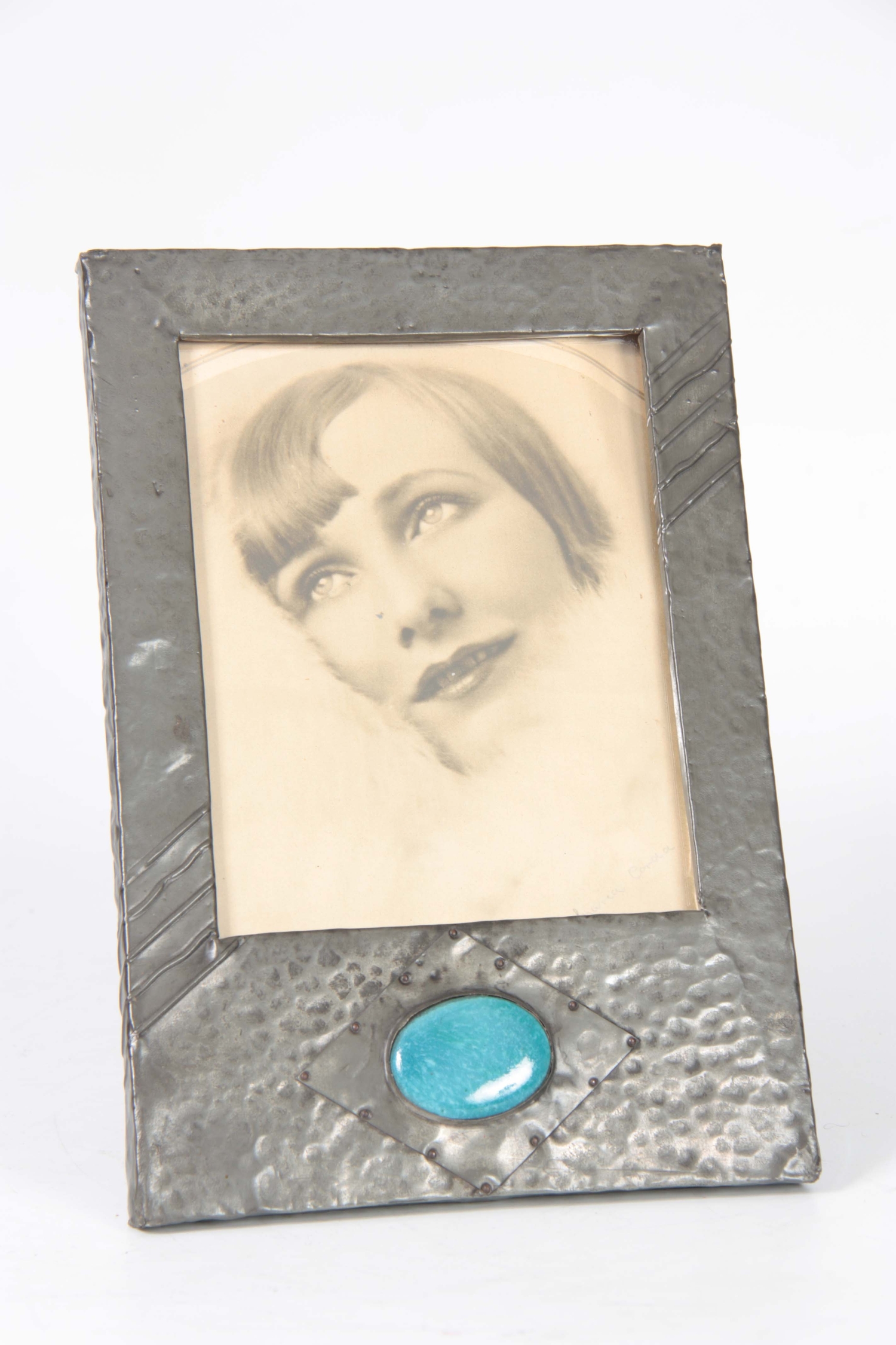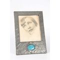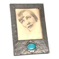 AN ARTS AND CRAFTS BEATEN PEWTER PHOTOGRAPH FRAME set with a blue Ruskin style large oval ceramic medallion 28.5cm high 19.5cm wide