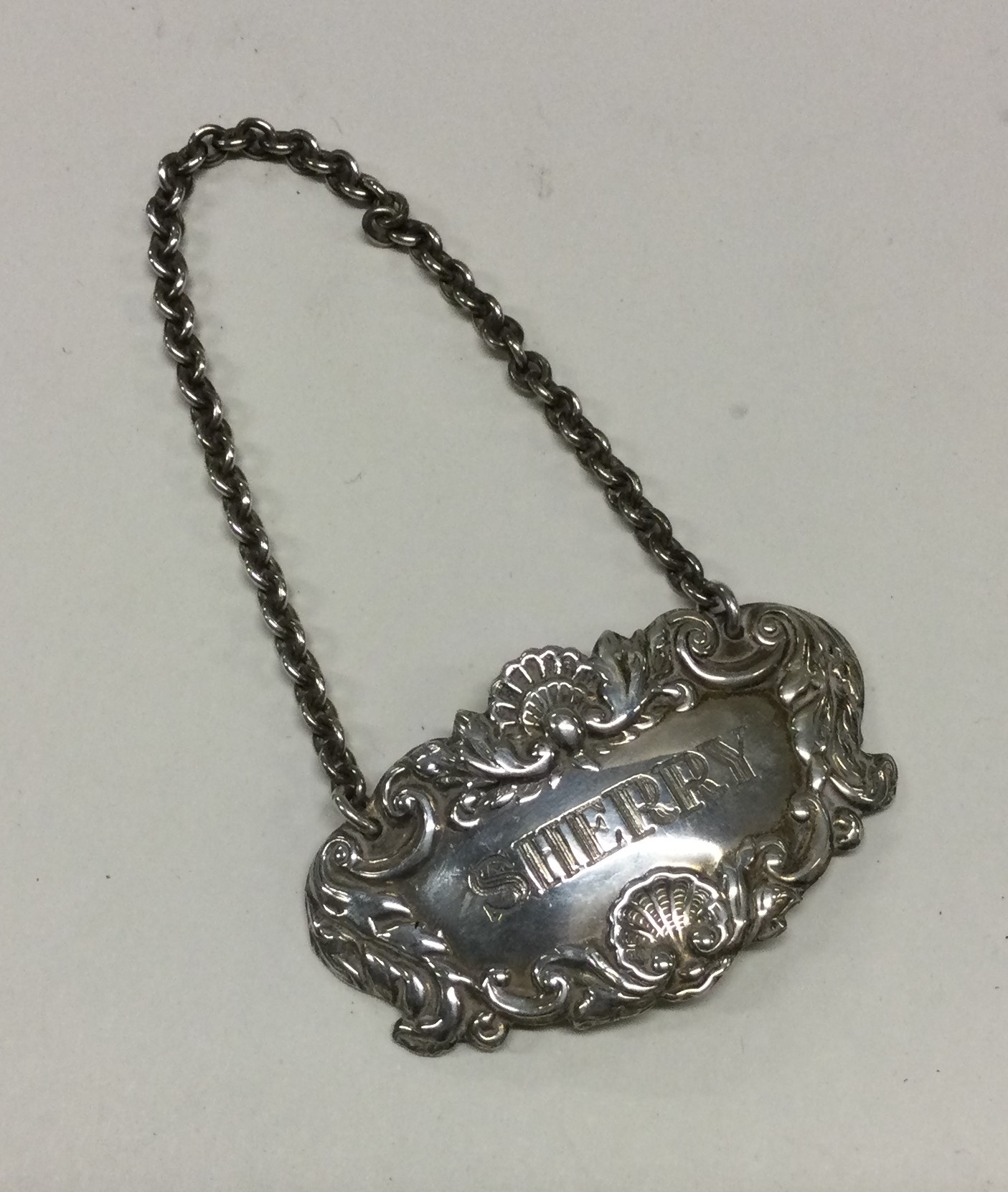 A silver wine label for 'Sherry'. Birmingham. Approx. 14 grams. Est. £15 - £20.