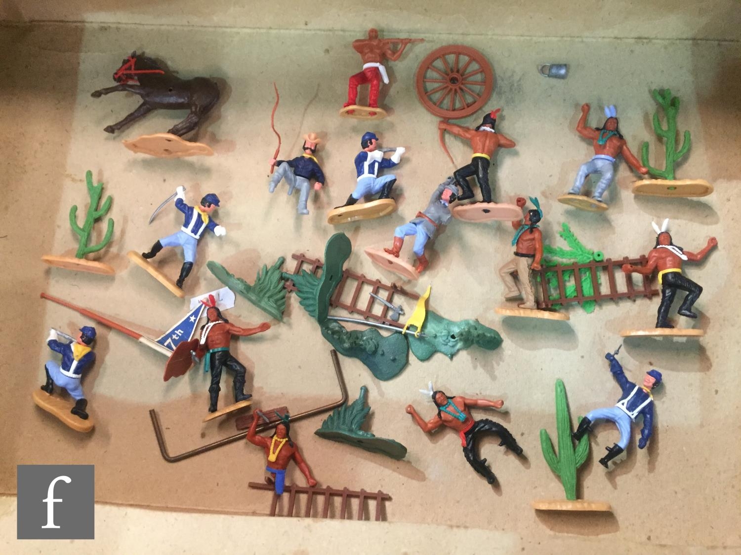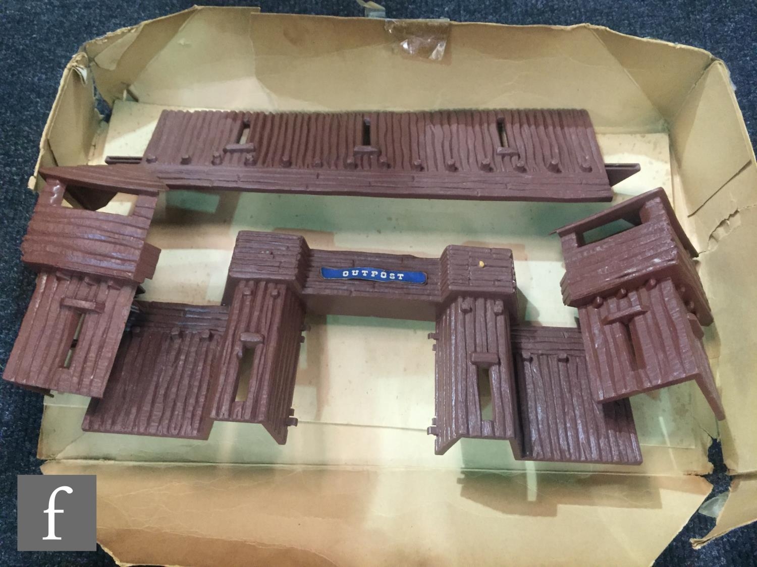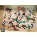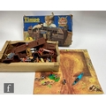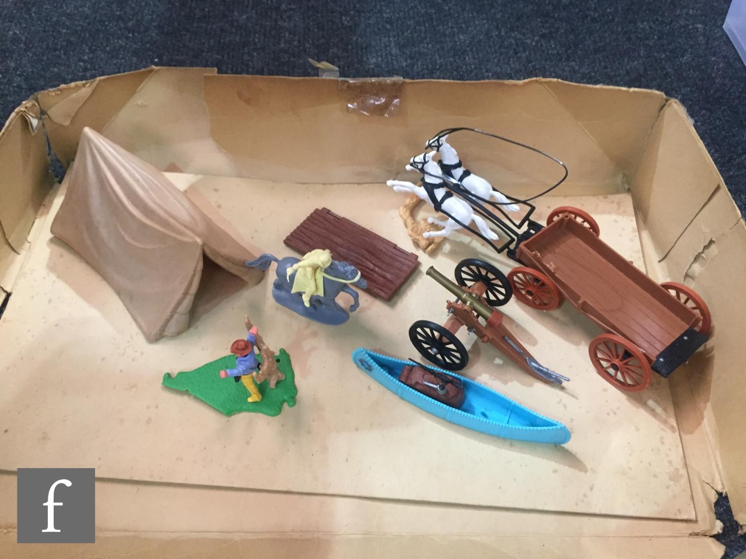 A collection of Timpo Wild West plastic figures, to include a boxed No. 257 Fort Alamo playset, including cardboard playmat, fort pieces, cacti and a tent (not checked if complete), an incomplete Covered Wagon, Field Gun, incomplete Trapper Canoe, an incomplete prisoner diorama with Indian holding a cowboy hostage (lacking ties to wrists, knife from pocket), along with assorted US Cavalry and Indian figures from the Swoppets range, some incomplete. (qty)