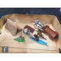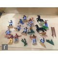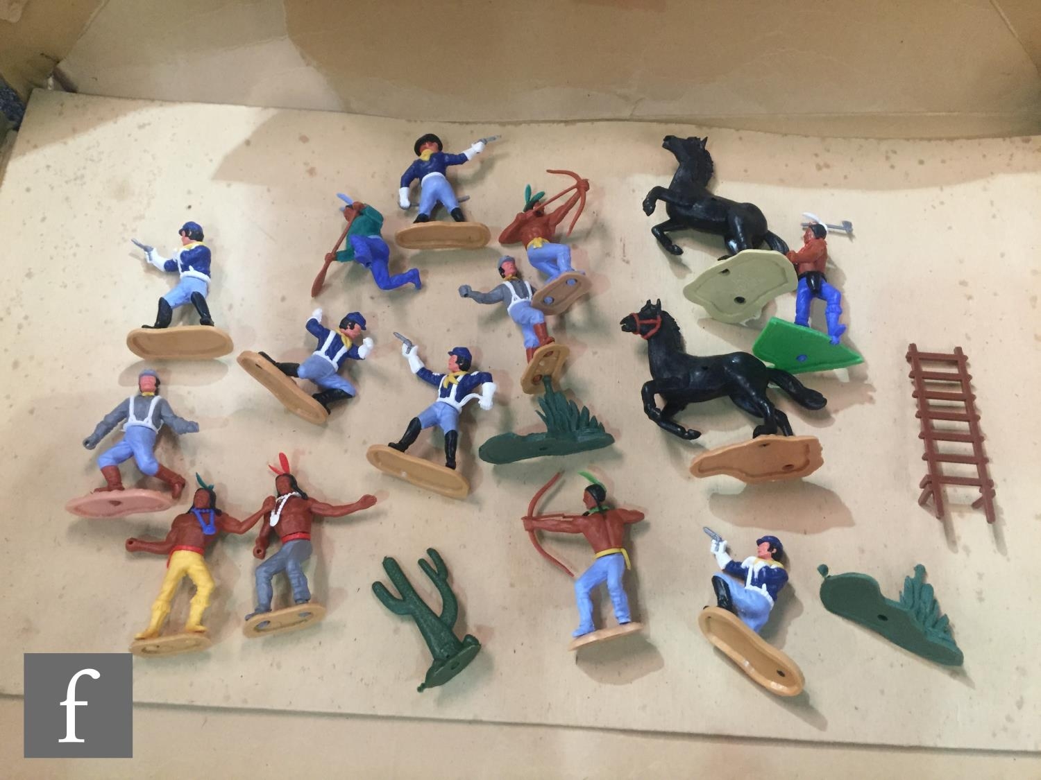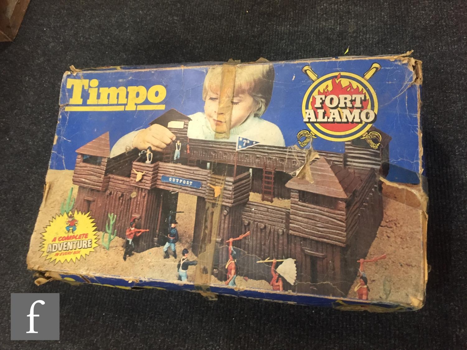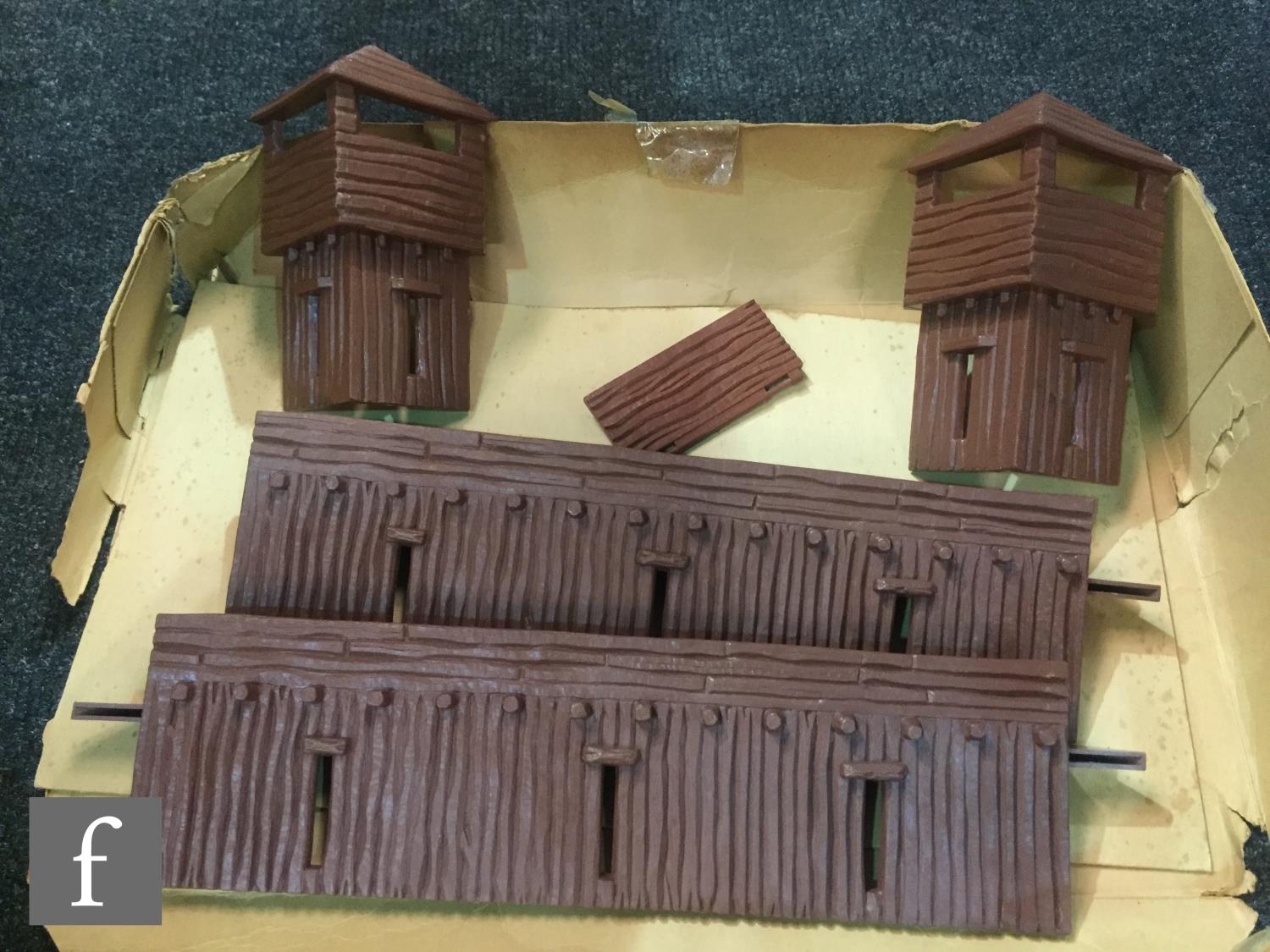A collection of Timpo Wild West plastic figures, to include a boxed No. 257 Fort Alamo playset, including cardboard playmat, fort pieces, cacti and a tent (not checked if complete), an incomplete Covered Wagon, Field Gun, incomplete Trapper Canoe, an incomplete prisoner diorama with Indian holding a cowboy hostage (lacking ties to wrists, knife from pocket), along with assorted US Cavalry and Indian figures from the Swoppets range, some incomplete. (qty)