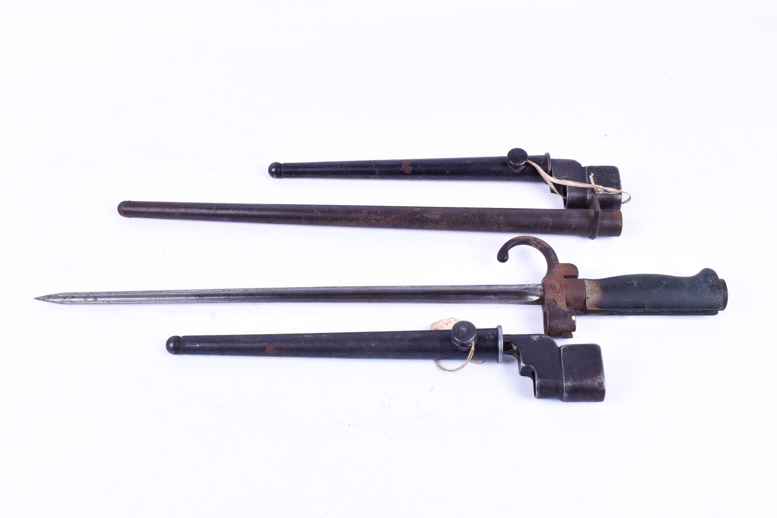 Militaria - a French Lebel bayonet and two British No. 4 spike bayonets. Largest 48cm long, all with scabbards