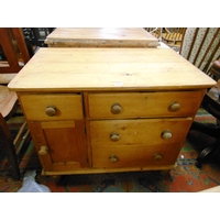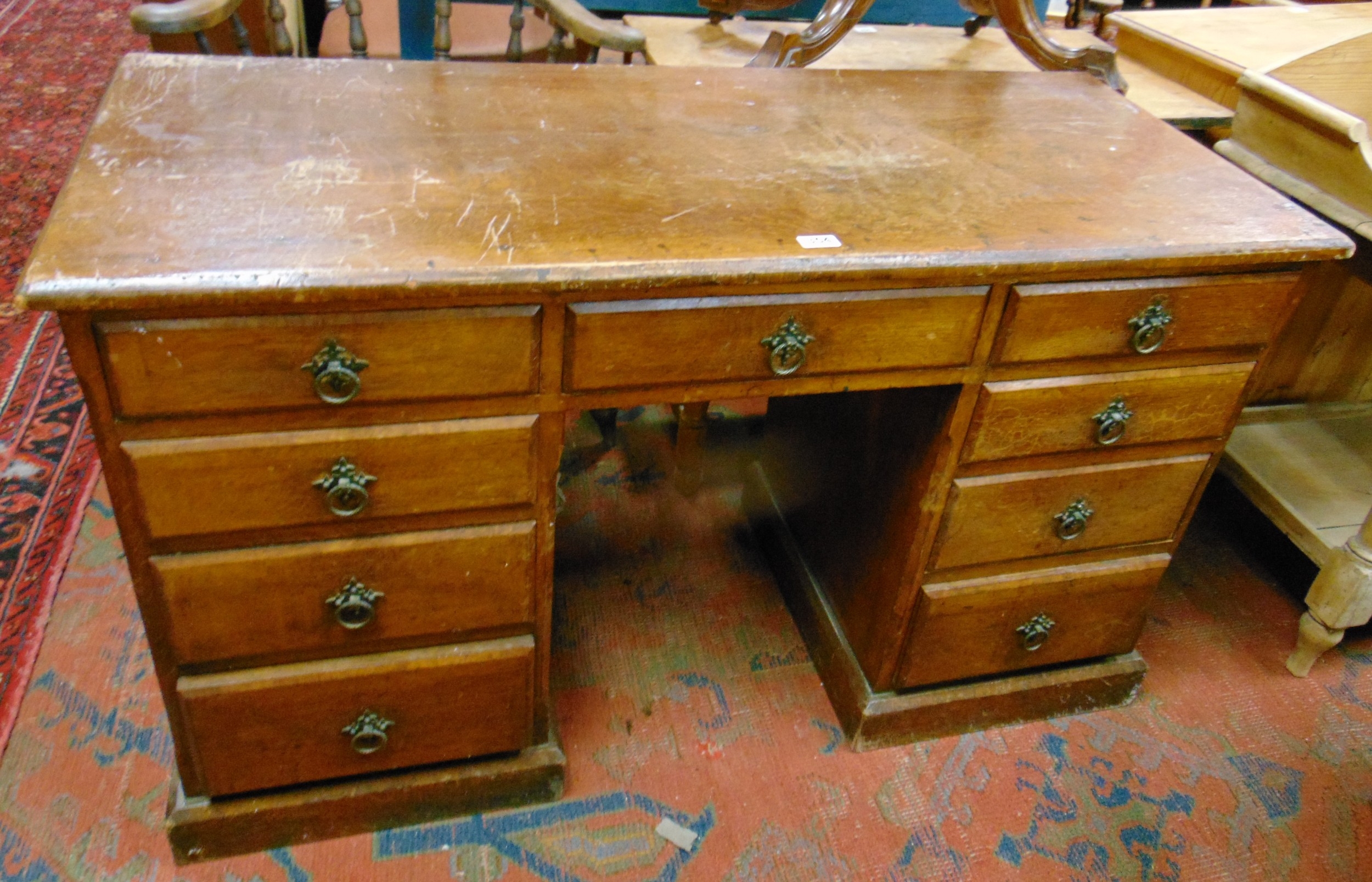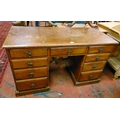 Edwardian oak desk, rectangular top above three short drawers and further three drawers to either side and on platform base, 29 x 49 x 20" deep.