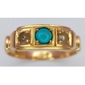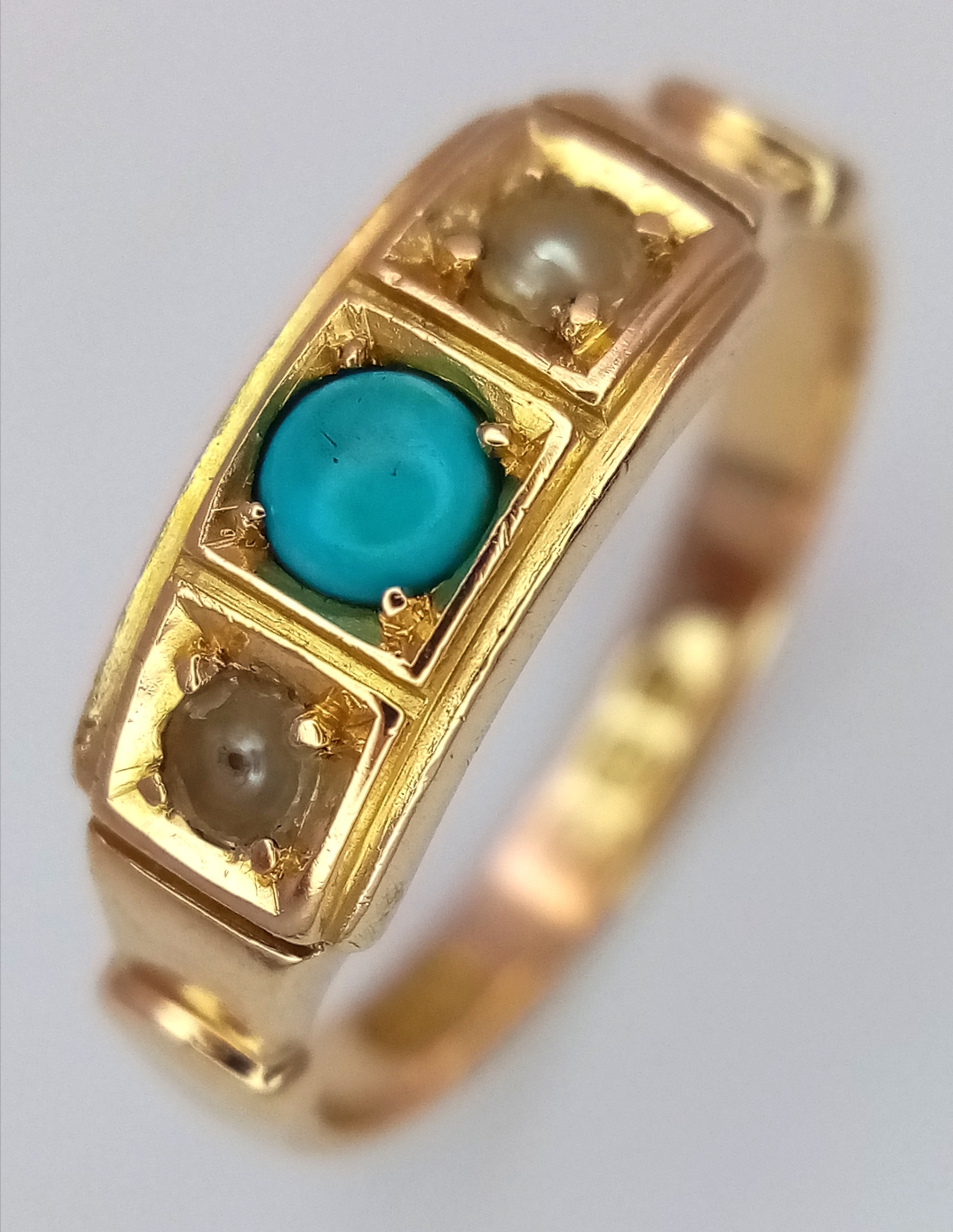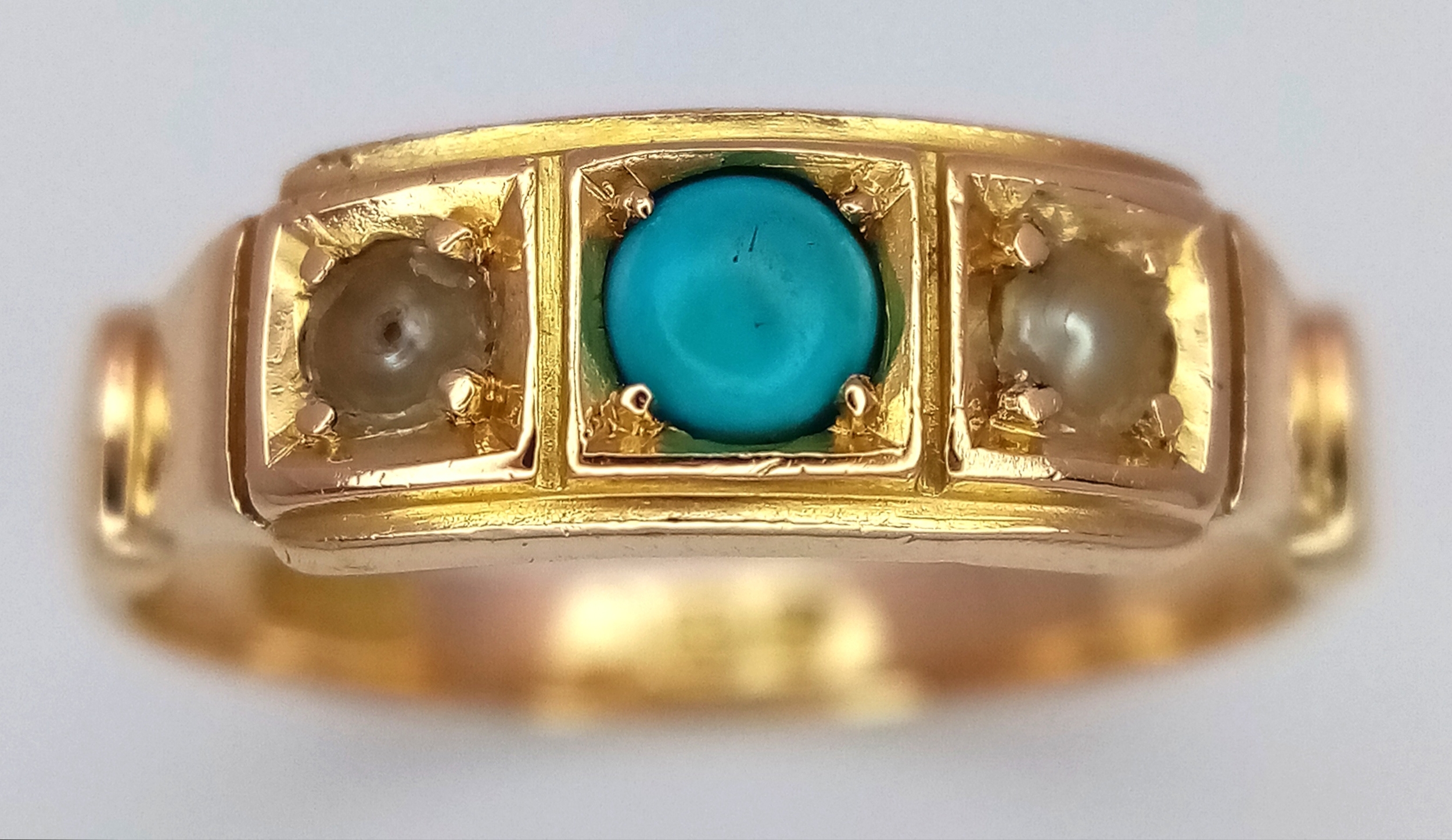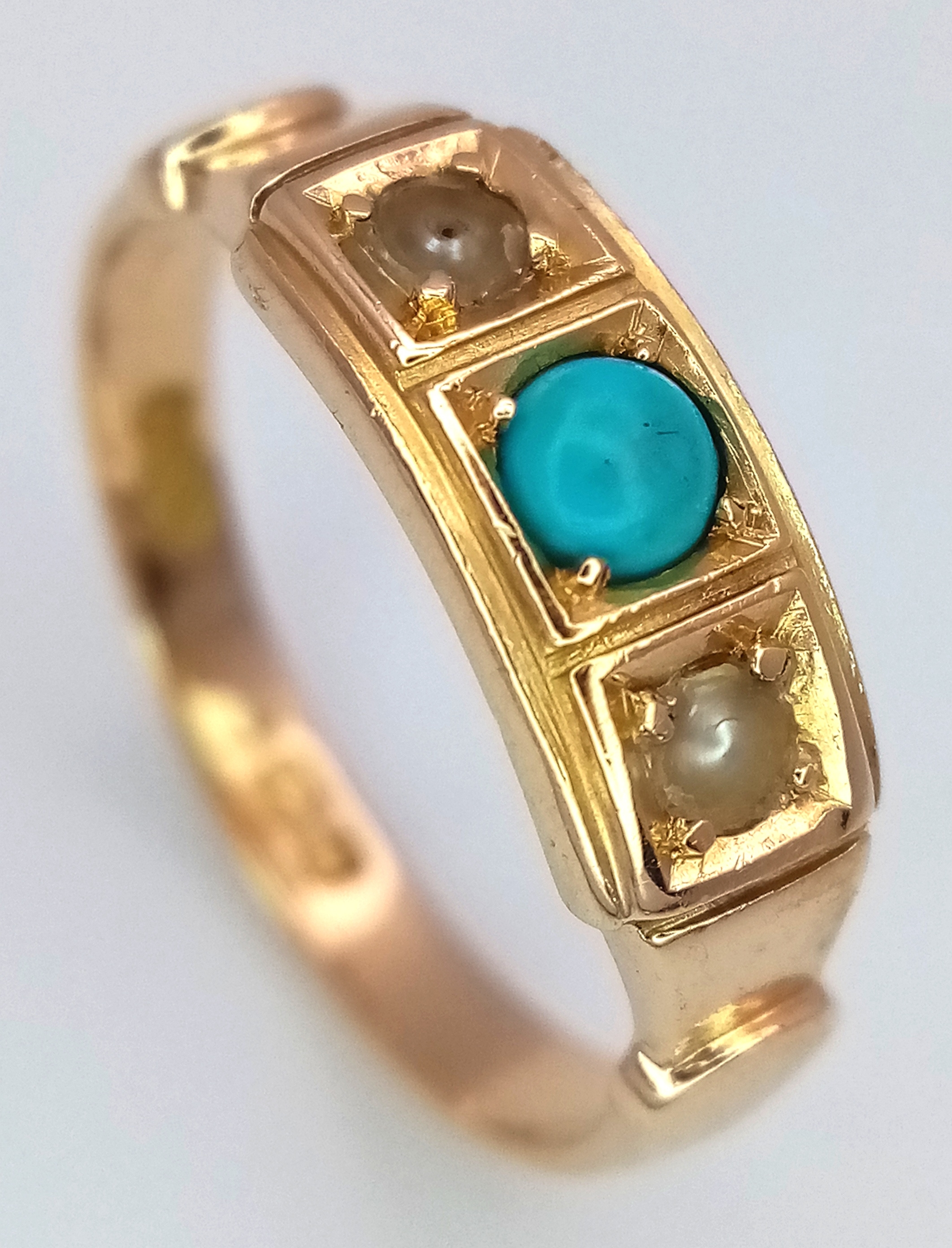 AN 18K YELLOW GOLD, ANTIQUE, PEARL AND TURQUOISE SET RING. 2.6G, SIZE I. HALLMARKED BIRMINGHAM 1908. SC 8046