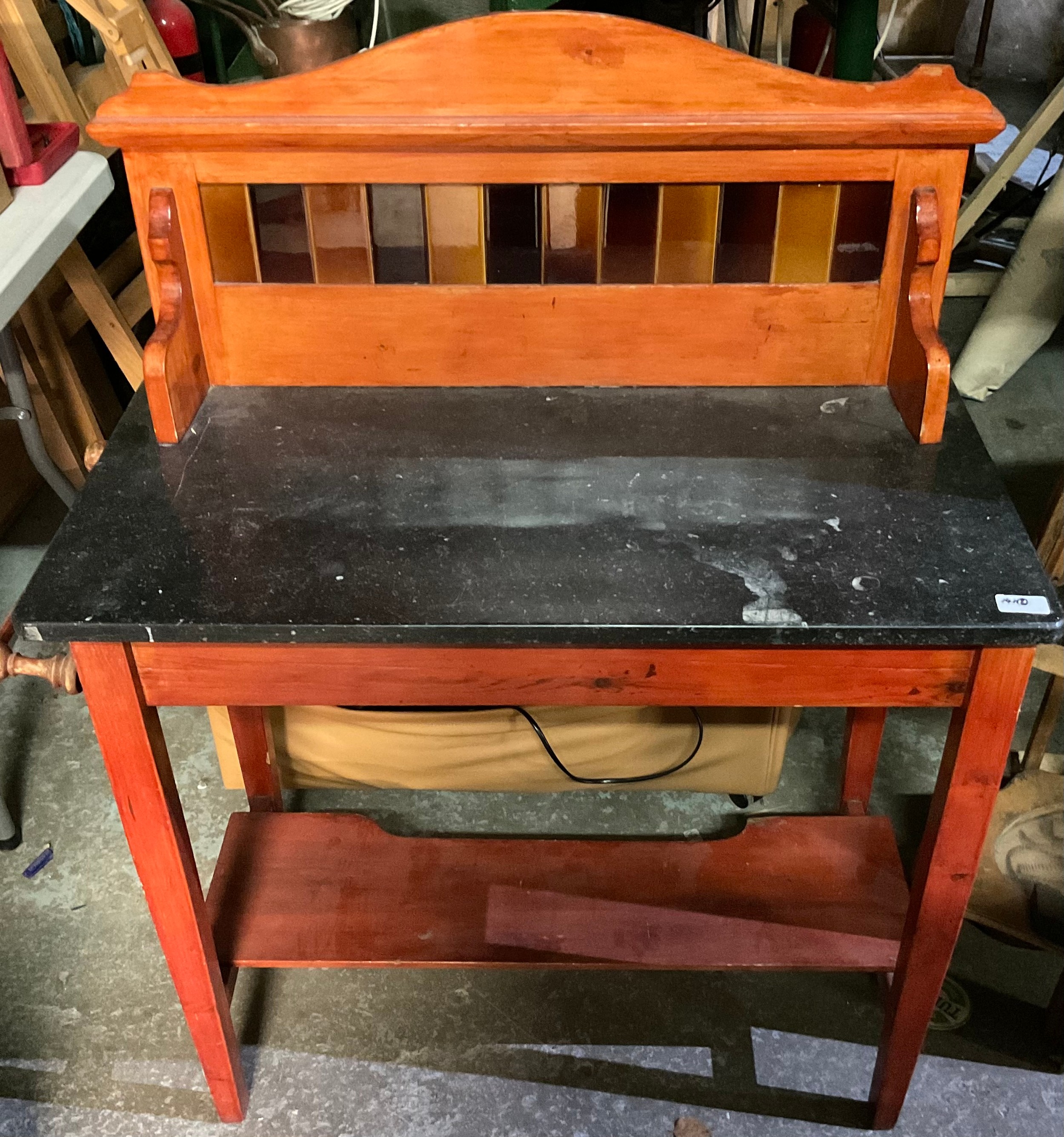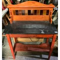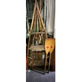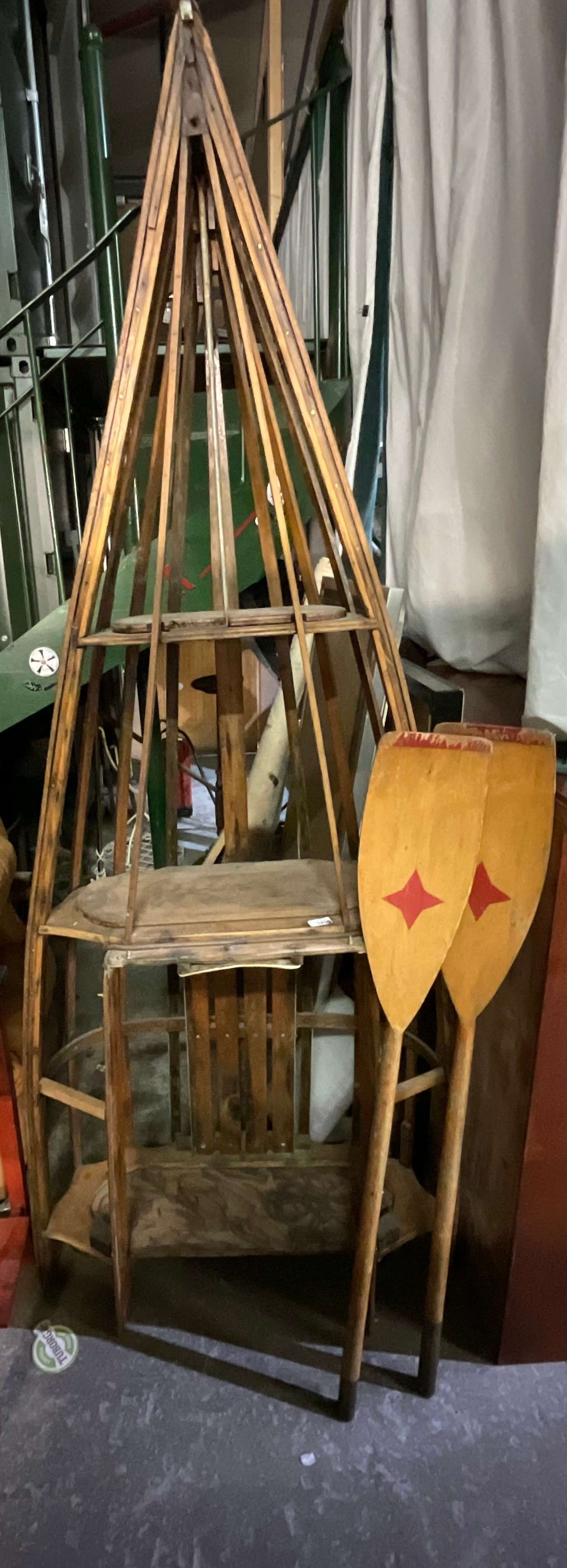 20th Century beech and ply boat frame converted to shelving with two oars and a late 19th century marble topped wash stand (4)