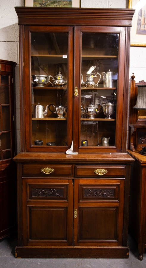 EDWARDIAN MAHOGANY CARVED 2 DOOR BOOKCASE AF 110W X 45D X 228H CM