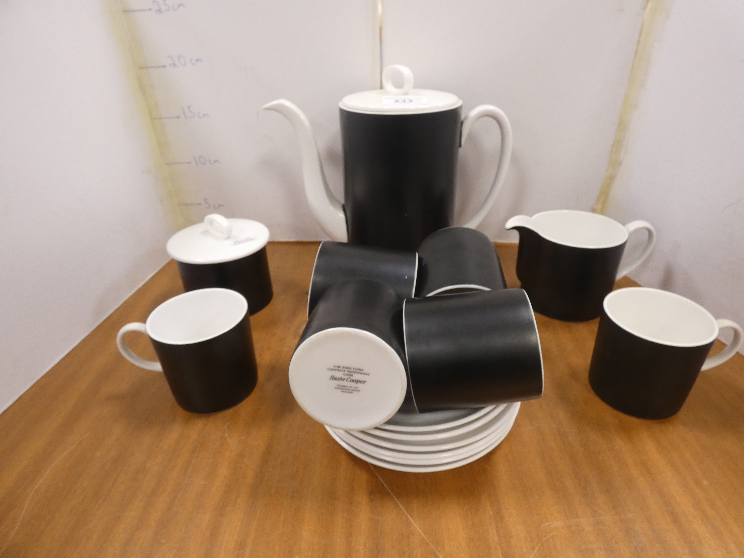 Susie Cooper for Wedgwood 'Contrast' pattern coffee set comprising six cups, six saucers, sugar bowl, cream jug and coffee pot.