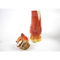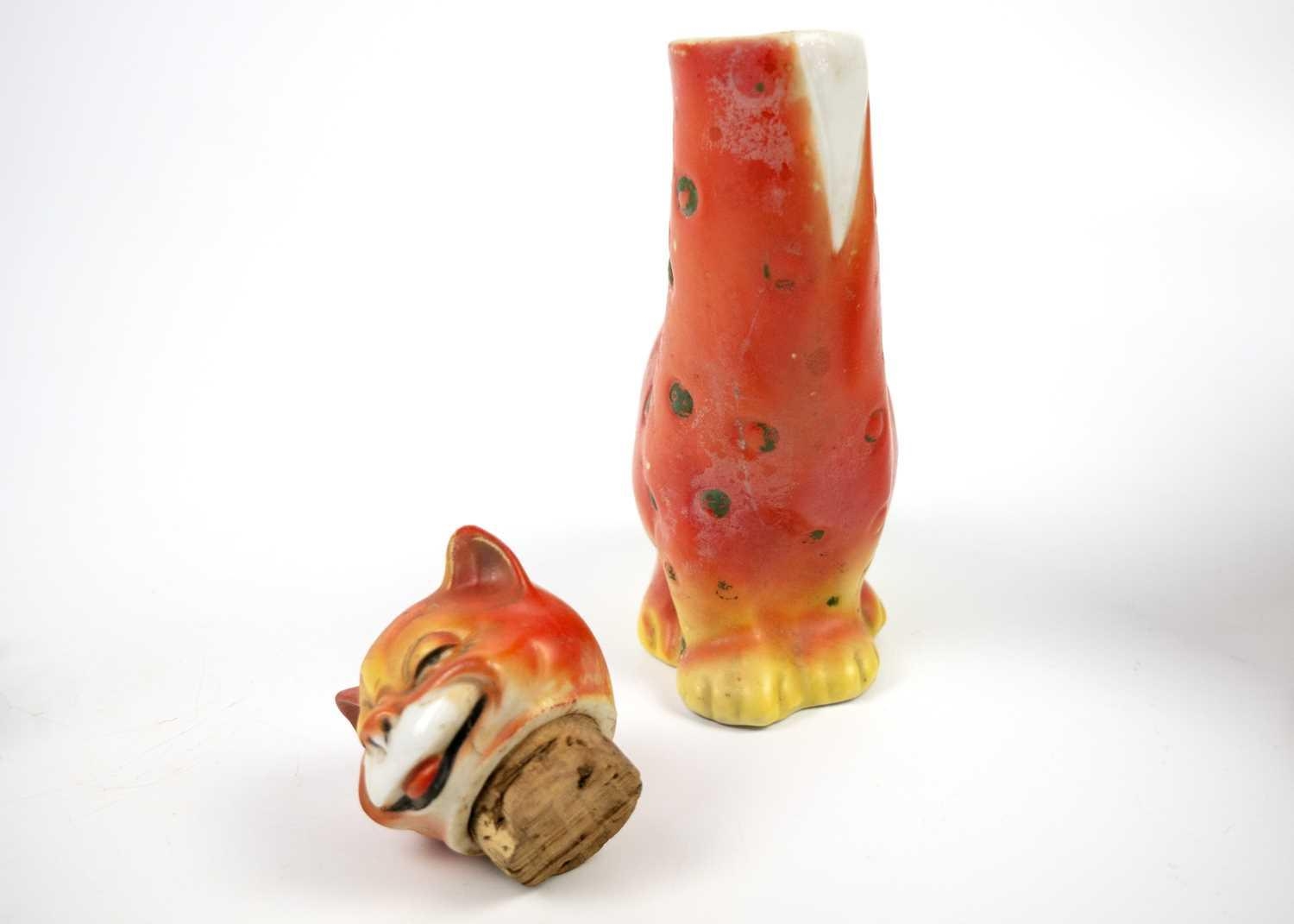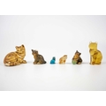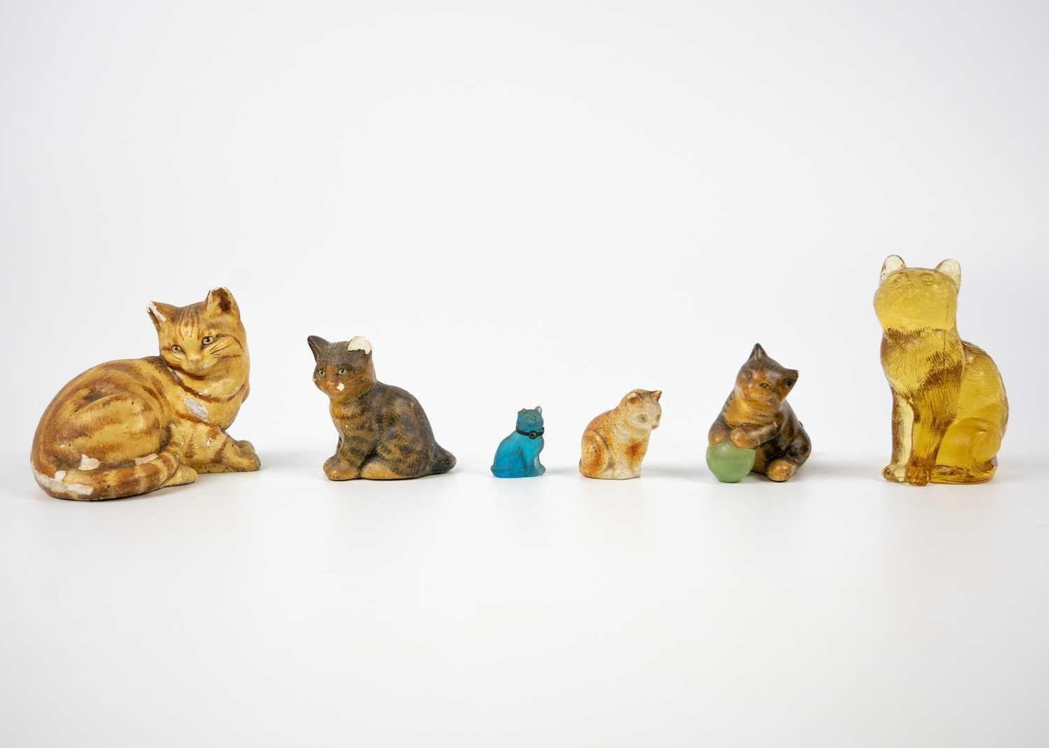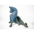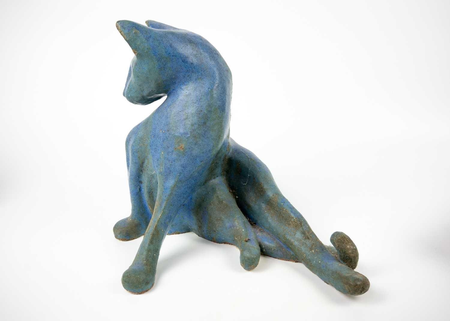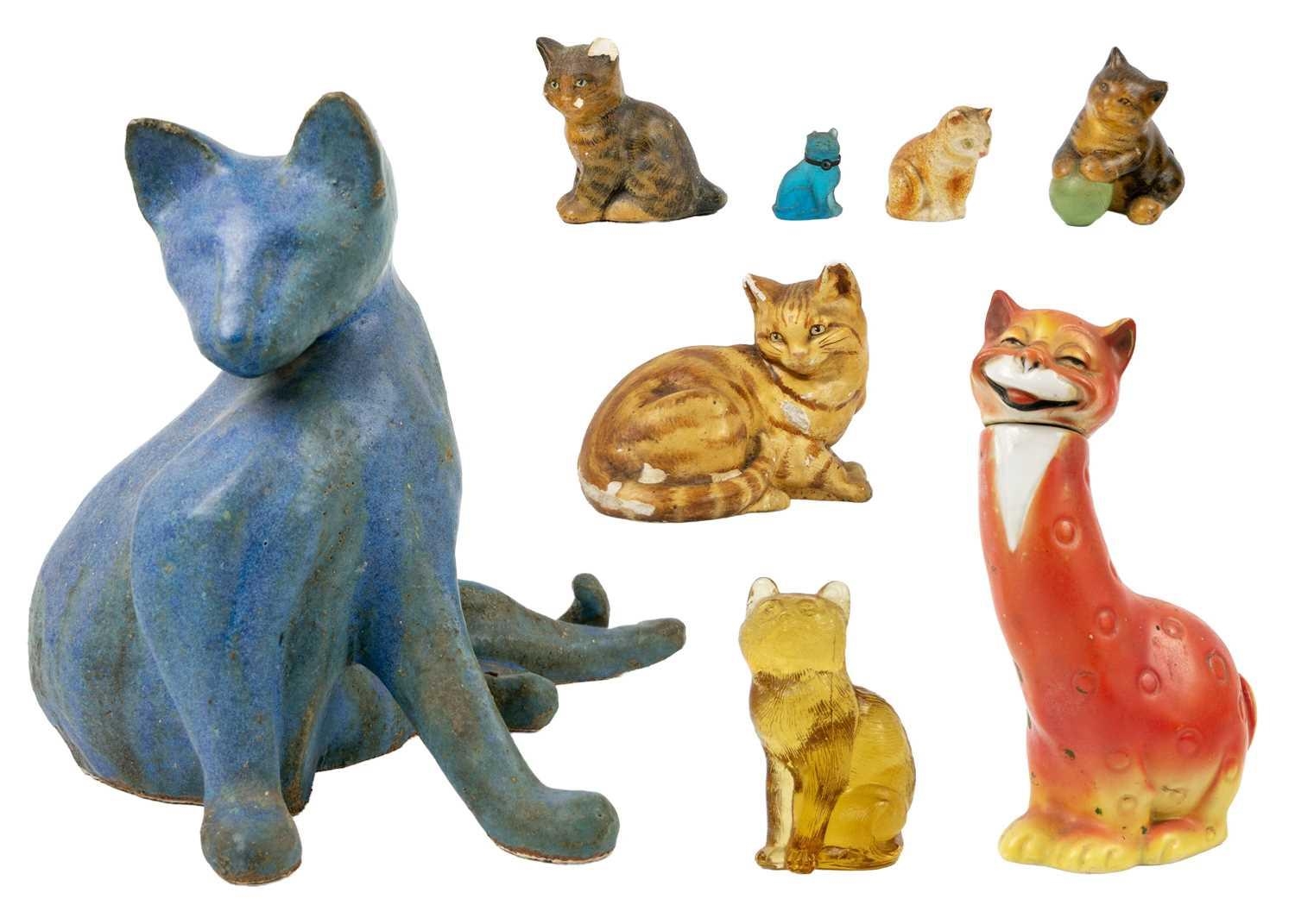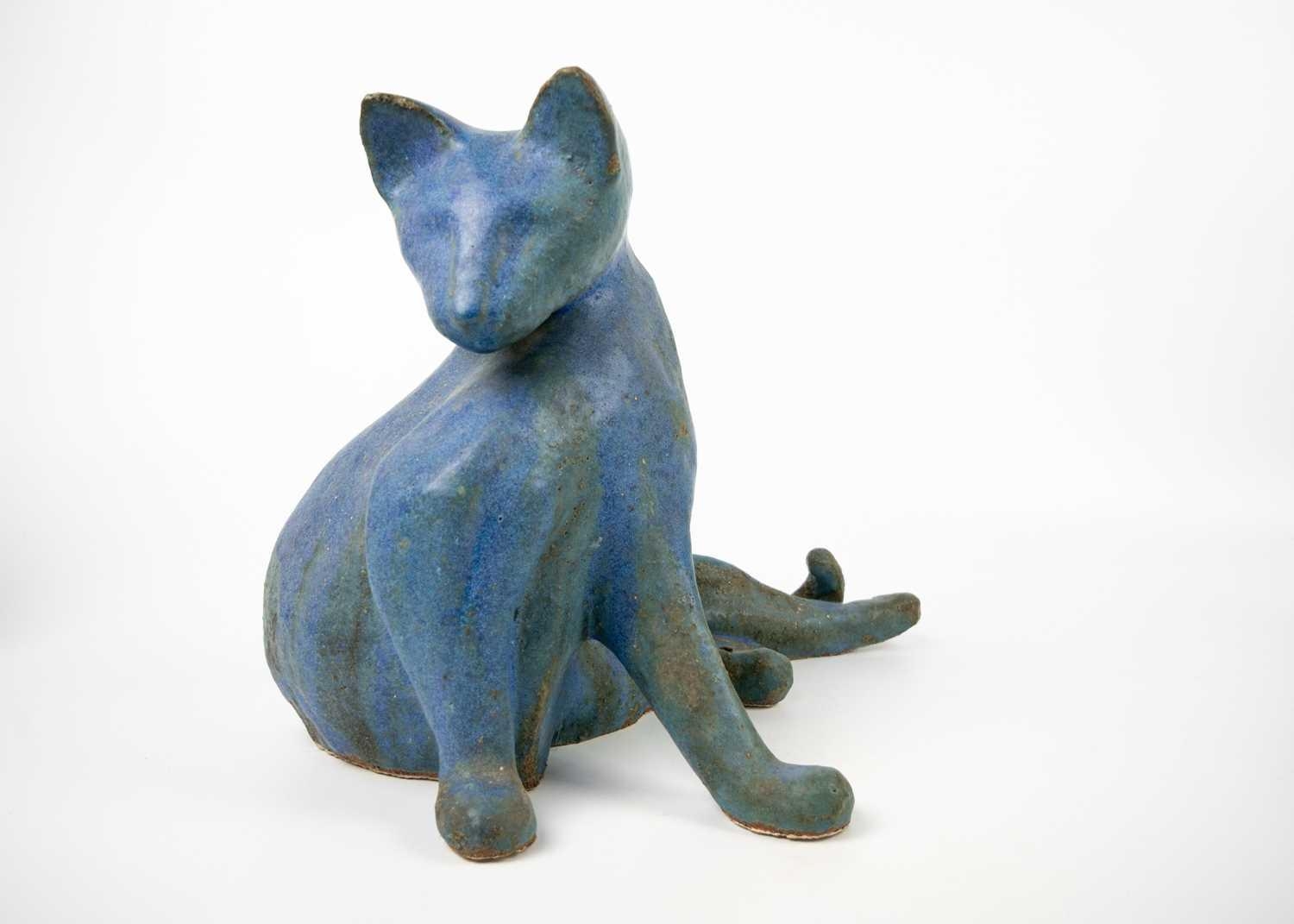 A glazed blue ceramic cat figurine. Height 29cm. Together with seven other various feline figurines.