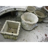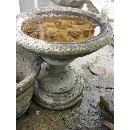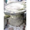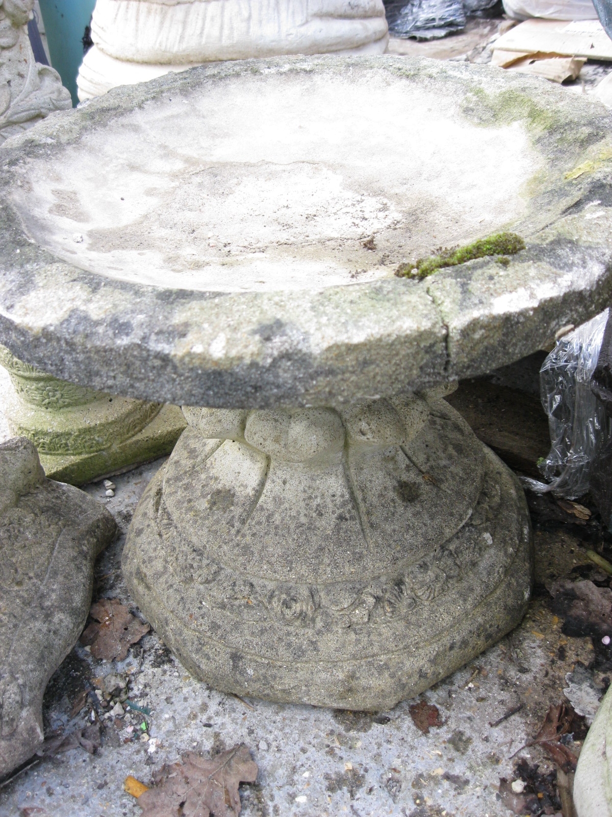 A small stonecrete garden bird bath on pedestal, weathered, some visible cracks to top but solid