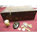 Ivory carved handle in the form of lion carrying a gazelle, 23 various coins and medallions, a miniature brass mask, in a Victorian walnut writing slope (lacking interior)
