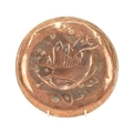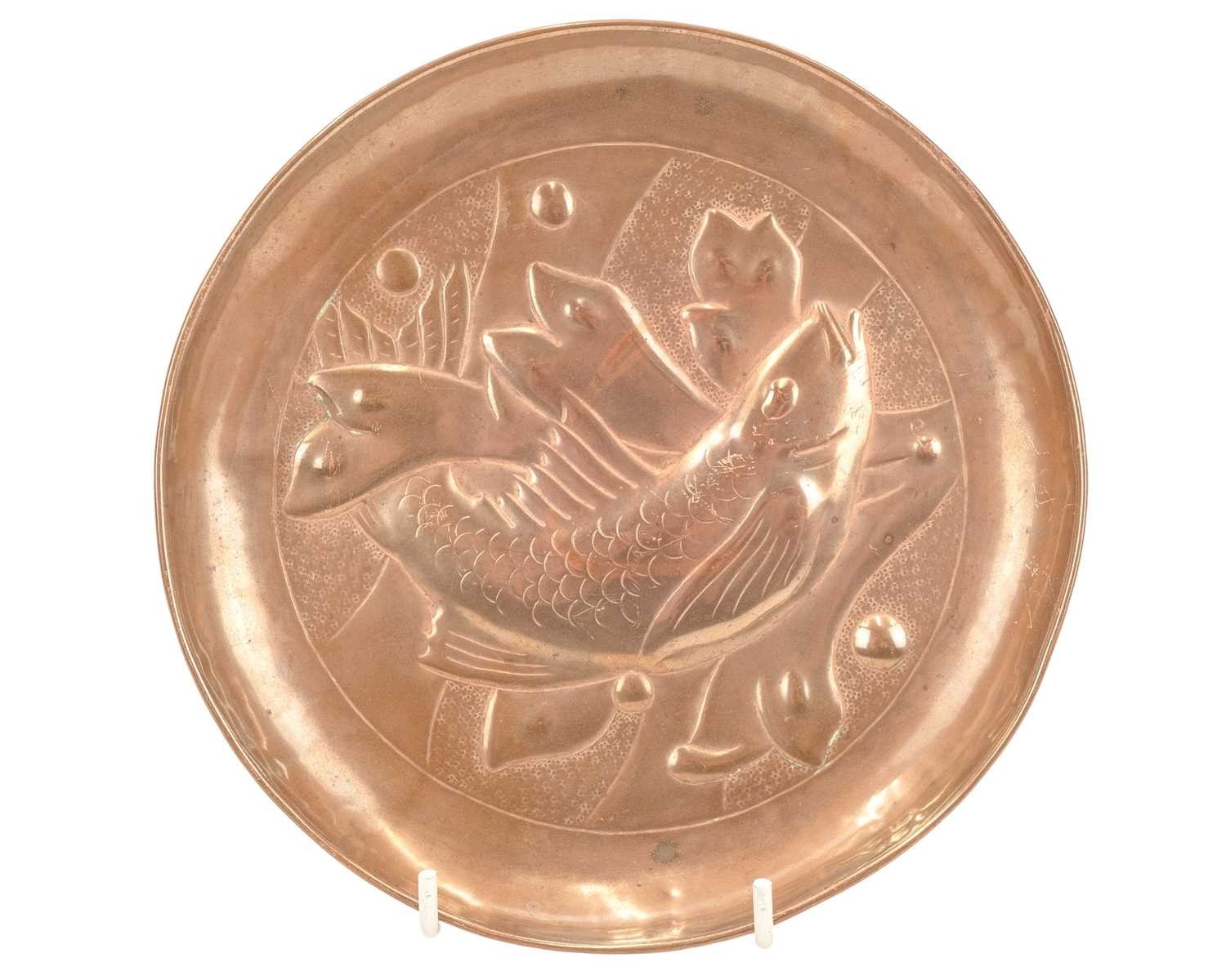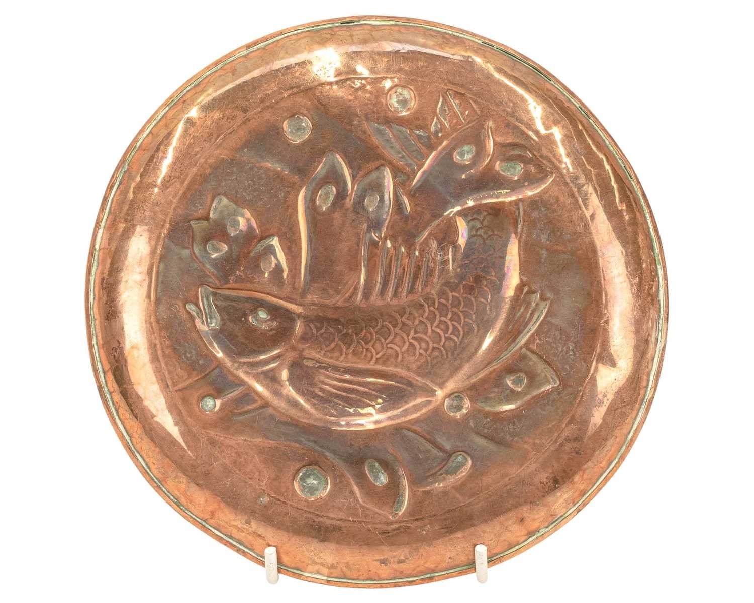A Newlyn copper small circular dish. Repousse decorated with a fish and seaweed, apparently unmarked, diameter 16.5cm.