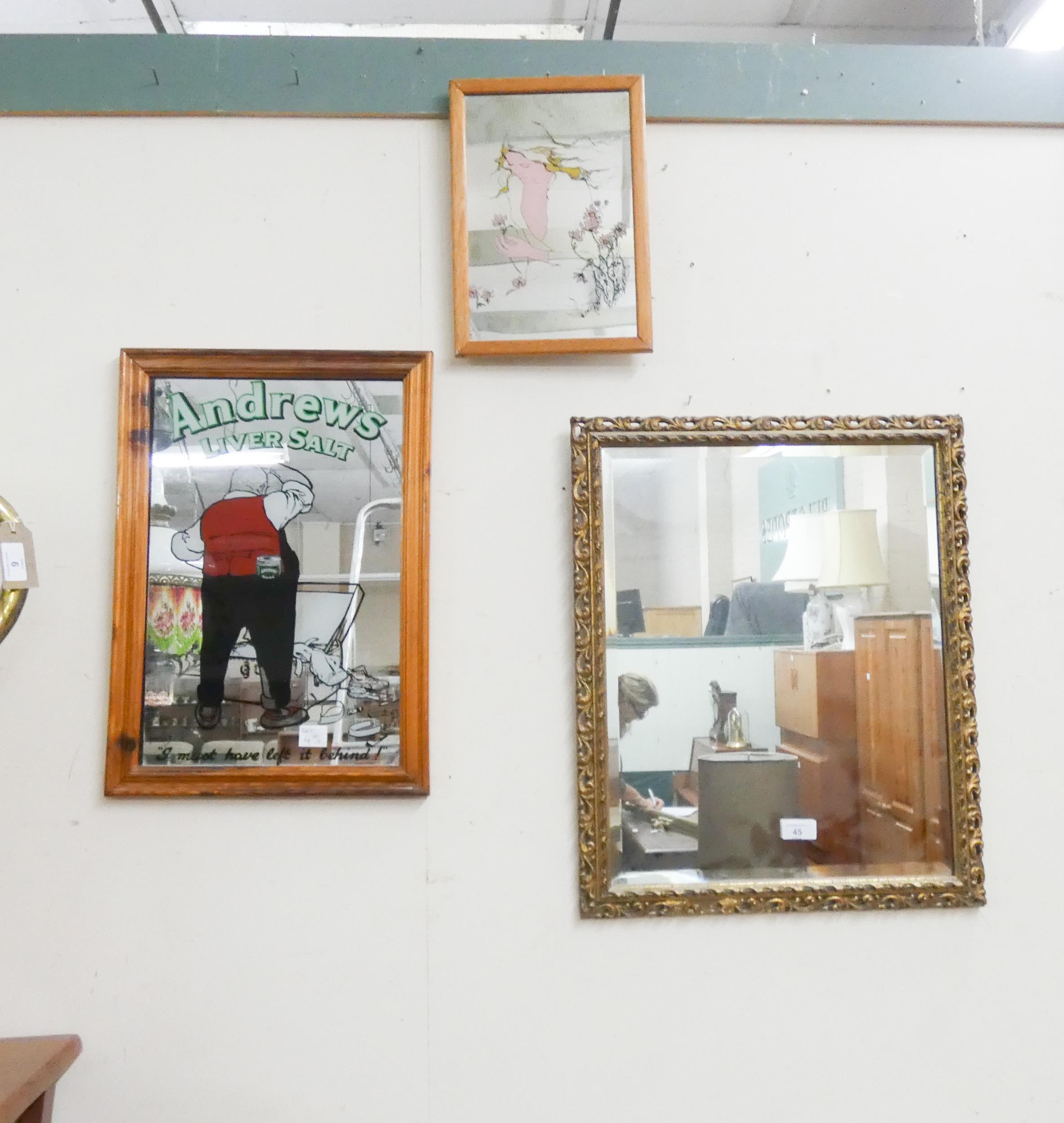 A bevelled mirror in gilt frame, advertising mirror and one other
