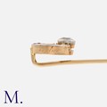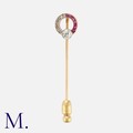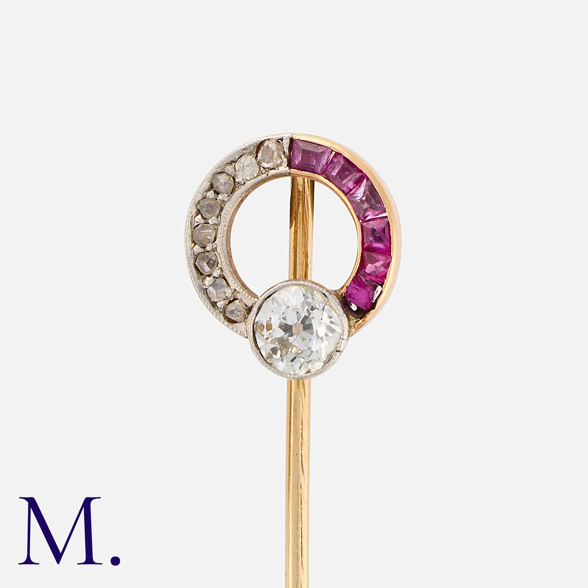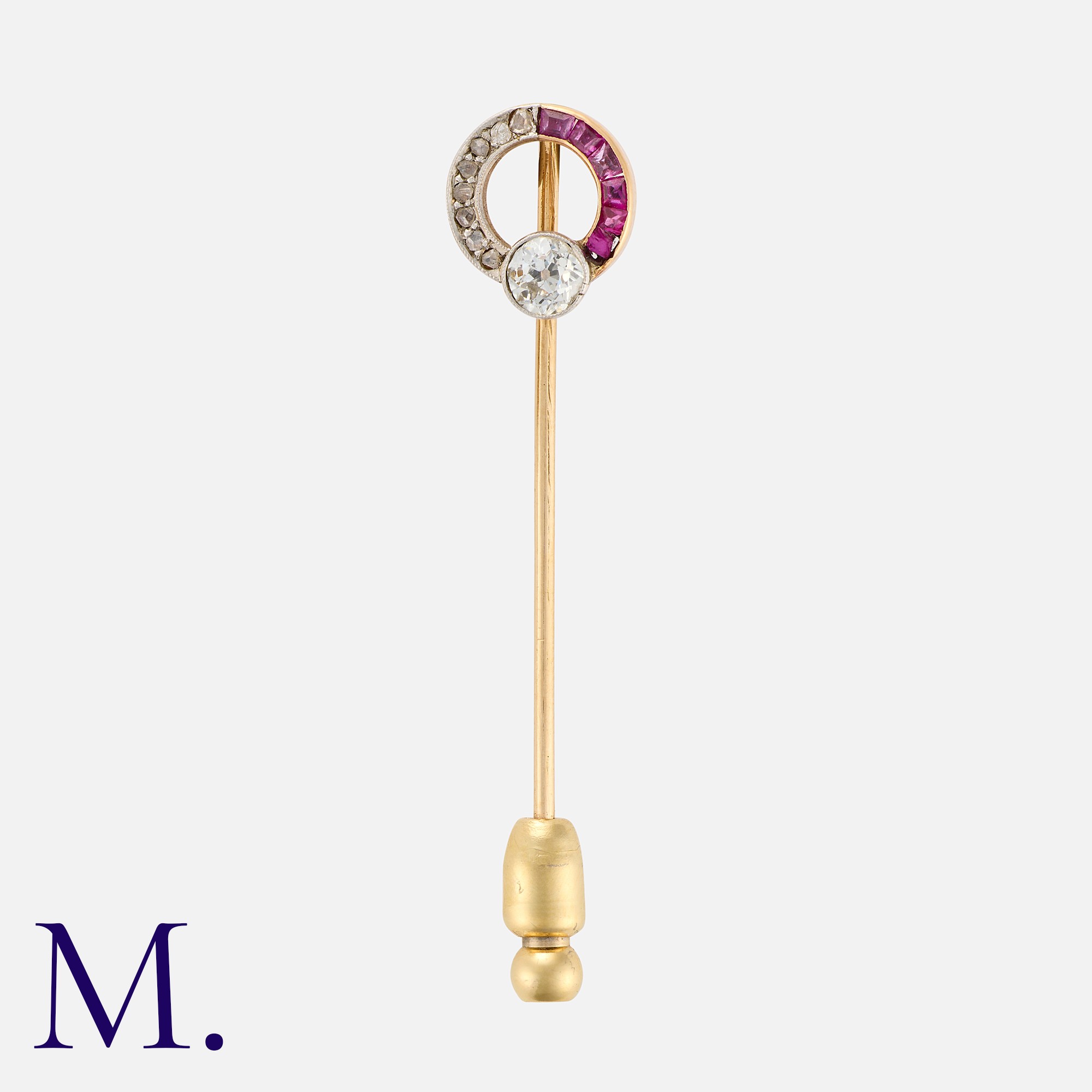 A Ruby and Diamond Stick Pin in yellow gold, the terminal designed as an open circle, set with an old cut diamond of approximately 0.25 carats, one side set with calibre cut rubies, the other with rose cut diamonds. Signed Cartier. Unmarked, tests indicate 18 carat gold.