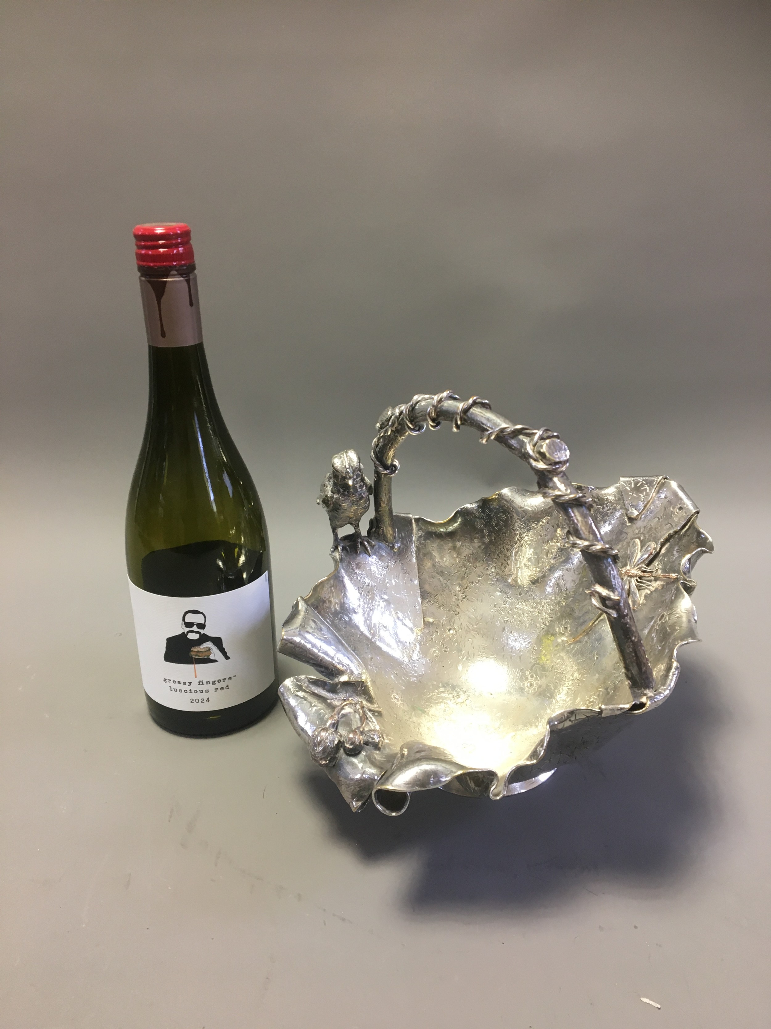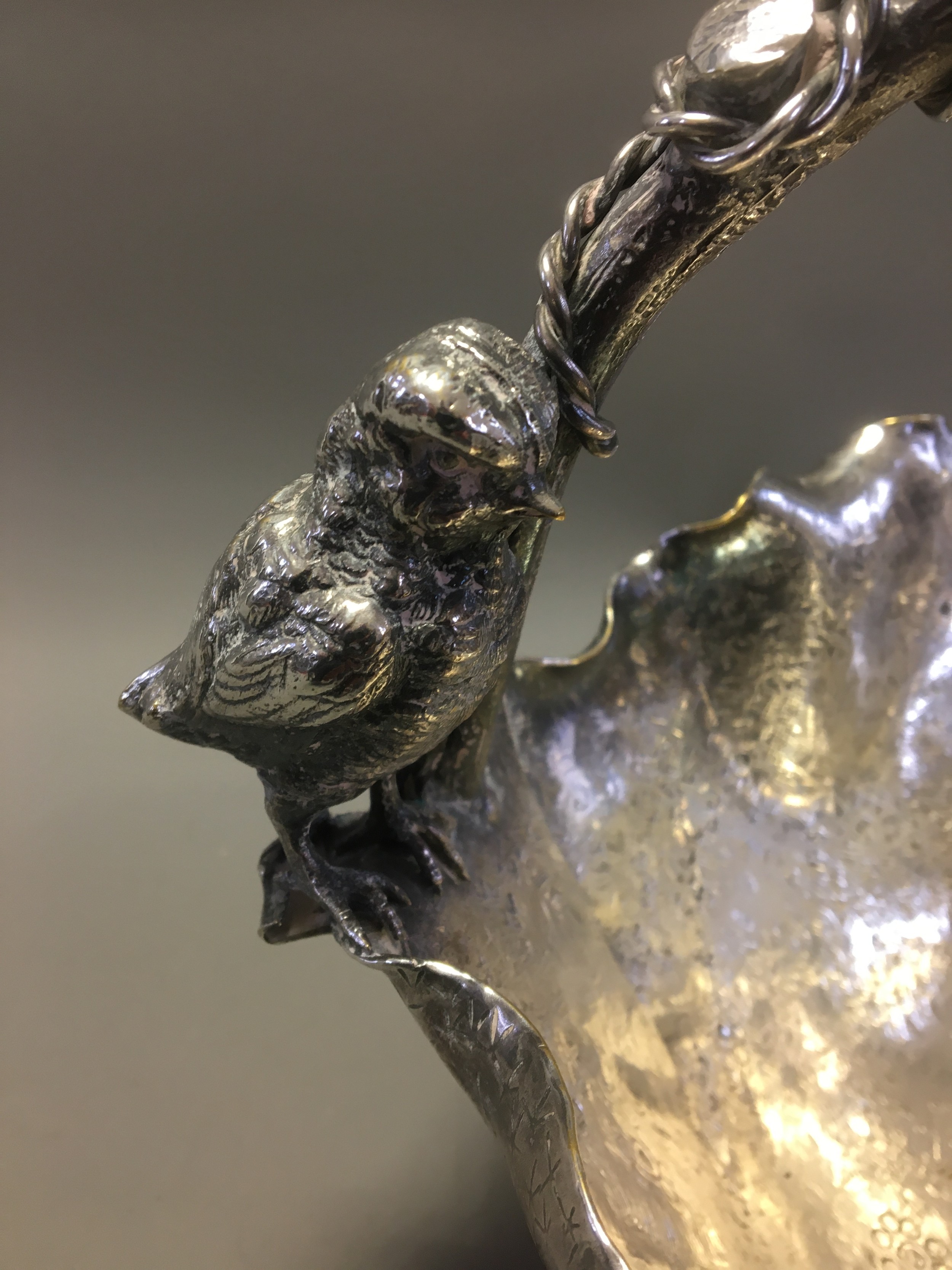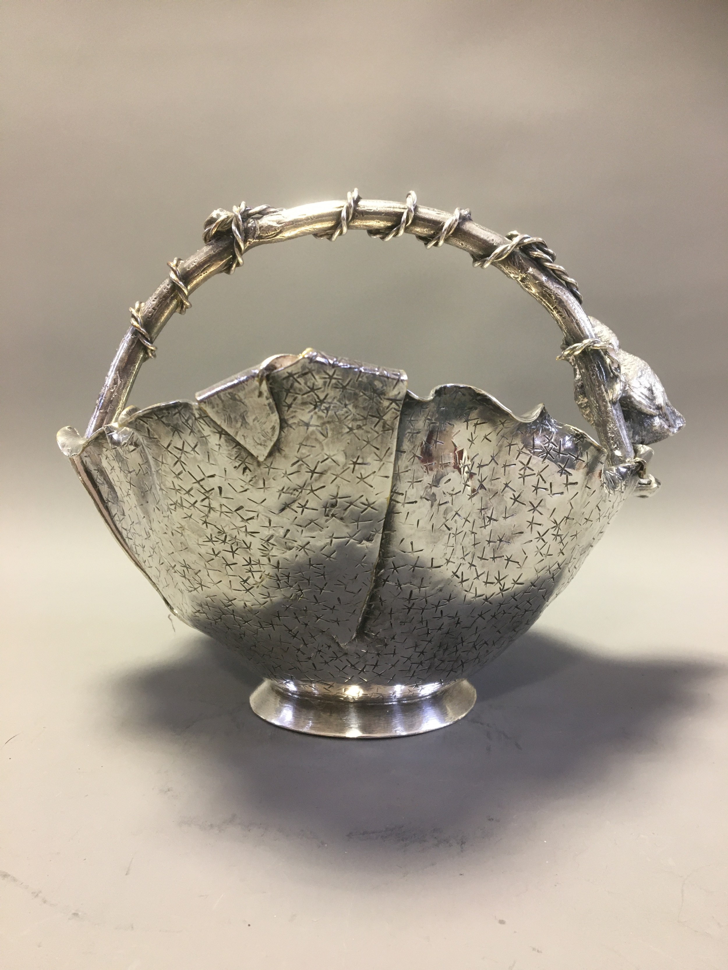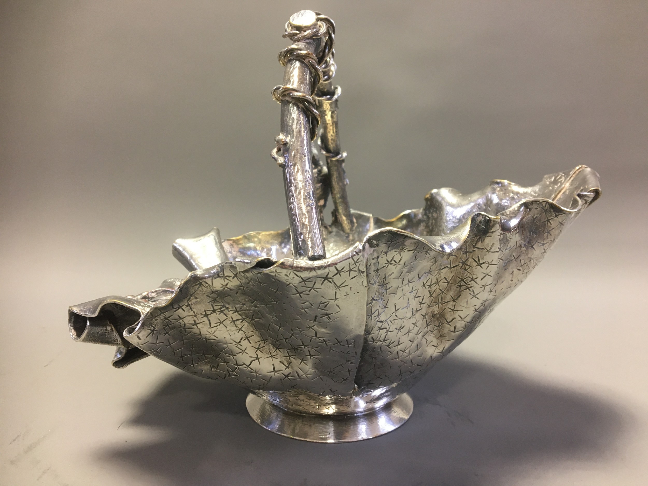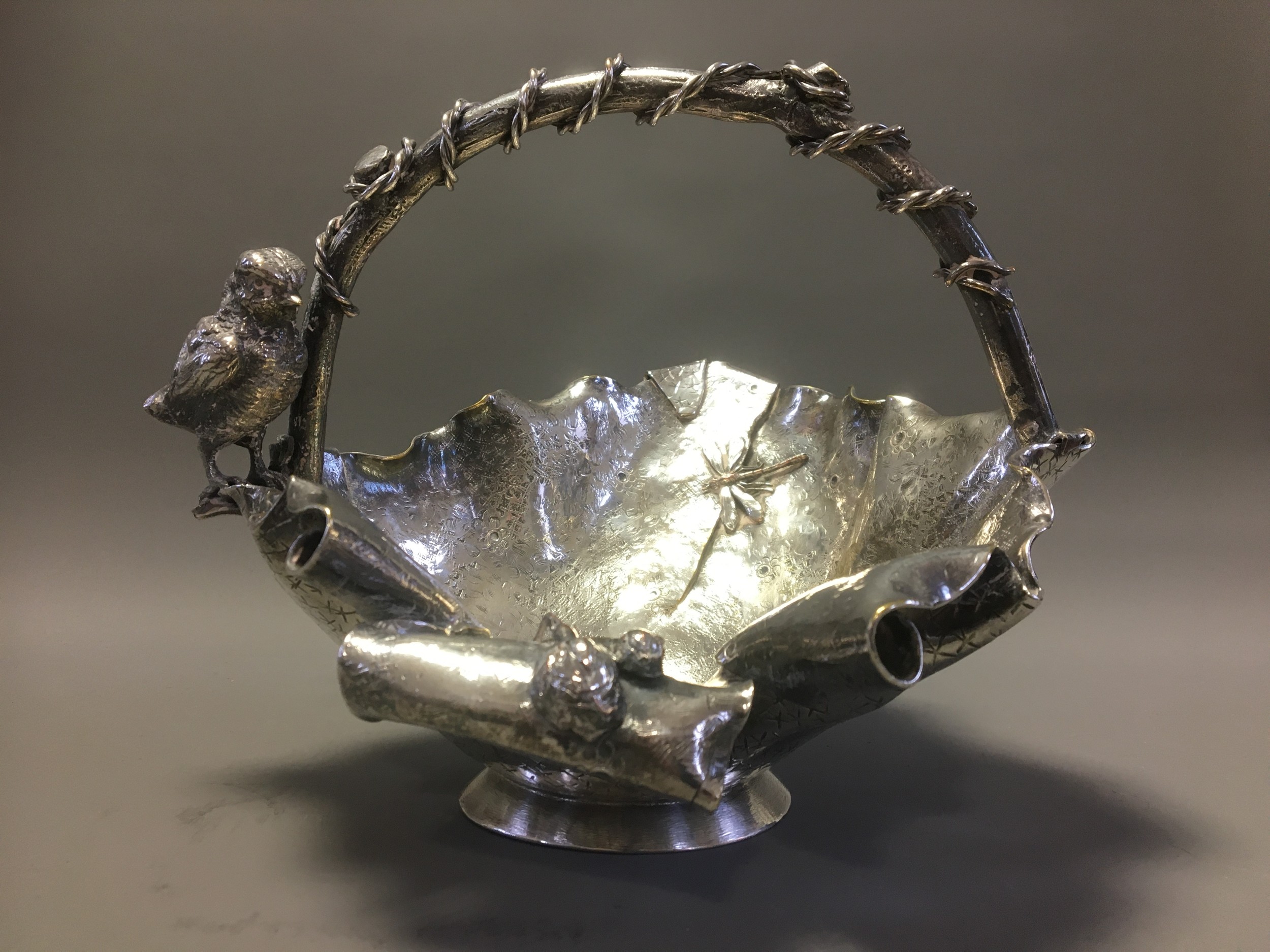 Highly Unusual Silver Plate on Copper and Brass 19th Century Aesthetic Period Basket Form Centre Piece having Bird, Dragonfly and Bamboo Decoration Throughout.