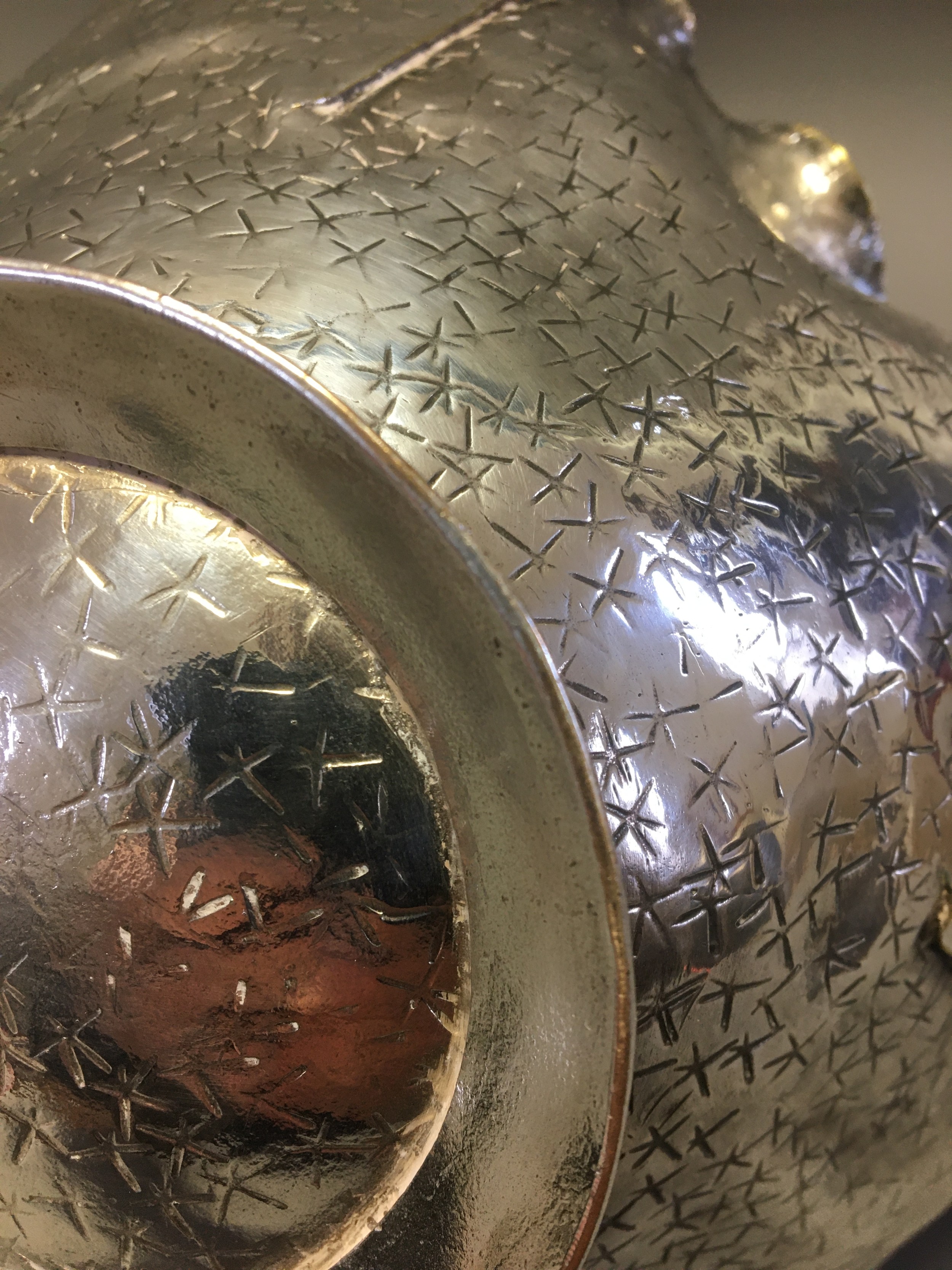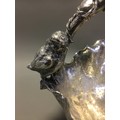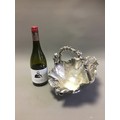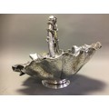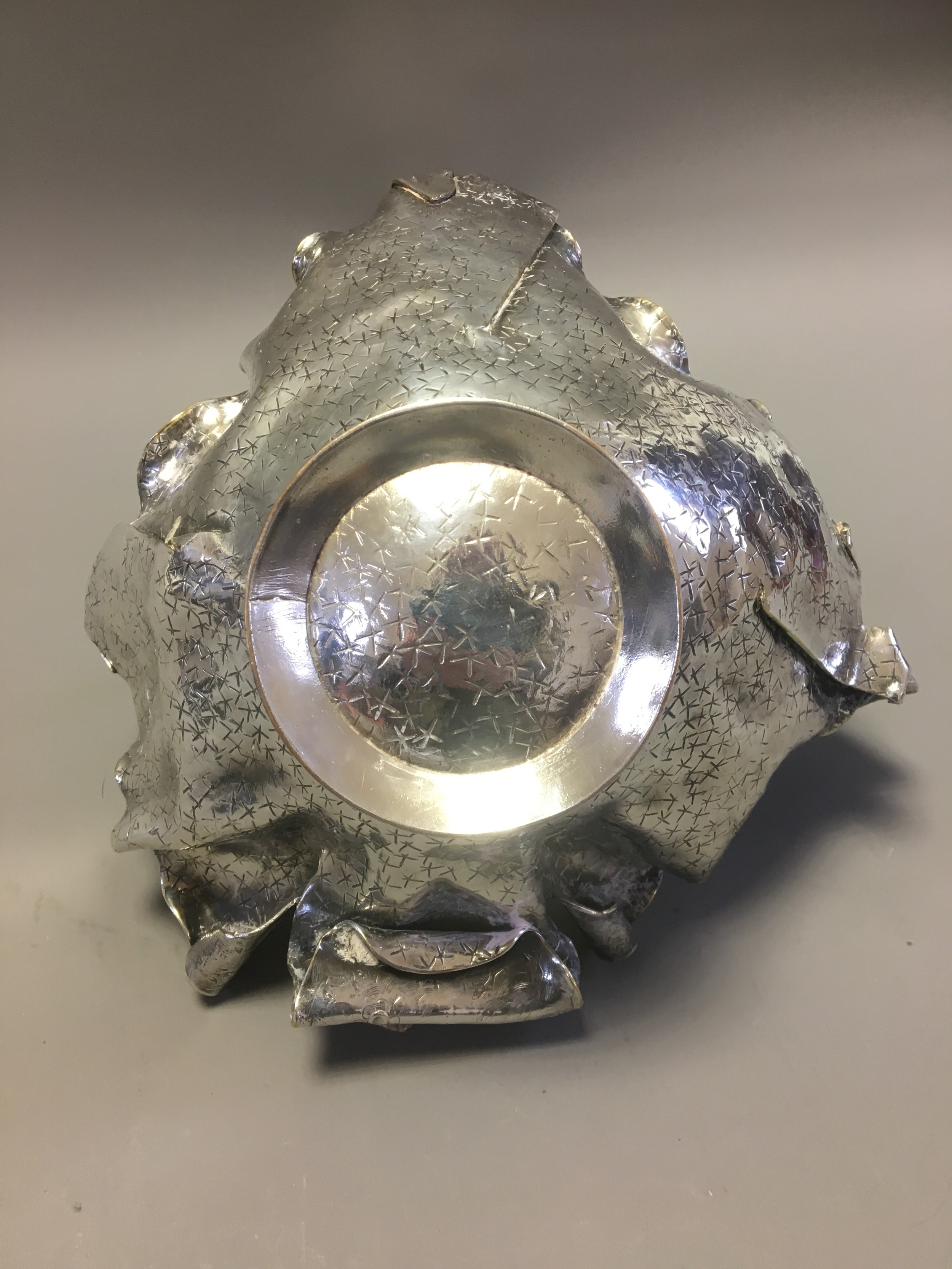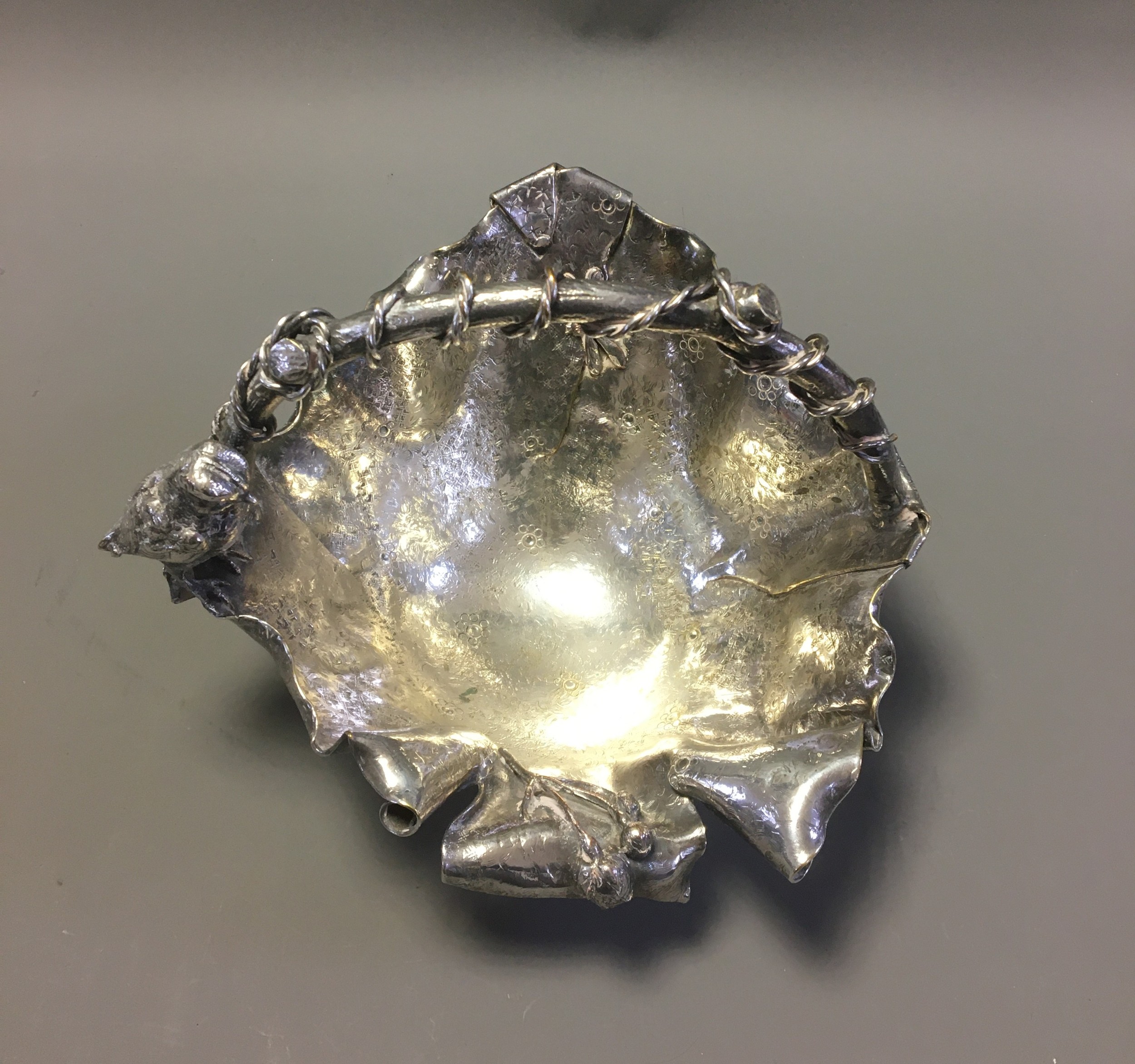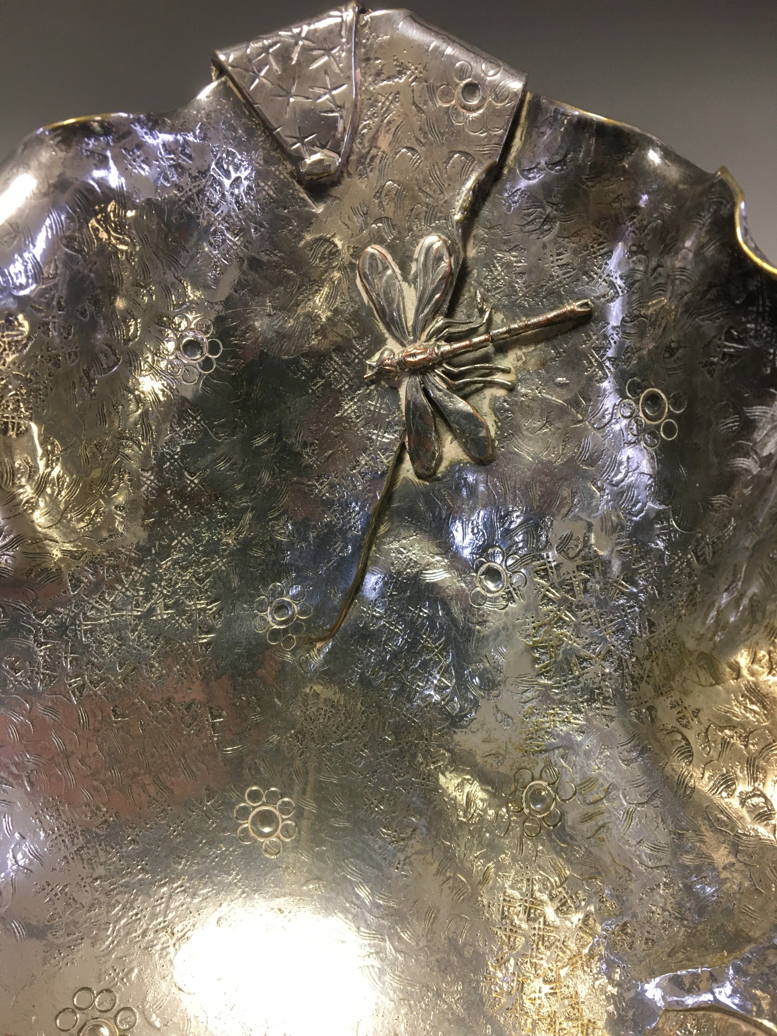 Highly Unusual Silver Plate on Copper and Brass 19th Century Aesthetic Period Basket Form Centre Piece having Bird, Dragonfly and Bamboo Decoration Throughout.