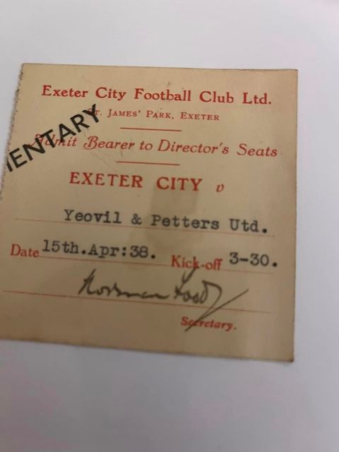 15/04/1938 Ticket - Exeter City Reserves v Yeovil & Petters United, Directors Complimentary Ticket. VGC