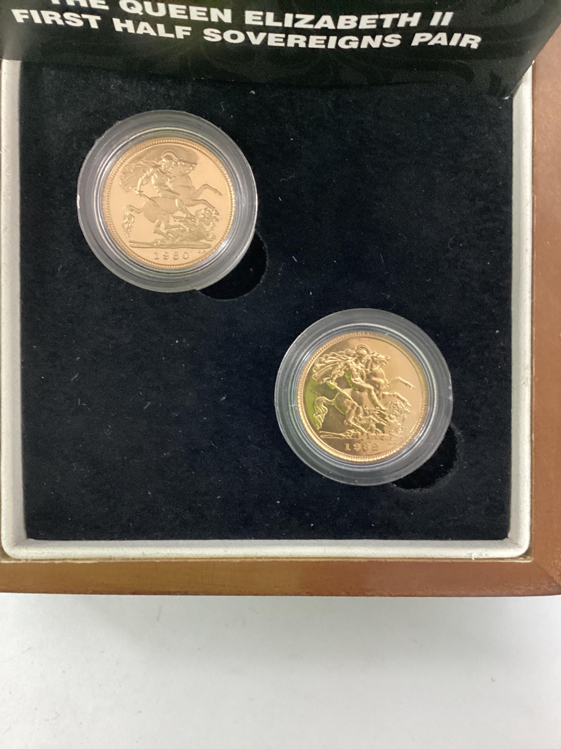 London Mint QEII Gold Half Sovereign Two Coin Set, 1980 proof and a 1982 uncirculated, cased with a certificate of authenticity.