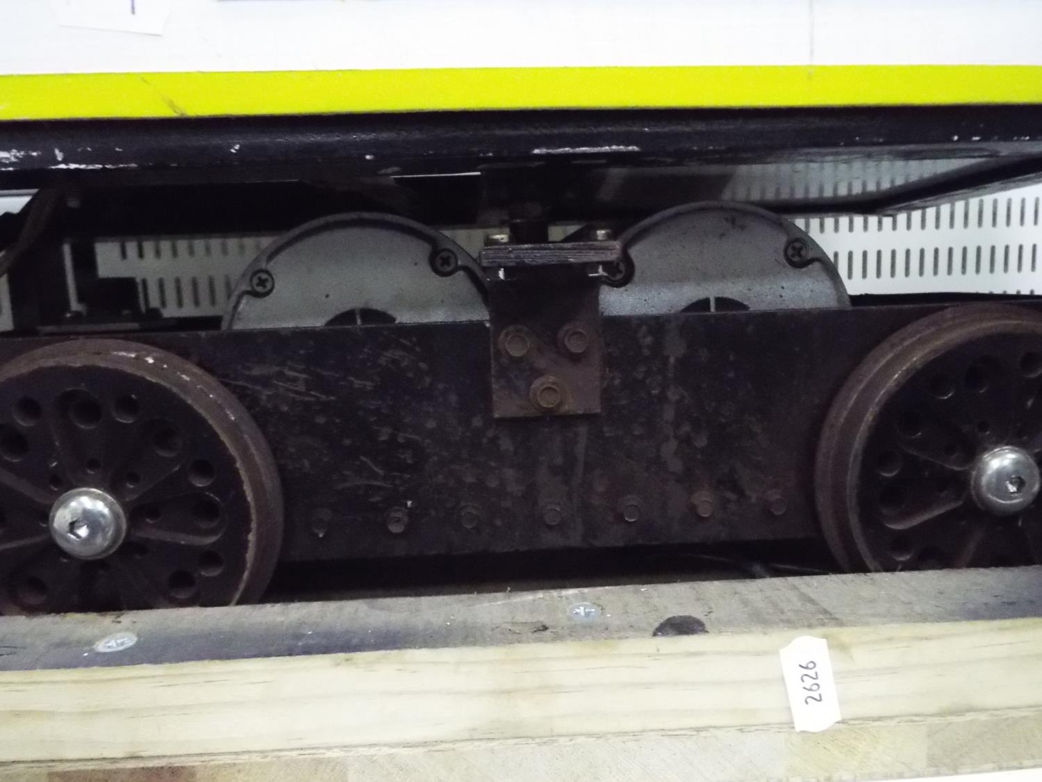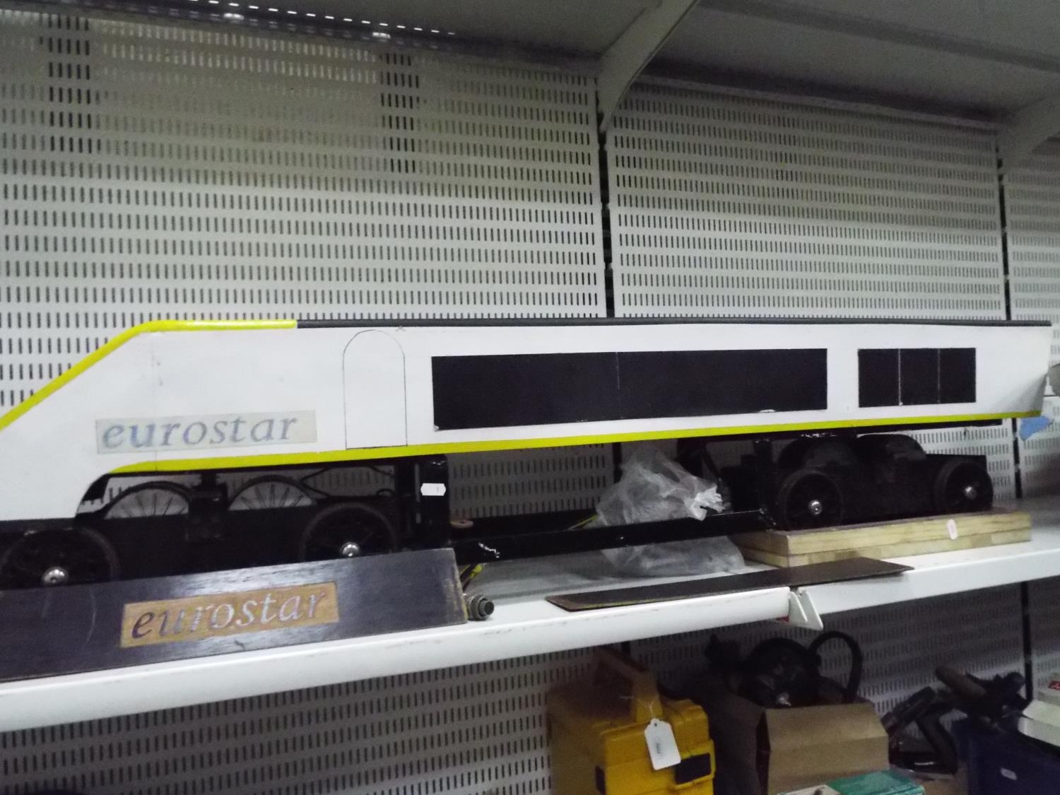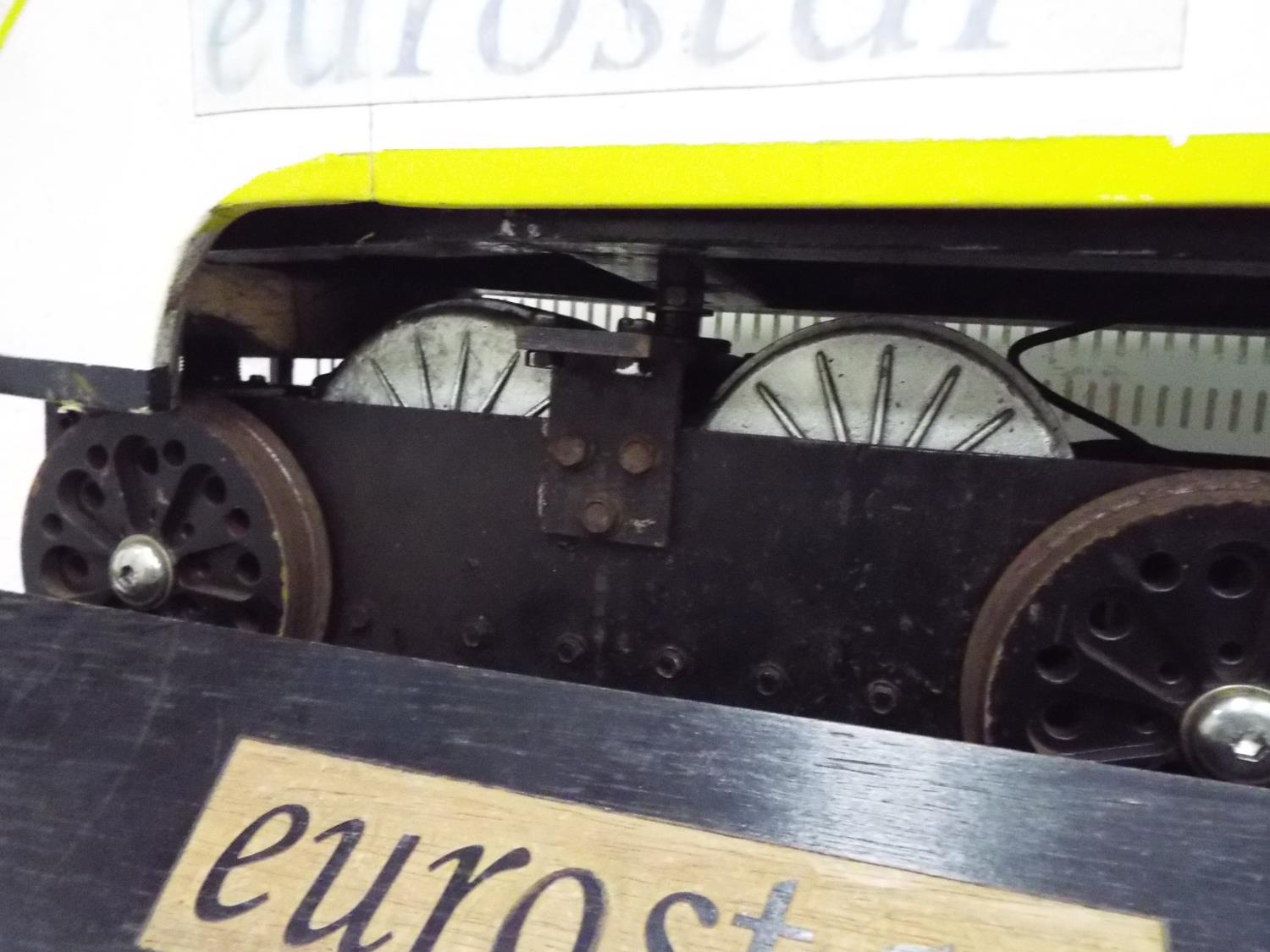 Large scratch built model of a Eurostar train with twin electric motors. Wooden body on steel frame, working condition unknown. 54 inches long
