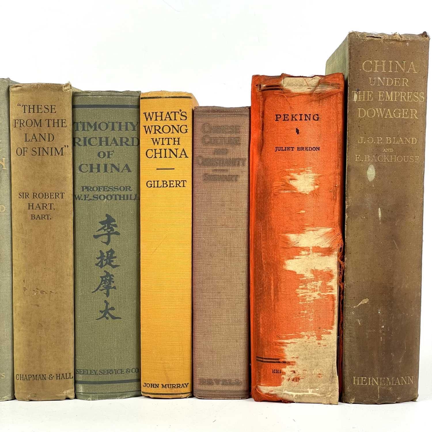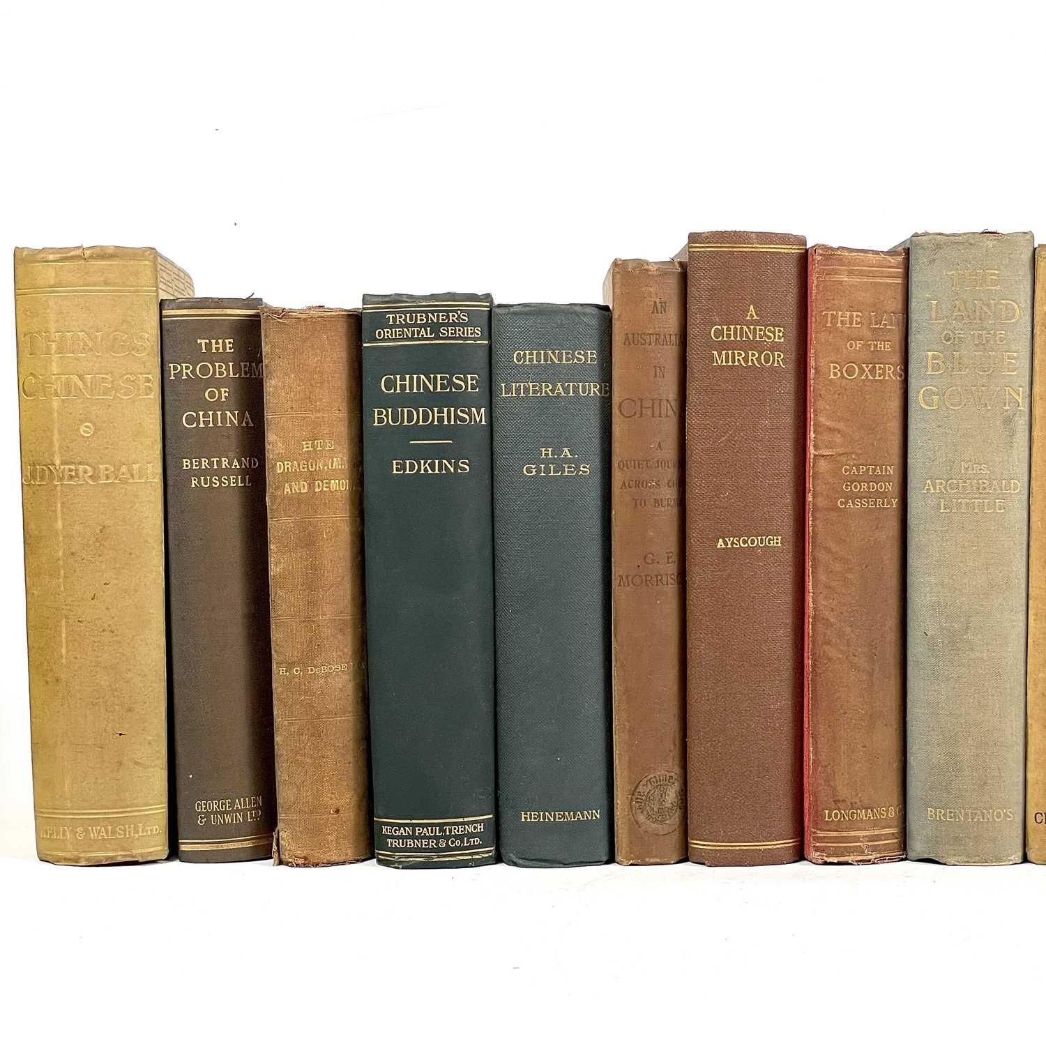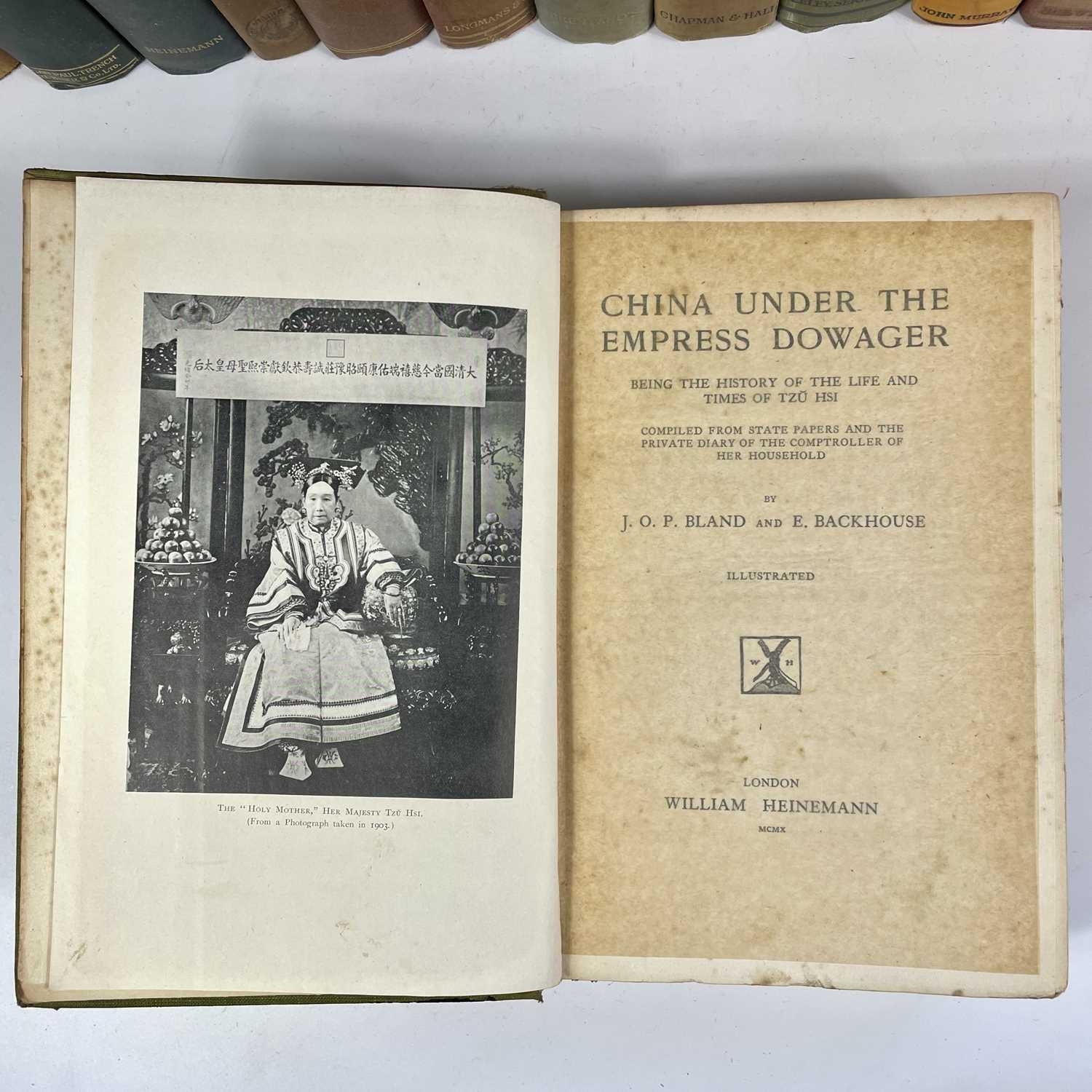 Fifteen books about the history and culture of China. J. O. P. BLAND and E. BACKHOUSE. 'China Under the Empress Dowager Being the History of the Life and Times of Tzu Hsi,' second impression, original cloth, sun bleaching to spine, some spotting throughout, frontis and plates, William Heinman, London, 1910; FLORENCE AYSCOUGH. 'A Chinese Mirror Being Reflections of the Reality behinnd Appearance,' first edition, original cloth, Jonathan Cape, 1925; GEORGE ERNEST MORRISON. 'An Australian in China,' third edition, original cloth, plates and frontis, Horace Cox, London, 1902; Capt GORDON CASSERLY. 'The Land of the Boxers,' original cloth, spotting throughout, frontis, Longmans, Green, and Co, London, 1903; BERTRAND RUSSELL. 'The Problem with China,' first edition, original cloth, spotting throughout, George Allen & Unwin, London, 1922; Rev HAMPDEN C. DuBOSE. 'the Dragon, Image, and Demon or The Three Religons of China...,' original cloth, sunbleached and stained, A. C. Armstrong & Son, New York, 1887; With nine other books about Chinese history and culture. (15)
