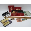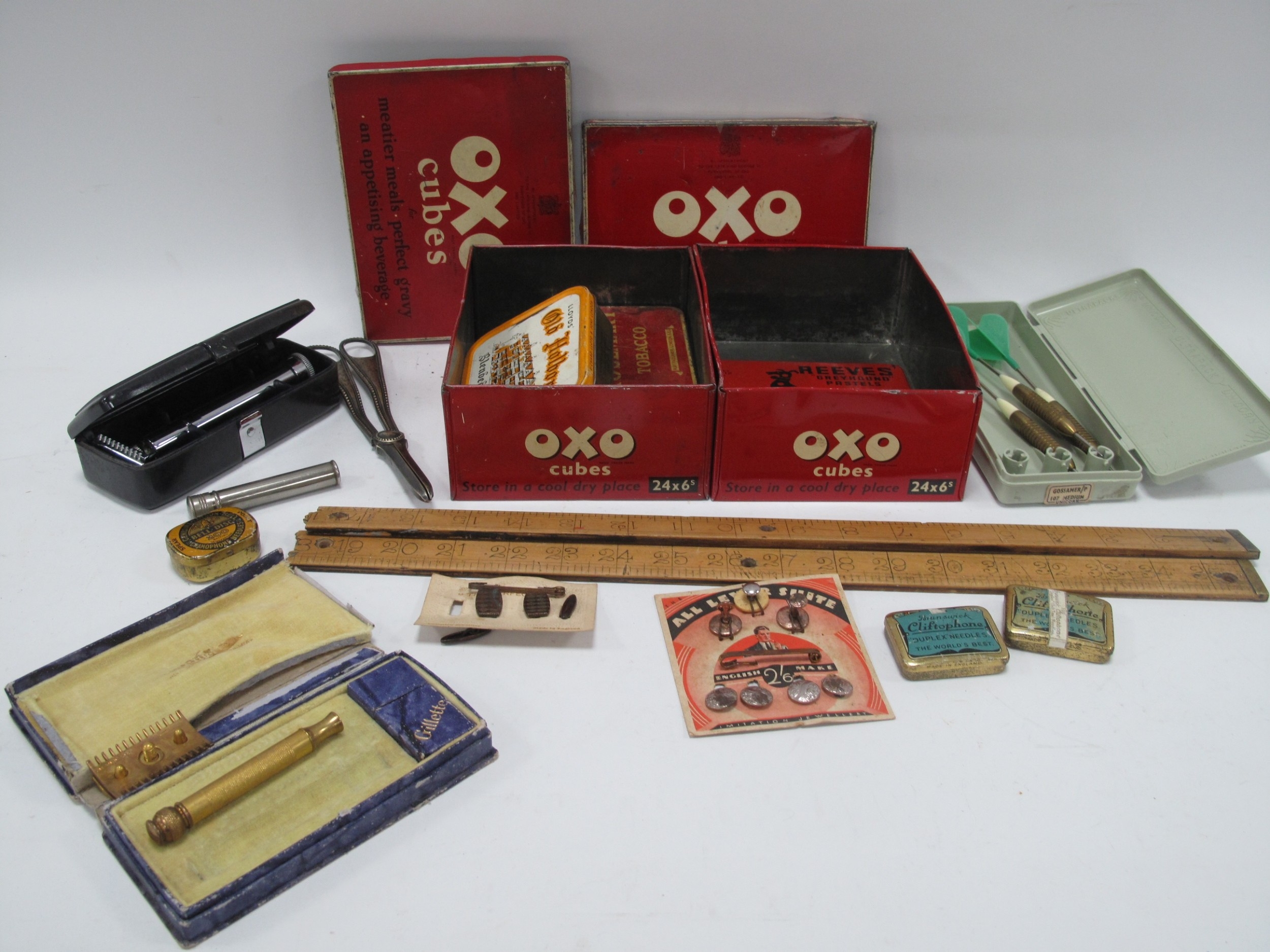 Tins, razors, grape scissors, record needles, cufflinks, darts, etc:- One Tray.