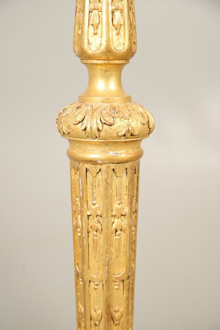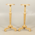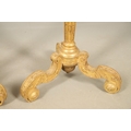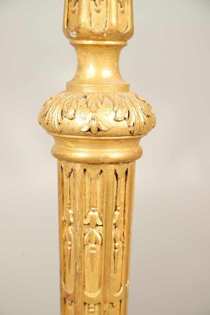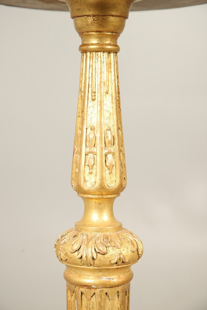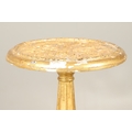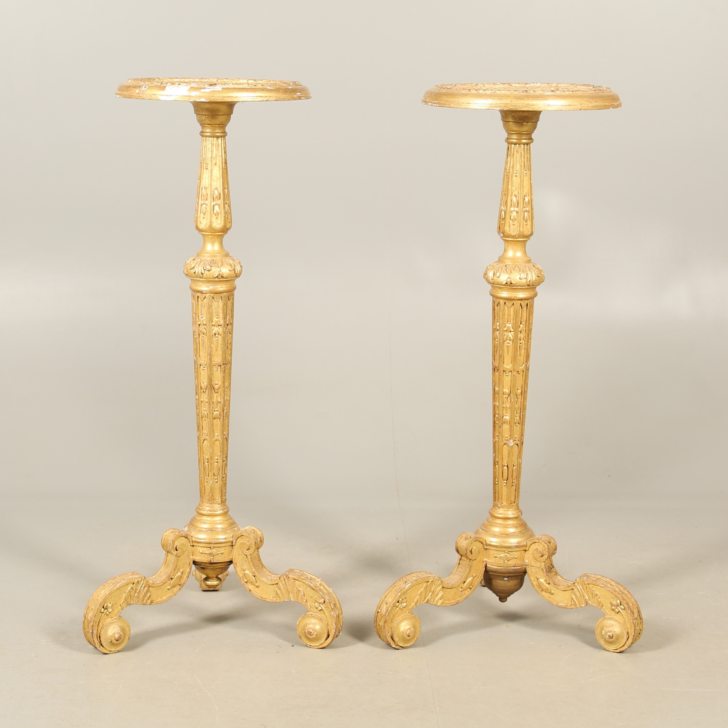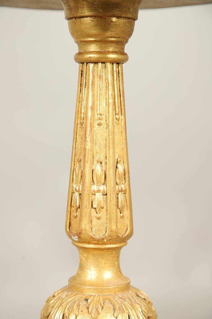 A PAIR OF FRENCH CARVED GILTWOOD JARDINIERE STANDS. 19th century, each with carved and gesso foliate motifs to a tapering column and scroll supports, height 102cm, diameter 35cm.