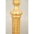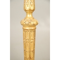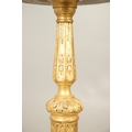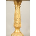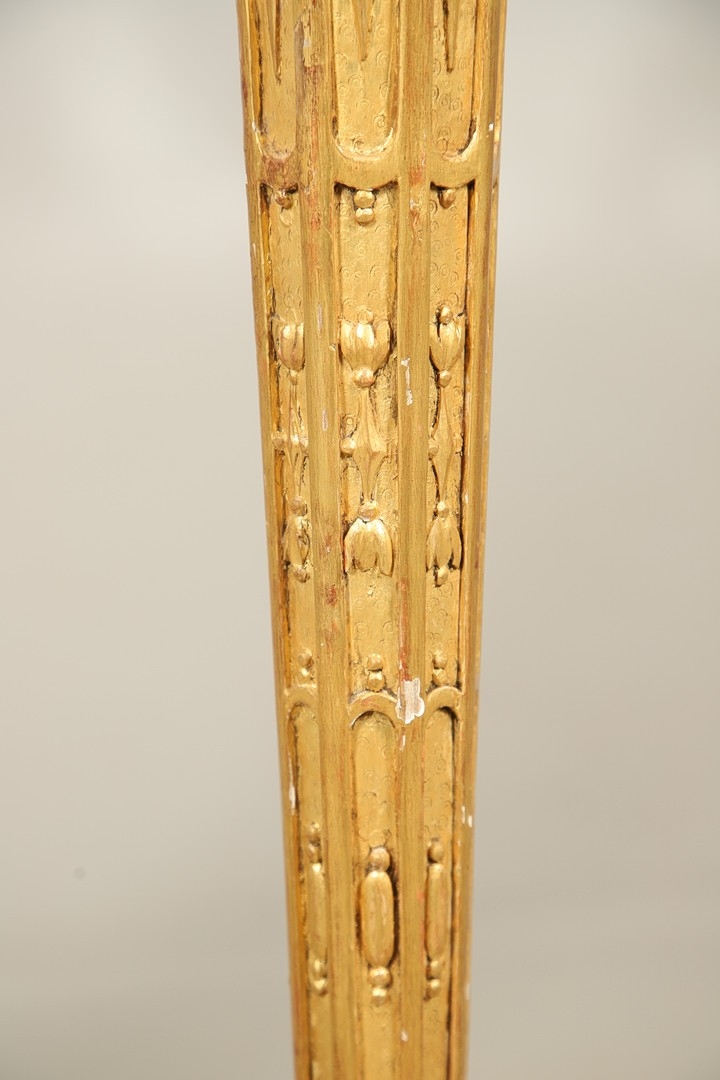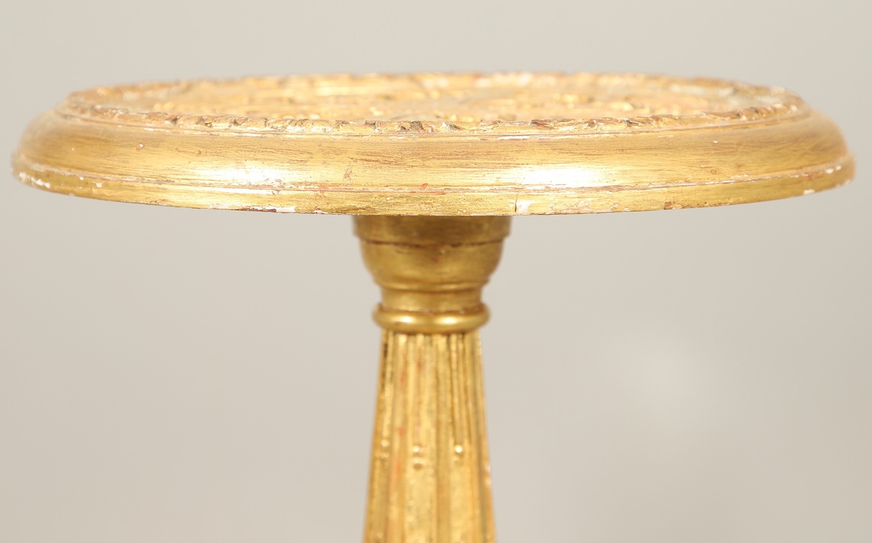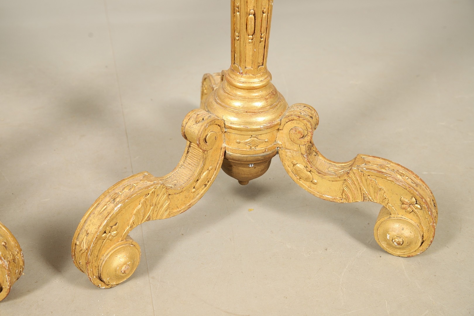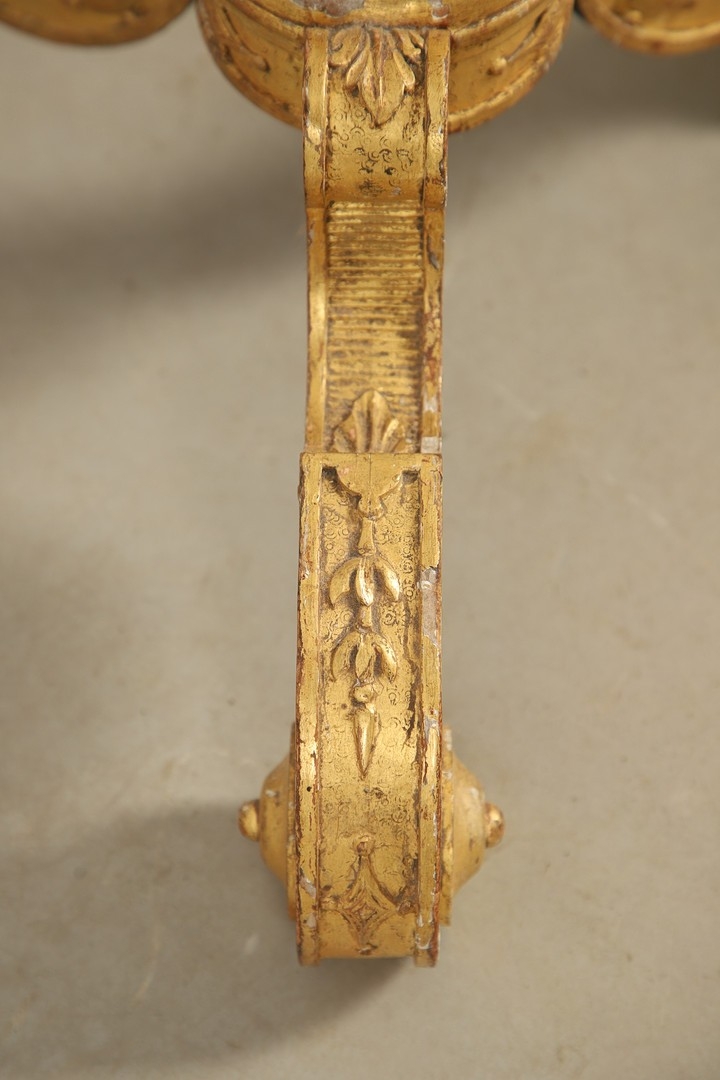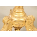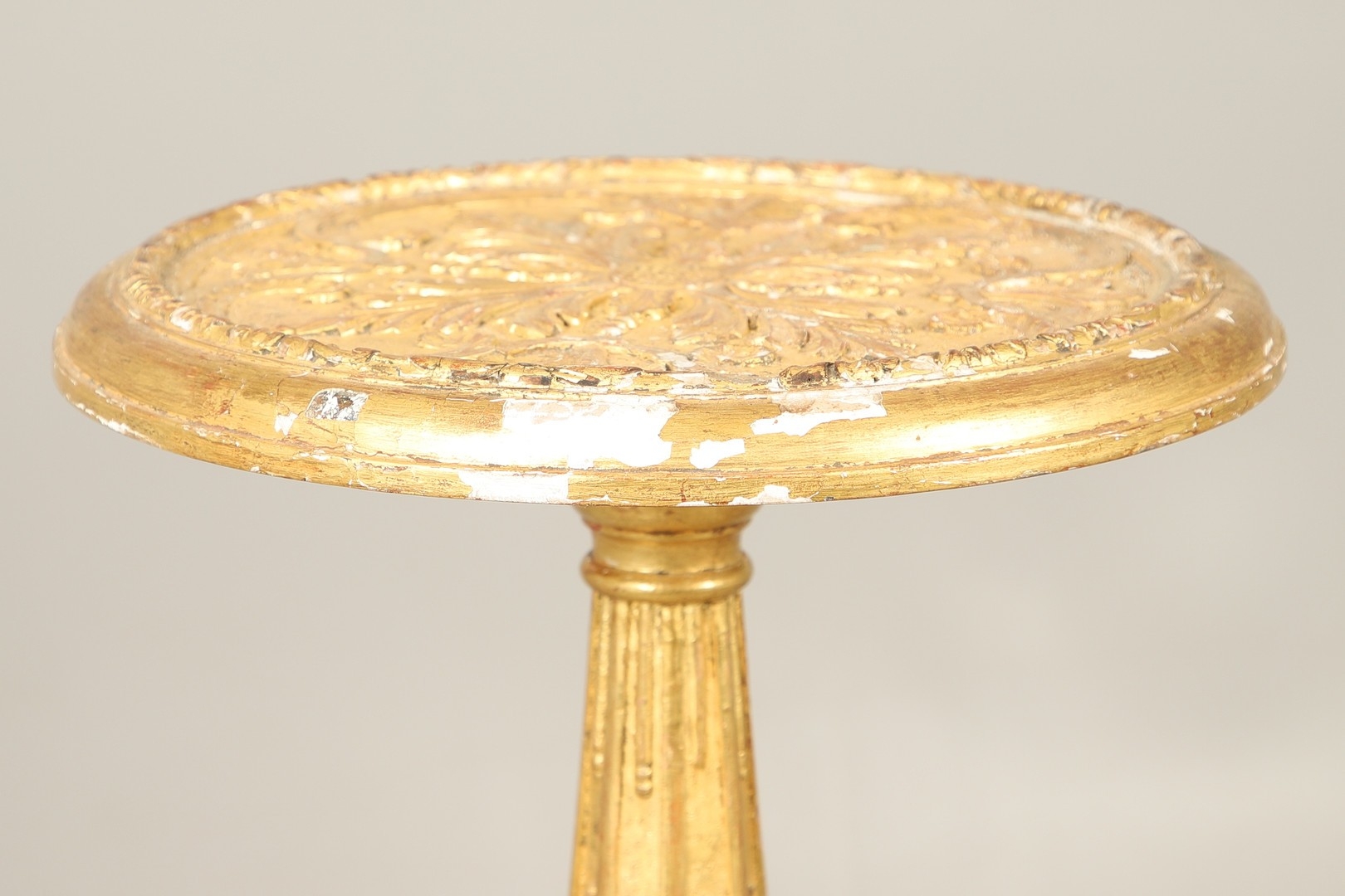 A PAIR OF FRENCH CARVED GILTWOOD JARDINIERE STANDS. 19th century, each with carved and gesso foliate motifs to a tapering column and scroll supports, height 102cm, diameter 35cm.